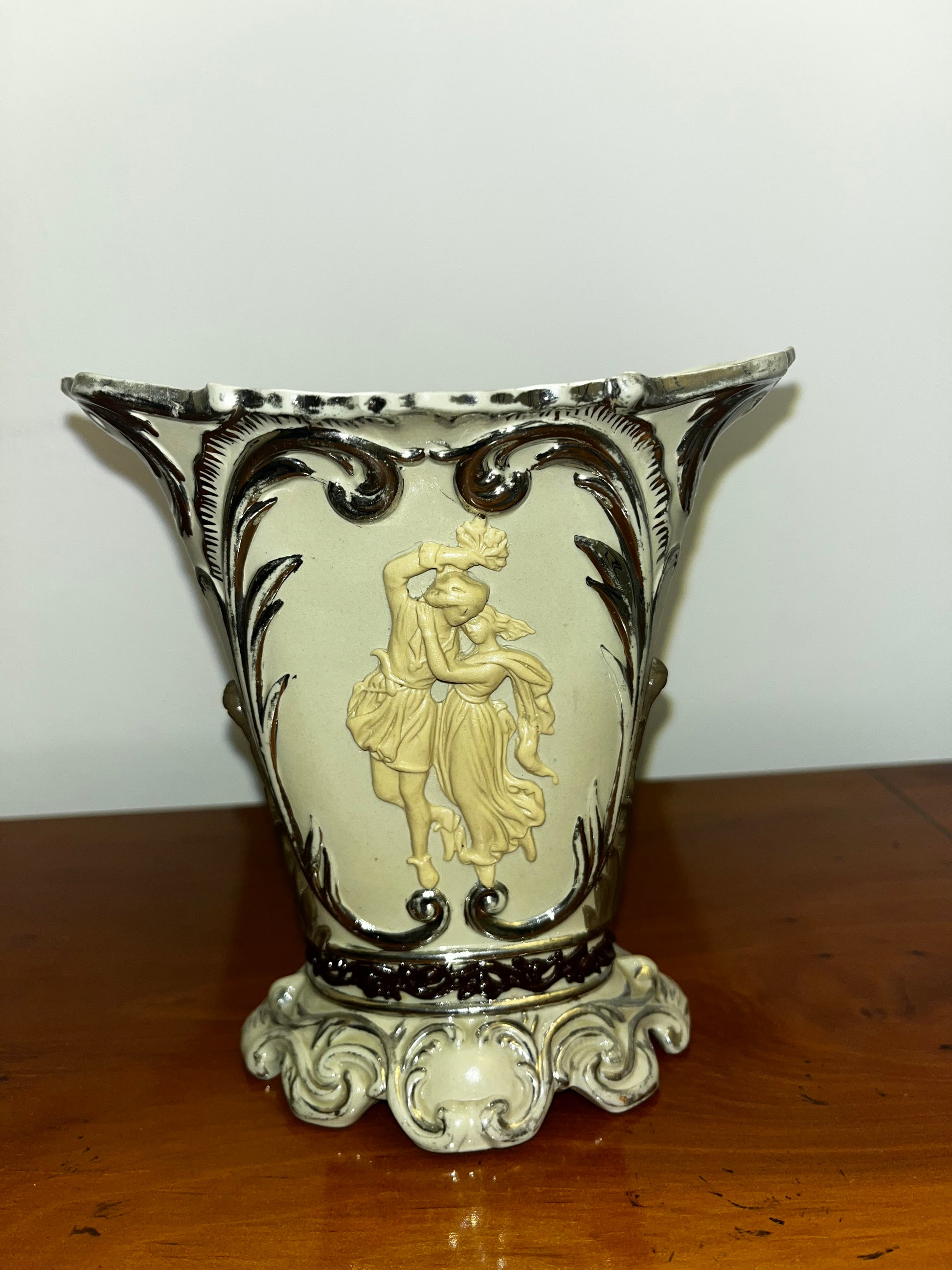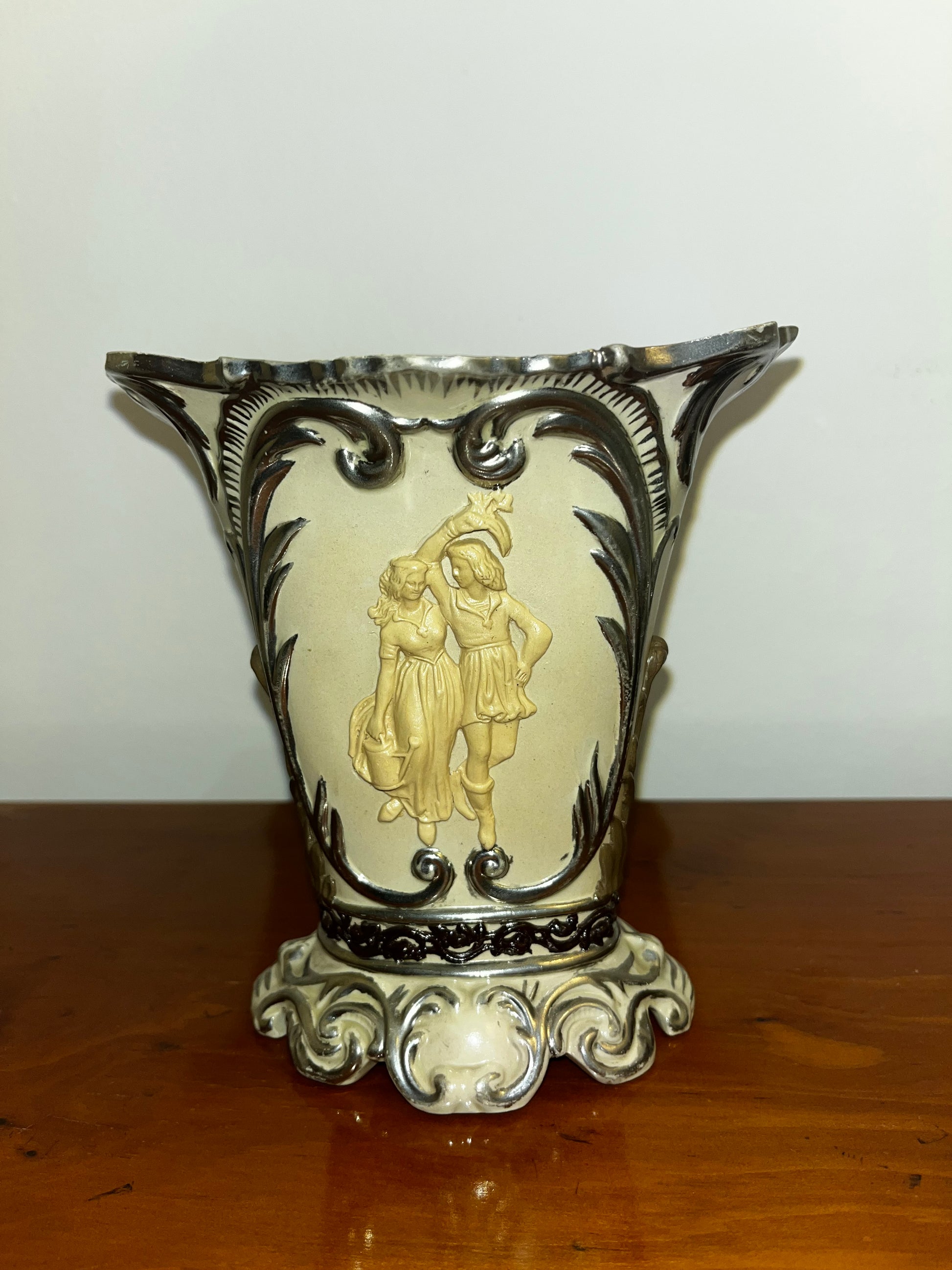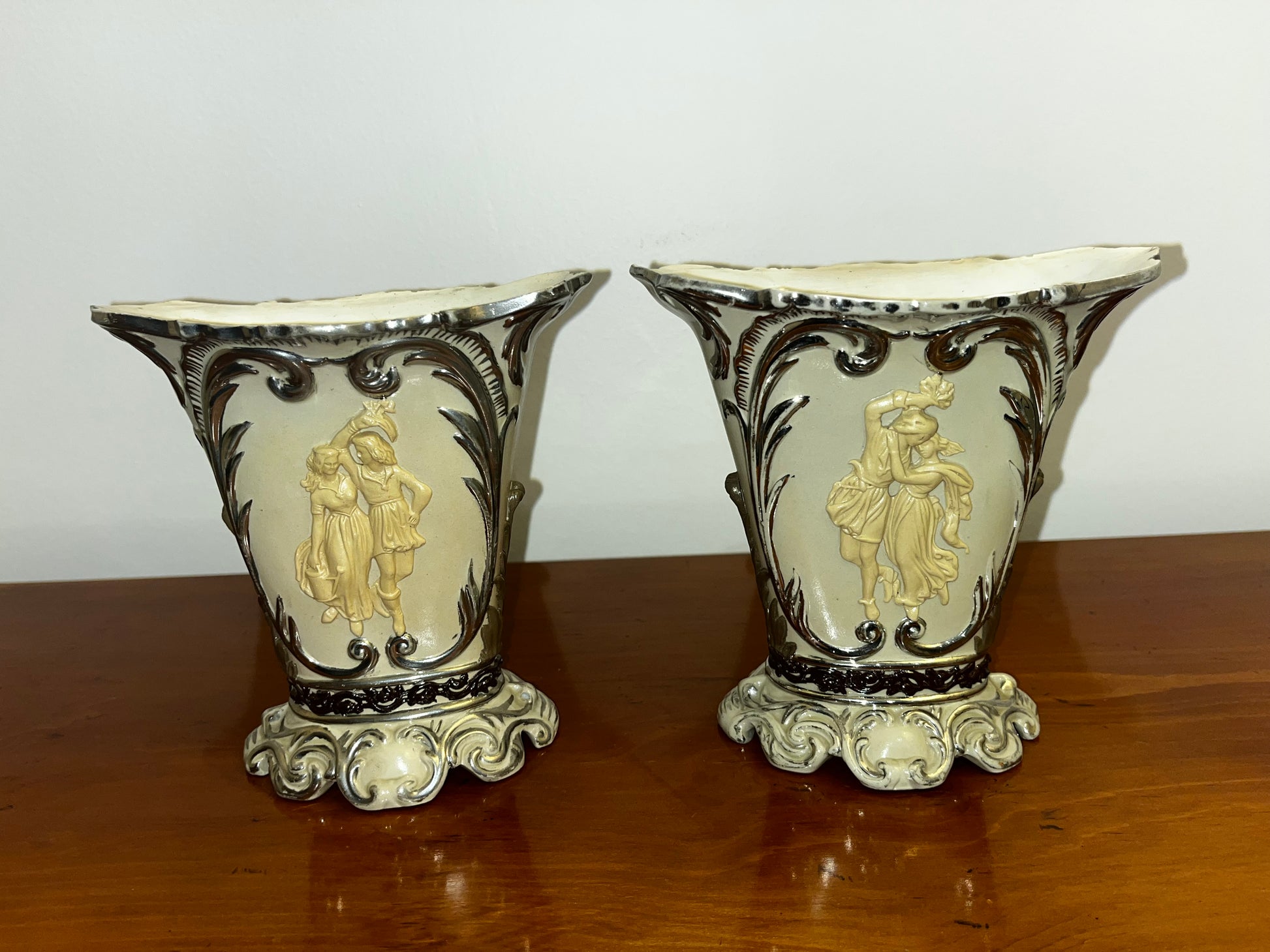 Ces pièces sont réalisées en grès gris avec un intérieur en émail blanc, des décorations en relief appliquées, et des accents en or ou platine. Ce modèle se distingue par des figures en relief de style antique, vêtues à la manière grecque ou romaine, sur une base de grès brun foncé. La qualité du travail est exceptionnelle, Mettlach étant réputé pour une maîtrise inégalée dans la production de céramiques.