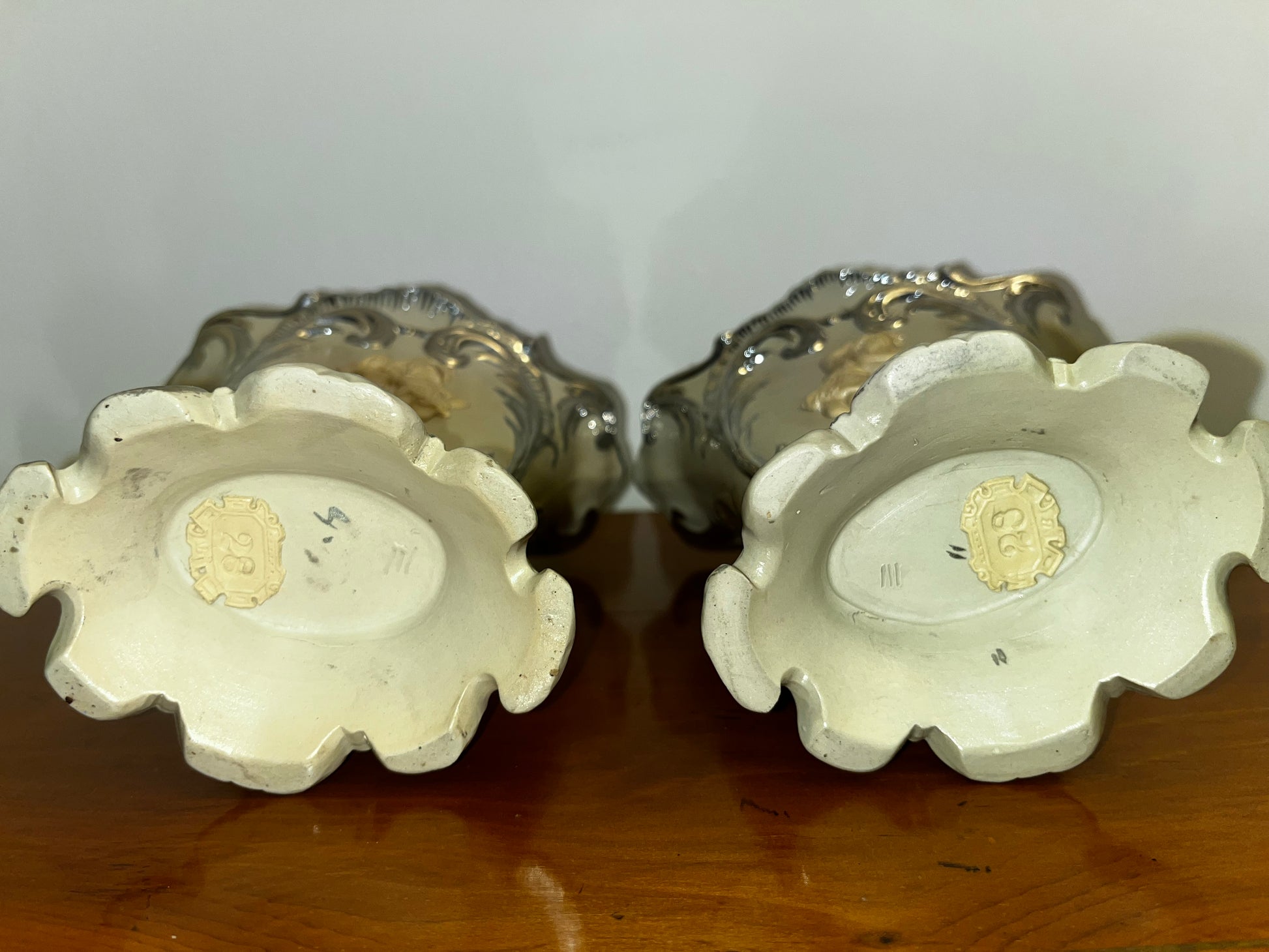 Les vases portent le plus ancien marqueur de Villeroy & Boch, un blason avec des aigles sur les côtés et des médailles d’exposition, utilisé entre 1844 et 1860. Ce modèle figure dans le Mettlach Book de Gary Kirsner, section “Early Wares” (p. 377), sous le numéro “2u”. Ces pièces anciennes, fabriquées en plus petites quantités et souvent endommagées au fil du temps, sont bien plus rares que celles produites à la fin des années 1890 - 1900.