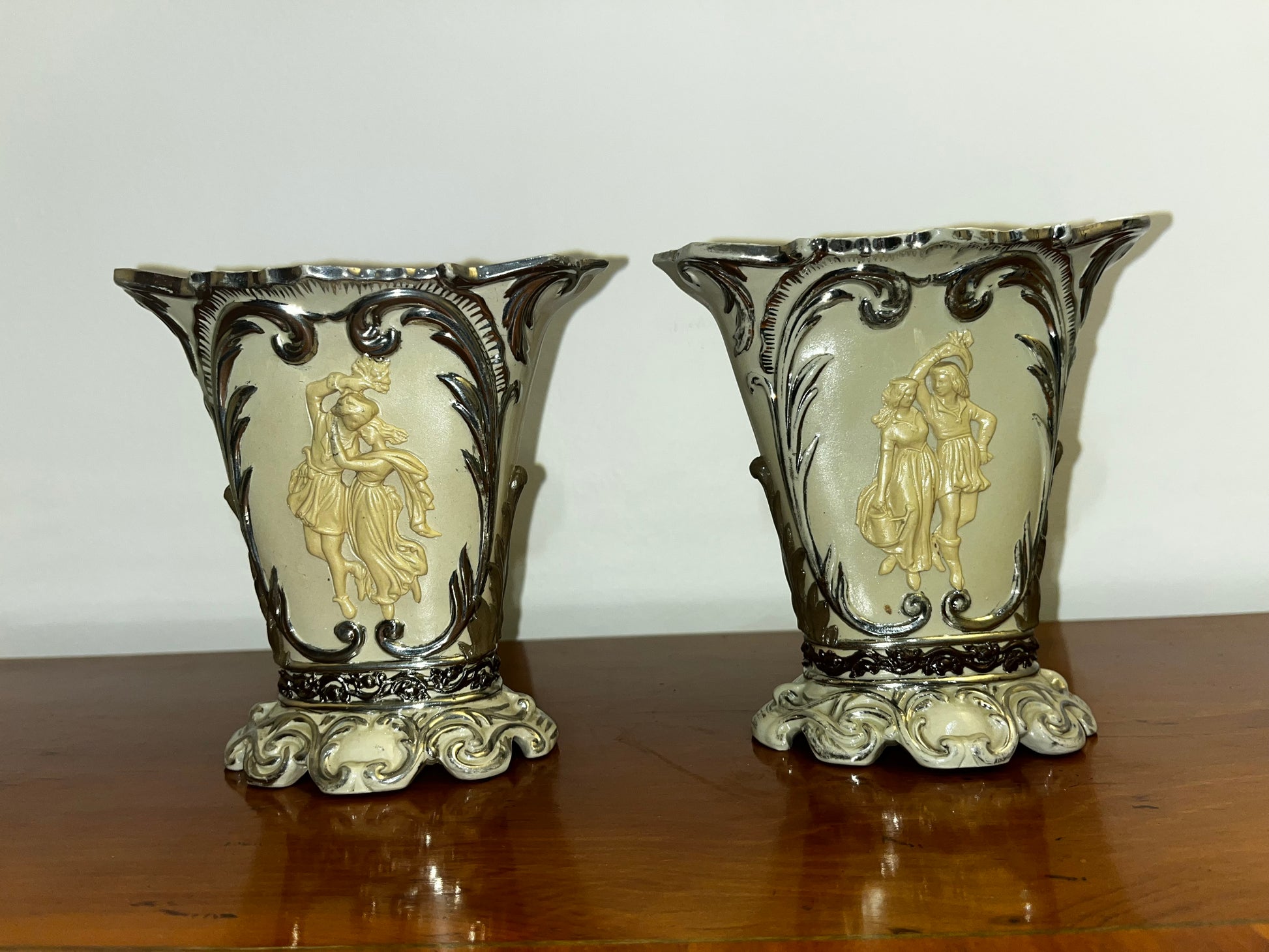 Paire d’anciens vases/bechers Mettlach Villeroy & Boch avec accents en platine, vers 1850