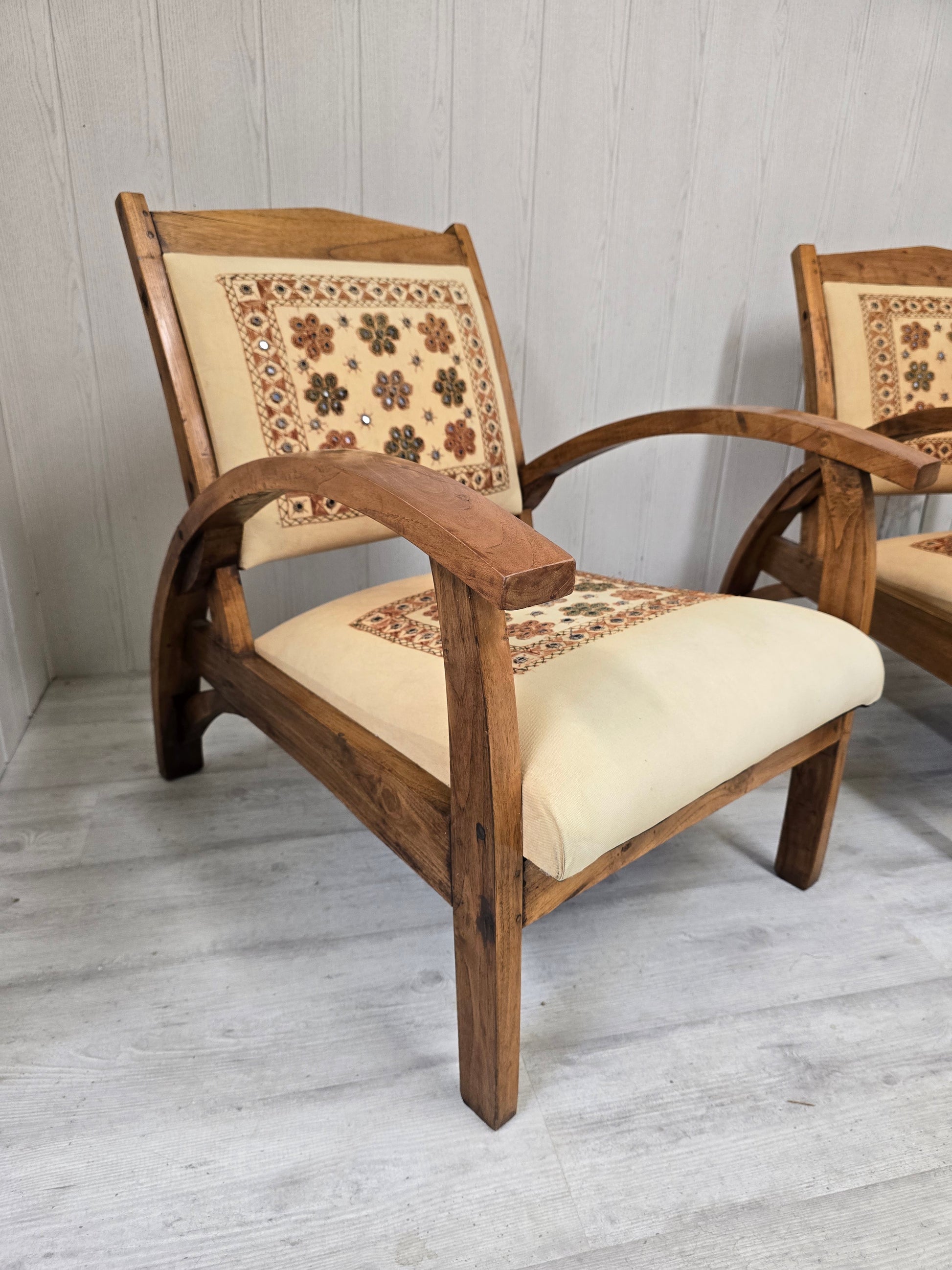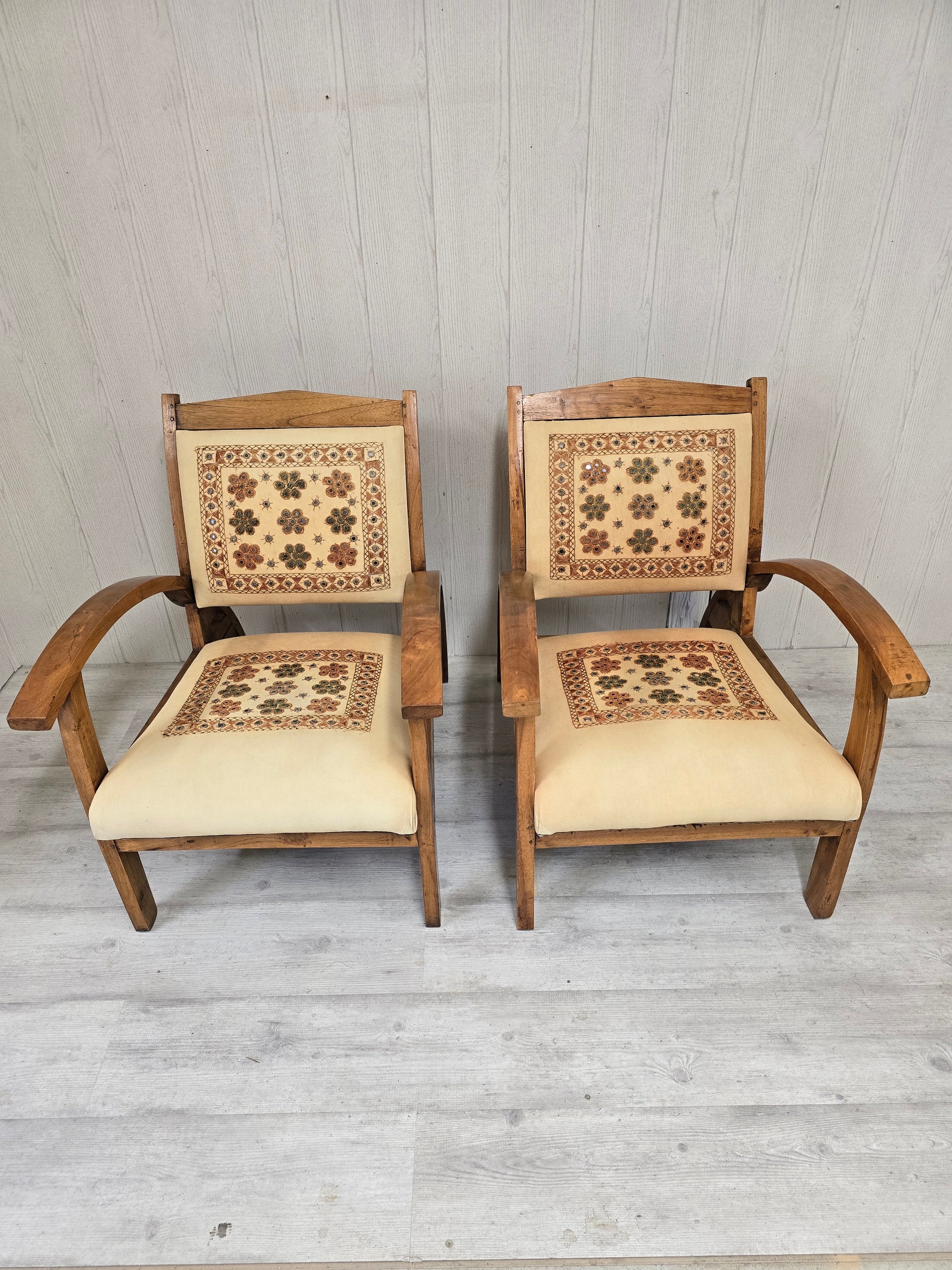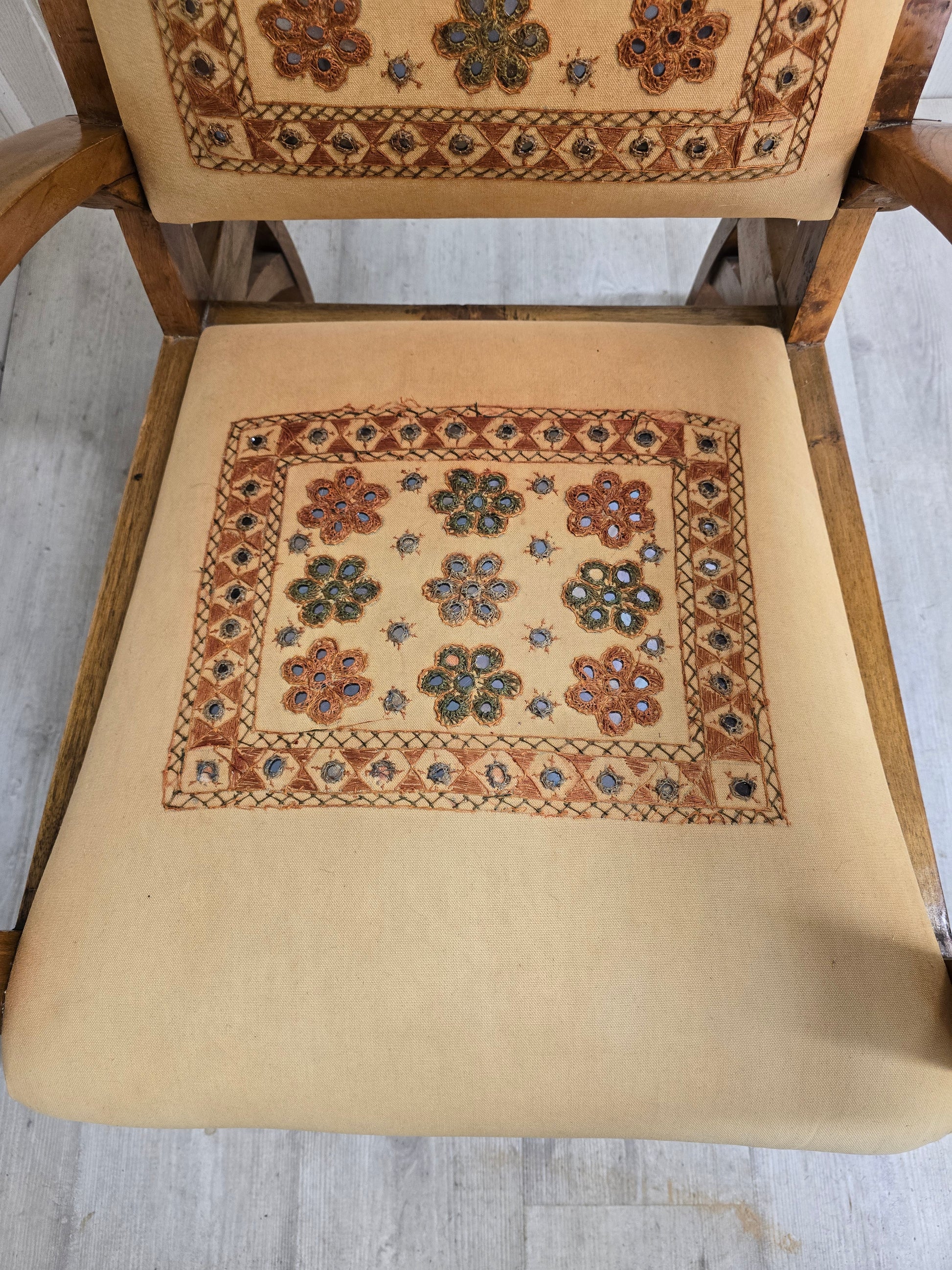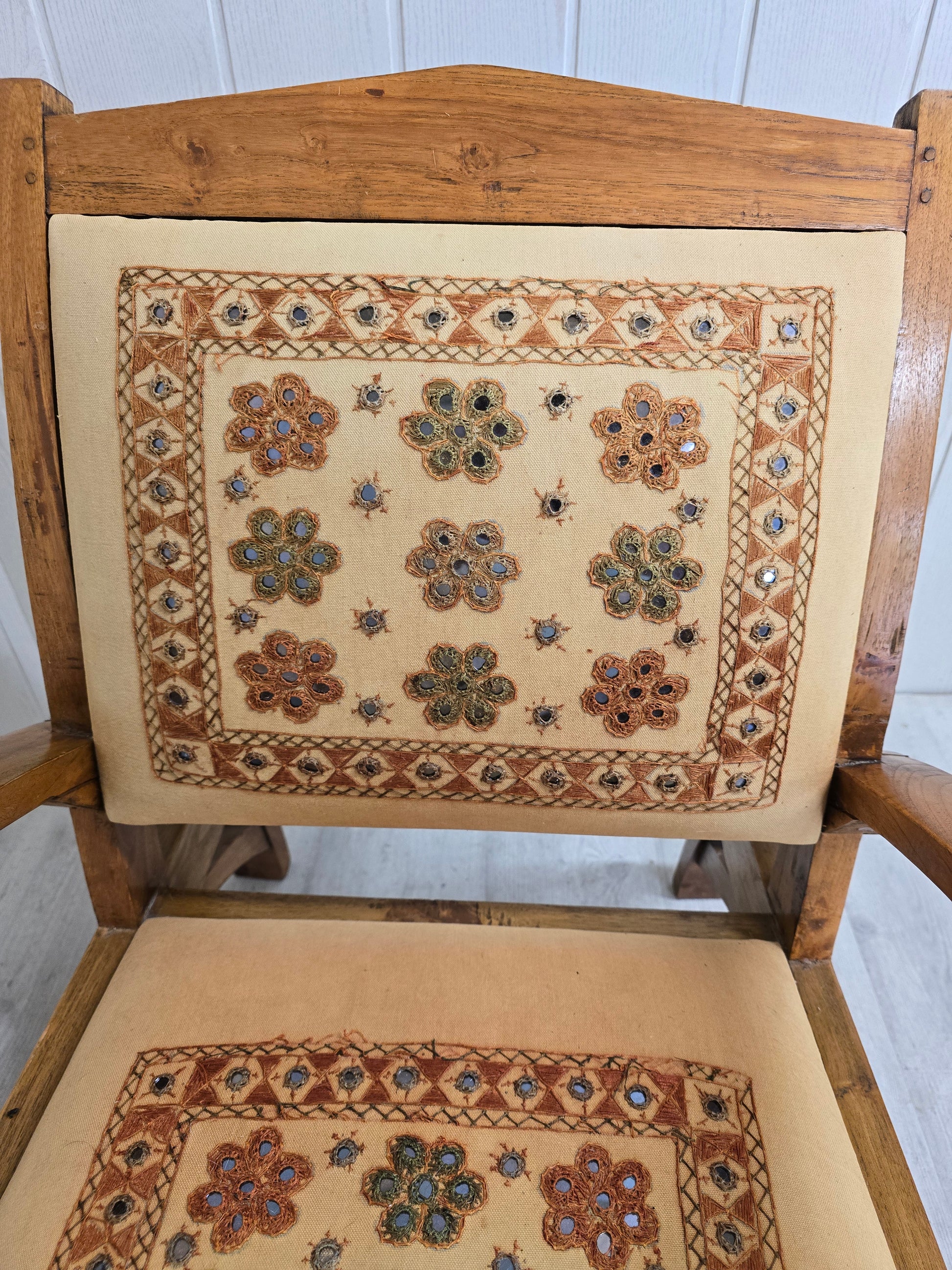 Apportez une touche d'authenticité et de charme artisanal à votre intérieur avec cette superbe paire de fauteuils vintage. La structure en bois massif, aux courbes élégantes, est sublimée par une assise et un dossier recouverts d’un tissu beige orné d’une broderie florale traditionnelle aux teintes chaudes (ocre, brun, vert olive).