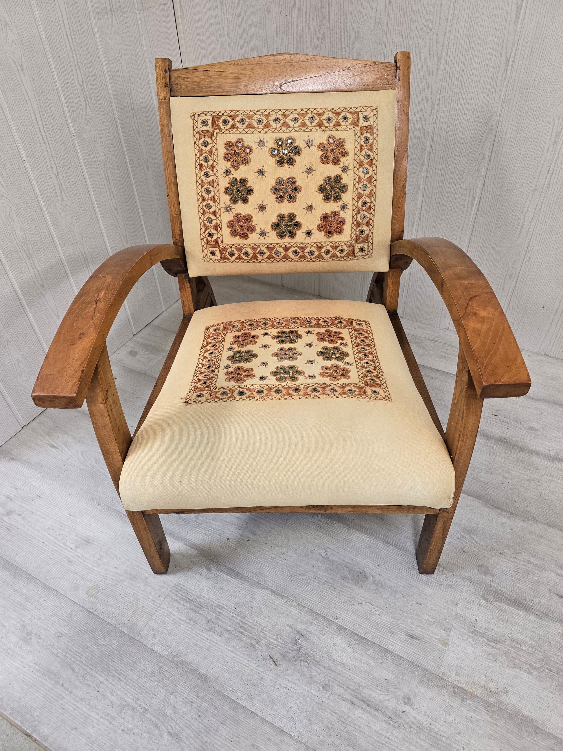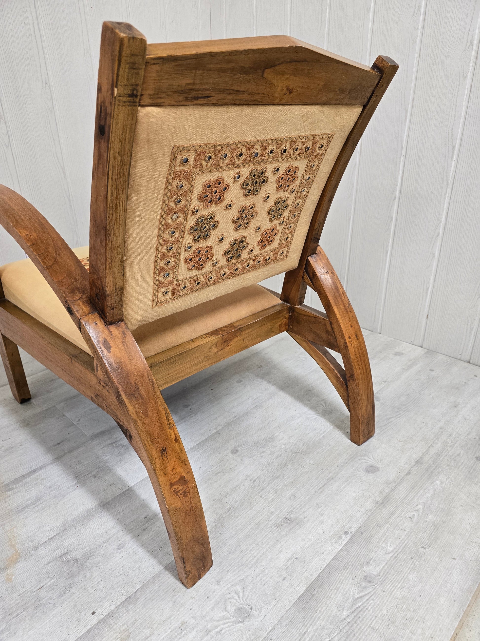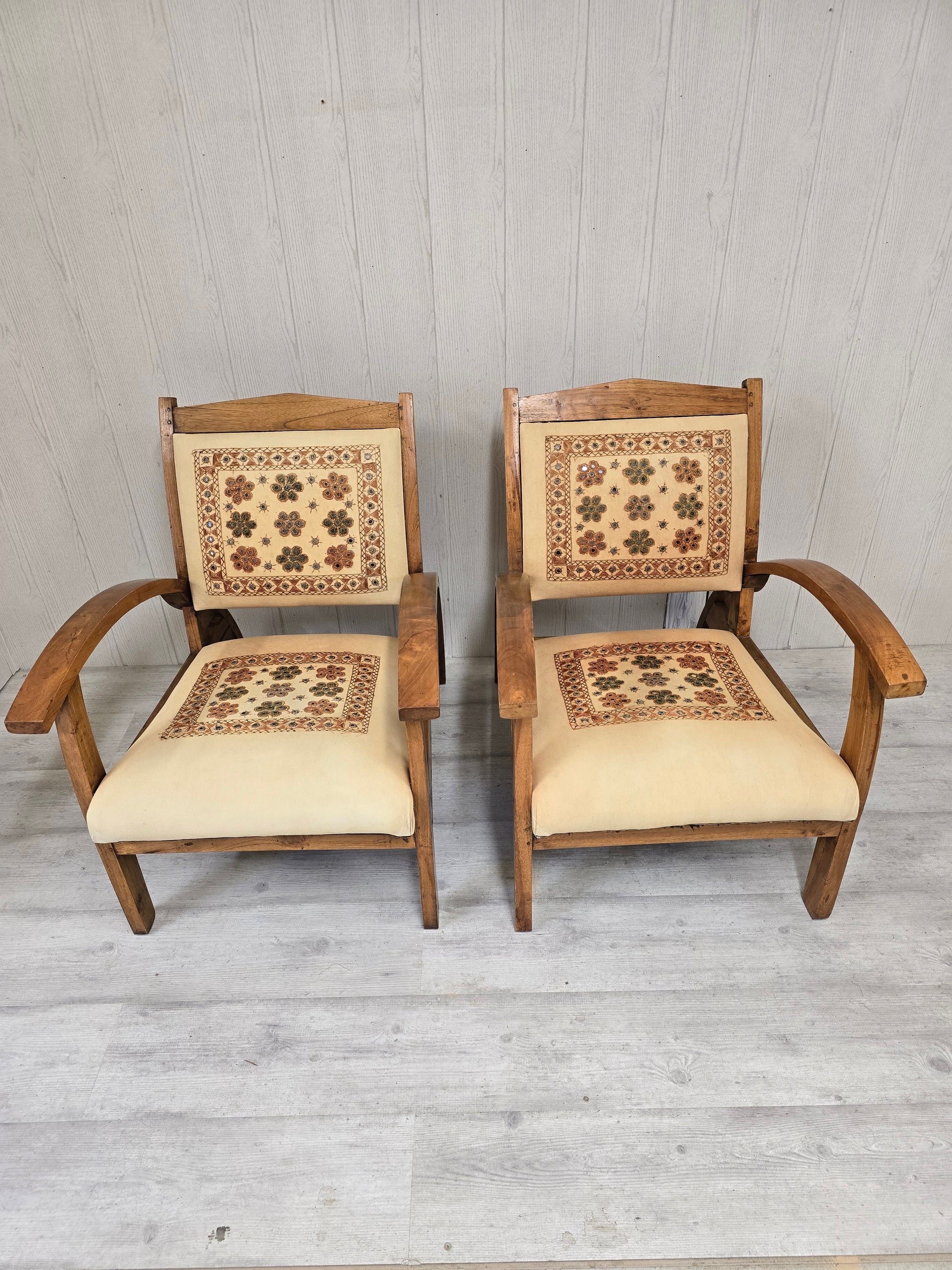 Apportez une touche d'authenticité et de charme artisanal à votre intérieur avec cette superbe paire de fauteuils vintage. La structure en bois massif, aux courbes élégantes, est sublimée par une assise et un dossier recouverts d’un tissu beige orné d’une broderie florale traditionnelle aux teintes chaudes (ocre, brun, vert olive).