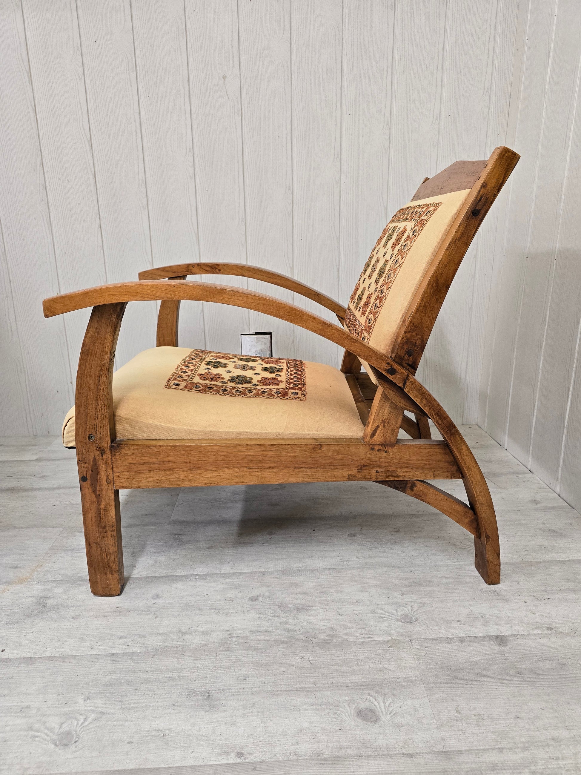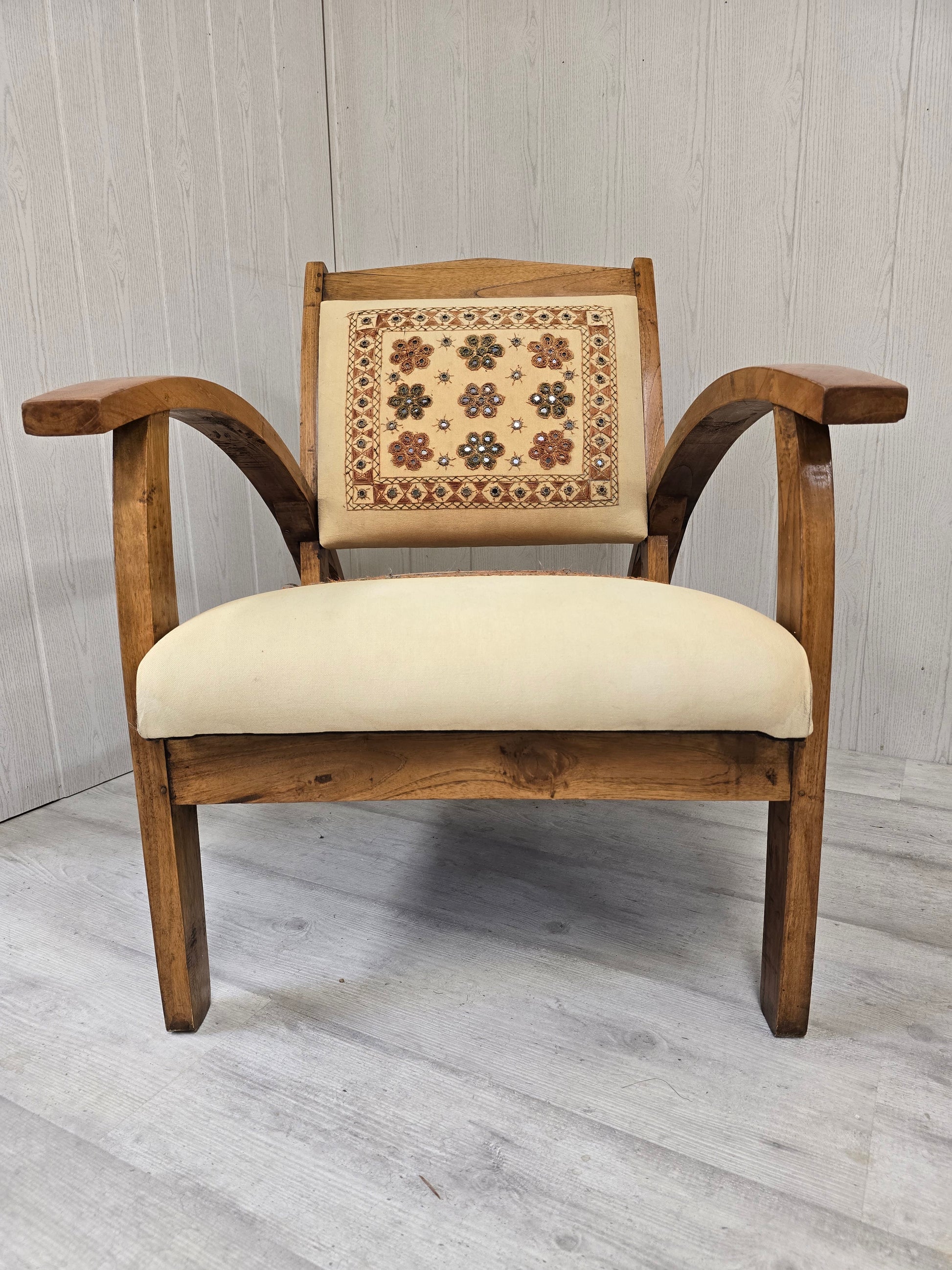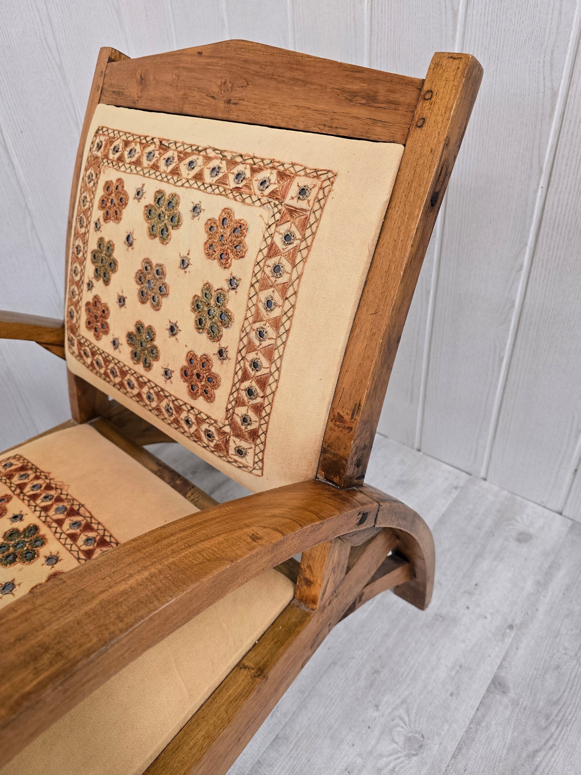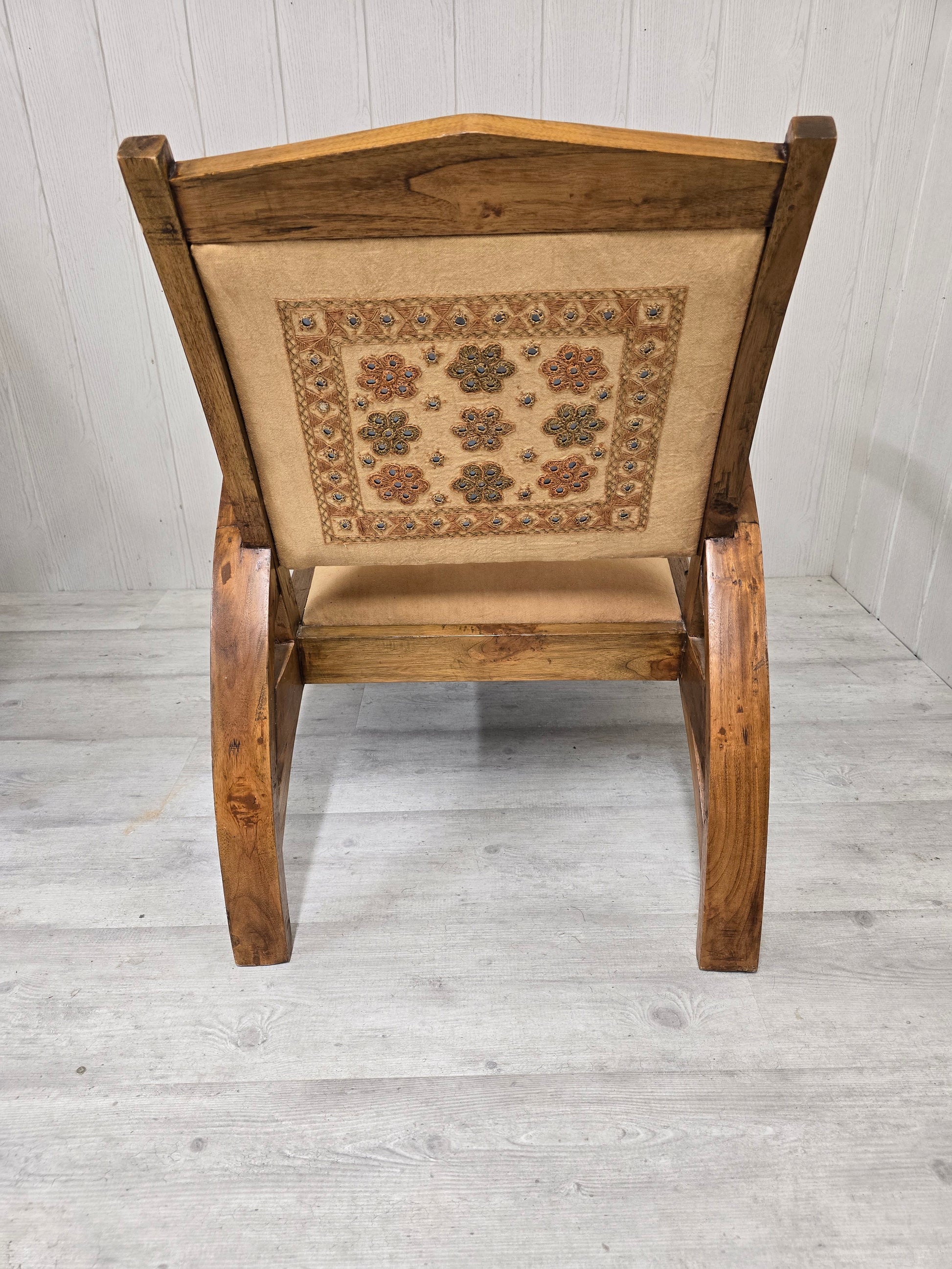 Apportez une touche d'authenticité et de charme artisanal à votre intérieur avec cette superbe paire de fauteuils vintage. La structure en bois massif, aux courbes élégantes, est sublimée par une assise et un dossier recouverts d’un tissu beige orné d’une broderie florale traditionnelle aux teintes chaudes (ocre, brun, vert olive).