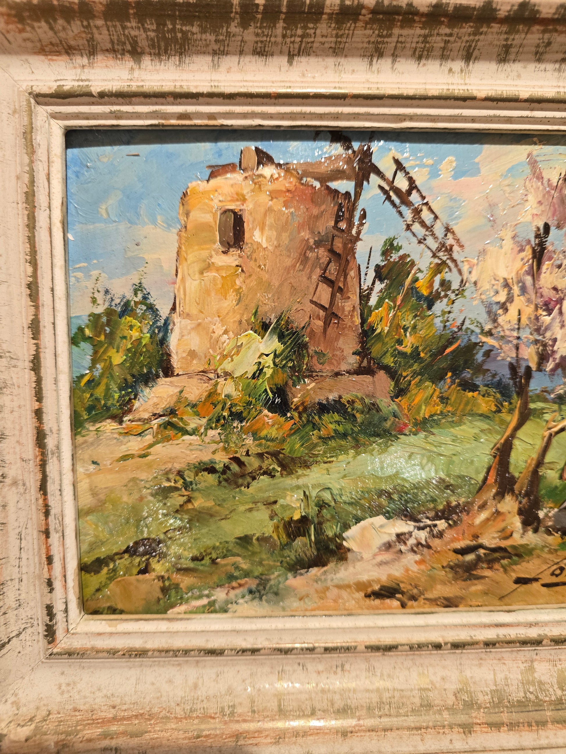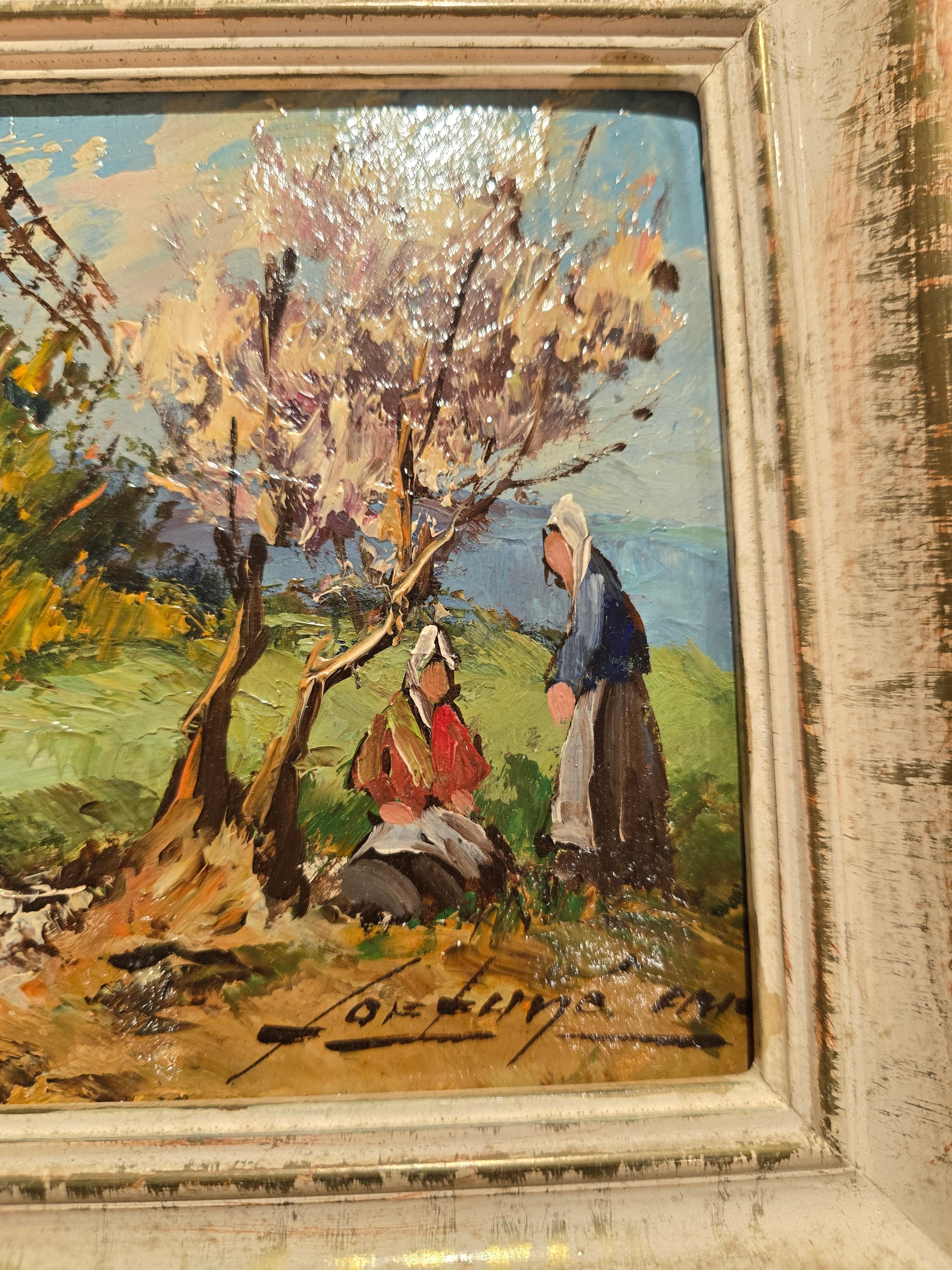 Charmant petit tableau à l’huile signé Fortuné Car, représentant une scène de vie typique de Provence : deux femmes en costume traditionnel au pied d’un arbre en fleurs, près d’un vieux moulin en pierre. L’artiste capture ici toute la chaleur et la lumière du sud, avec une touche vive et expressive.