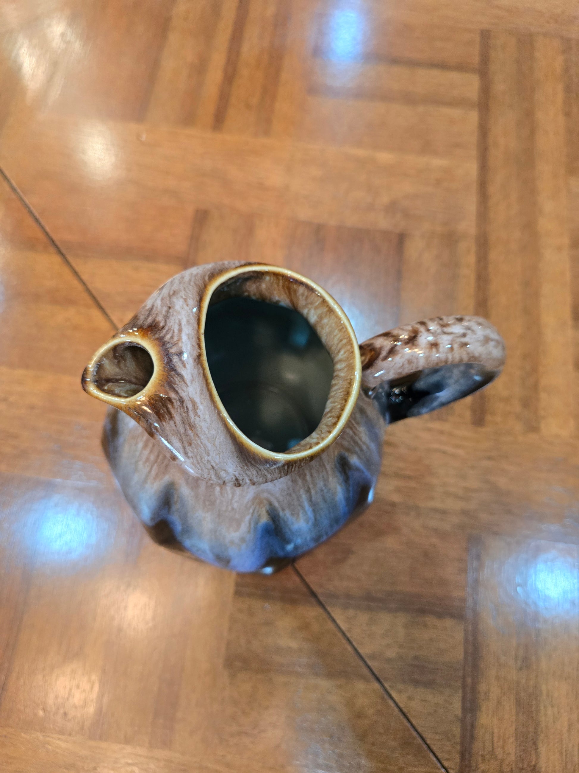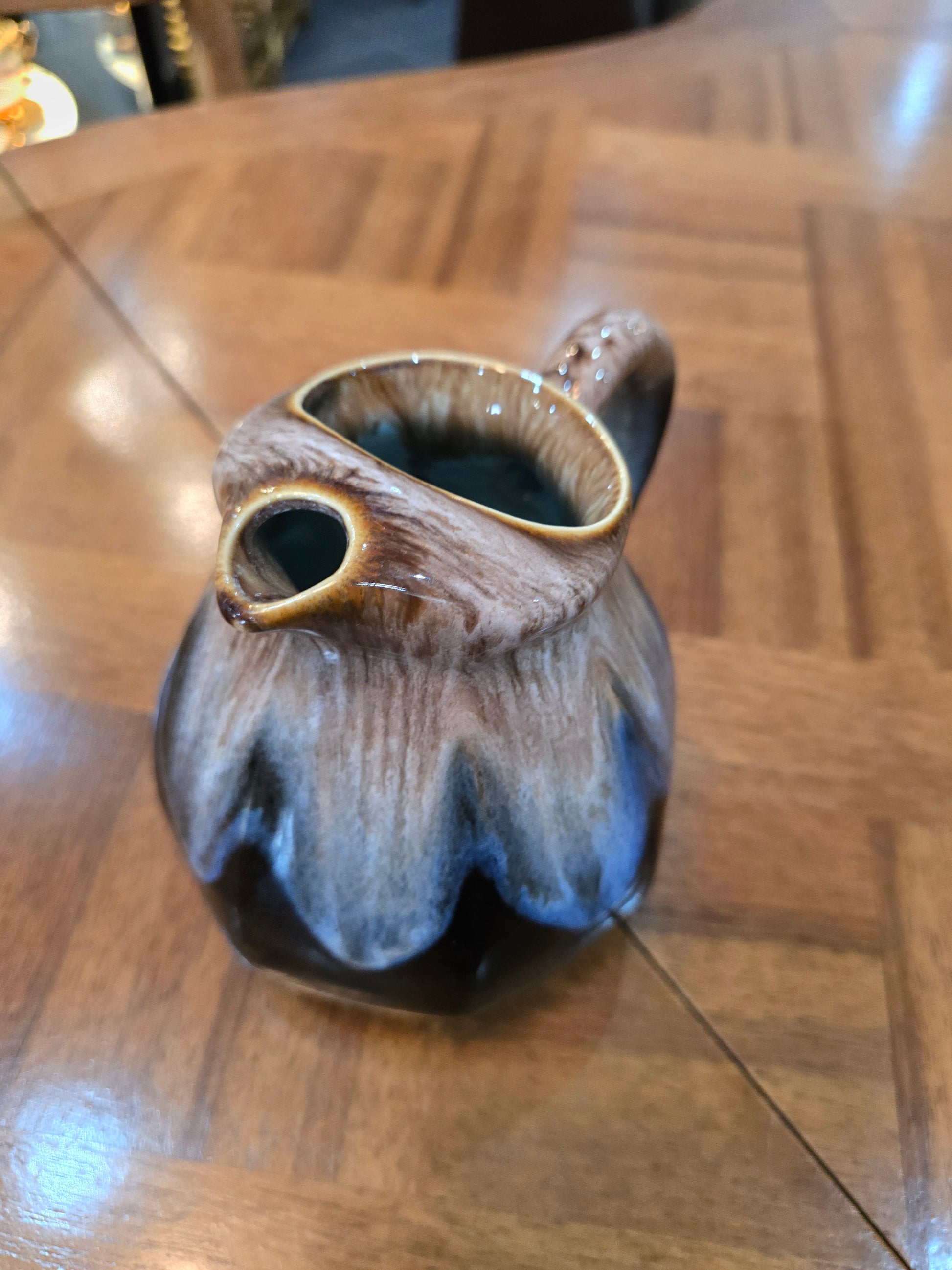 À l’intérieur, l’émail plus lisse contraste avec l’aspect texturé de l’extérieur. Ce pichet peut être utilisé comme vase, verseuse décorative ou simplement exposé comme objet sculptural, parfait pour une ambiance vintage, wabi-sabi ou bohème.