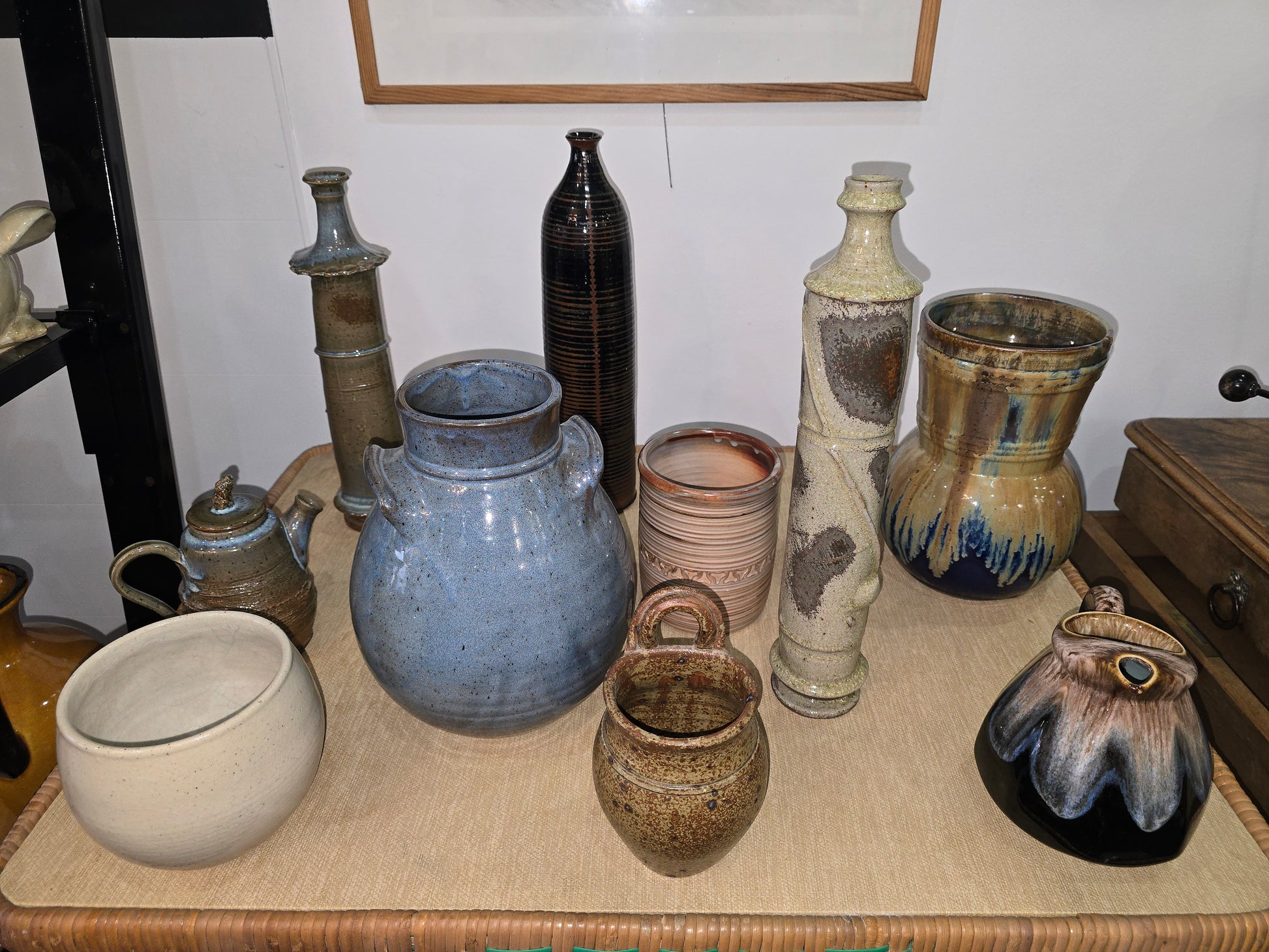 L’émail présente un remarquable travail de coulures, mêlant des tons brun chocolat, beige, gris et reflets bleutés, créant un effet presque minéral. La transition entre les émaux est fluide et vivante, chaque pièce révélant des variations uniques liées à la cuisson.
