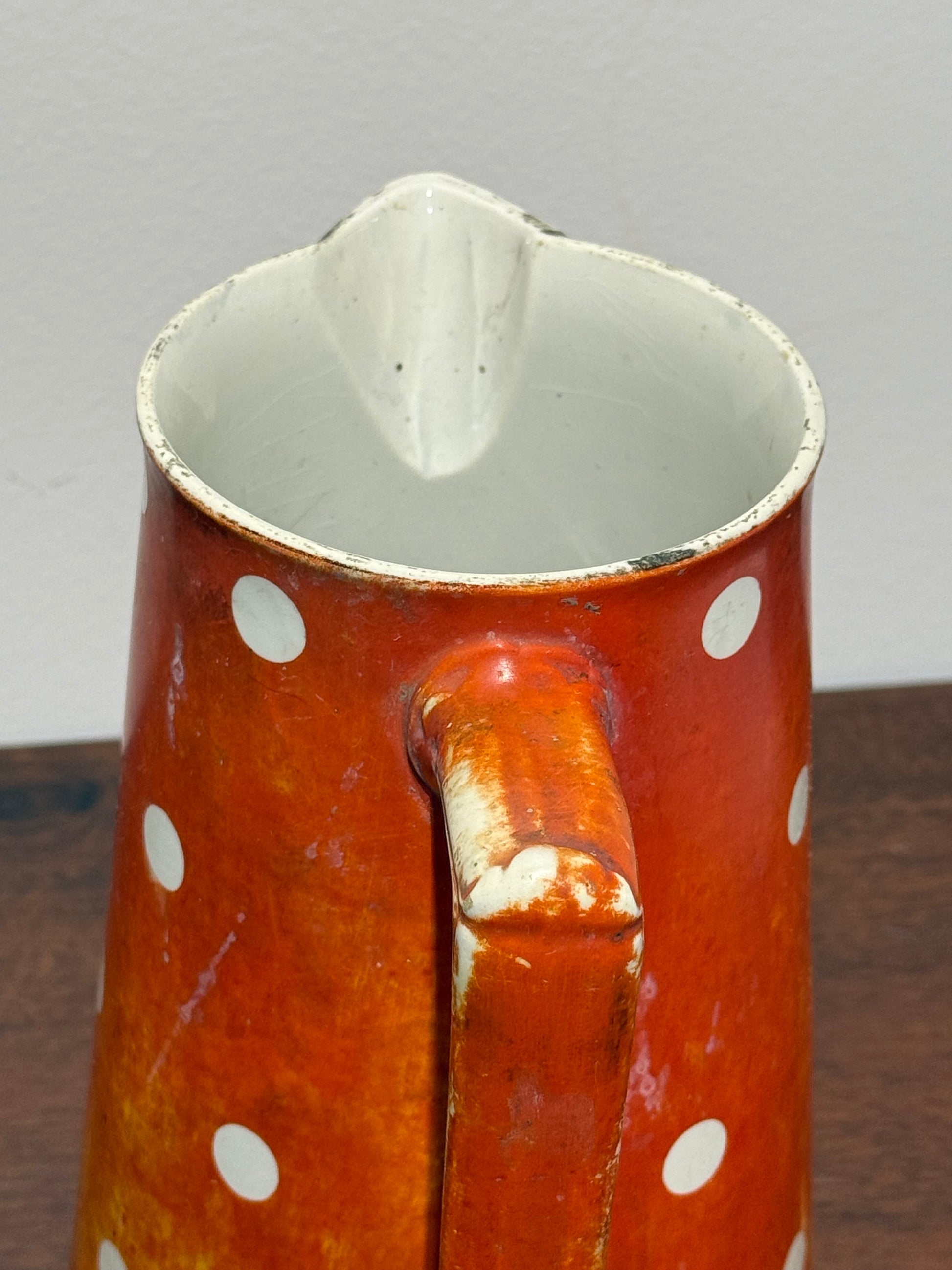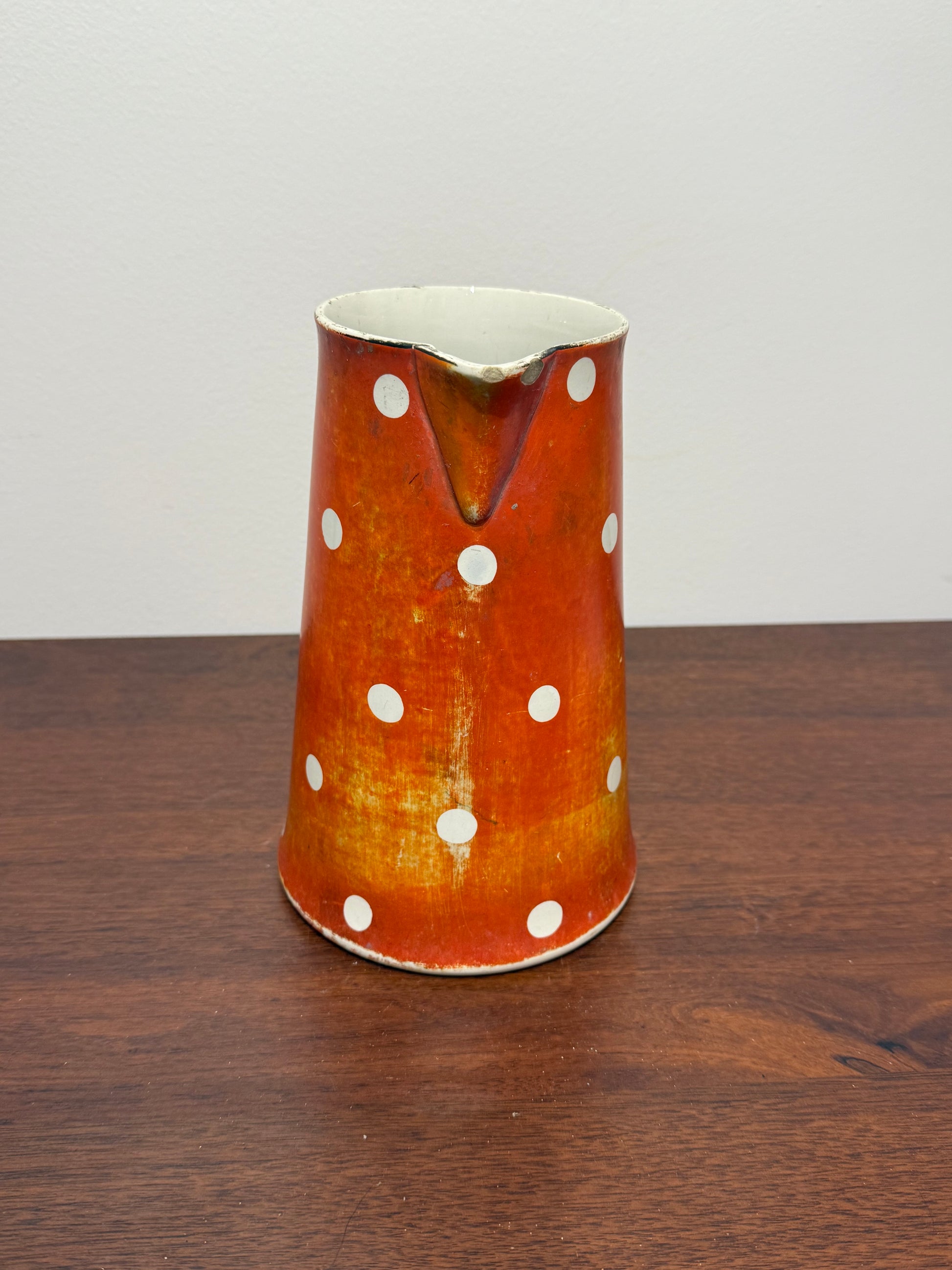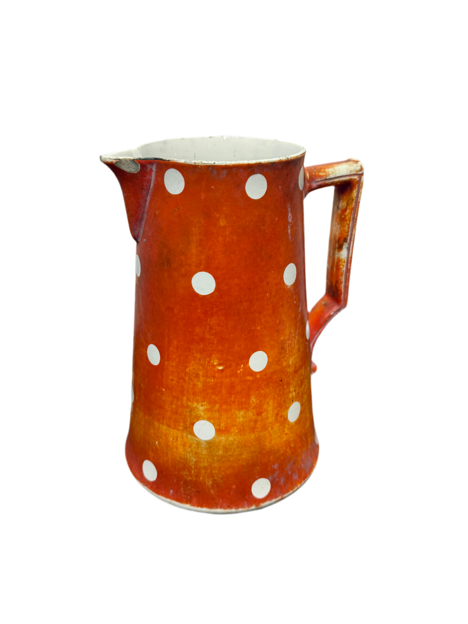 Ce pichet est un véritable témoignage de l’artisanat français du début du XXe siècle. Son motif à pois emblématique et sa couleur vive en font un objet de collection prisé, apportant une touche vintage à toute cuisine ou salle à manger.