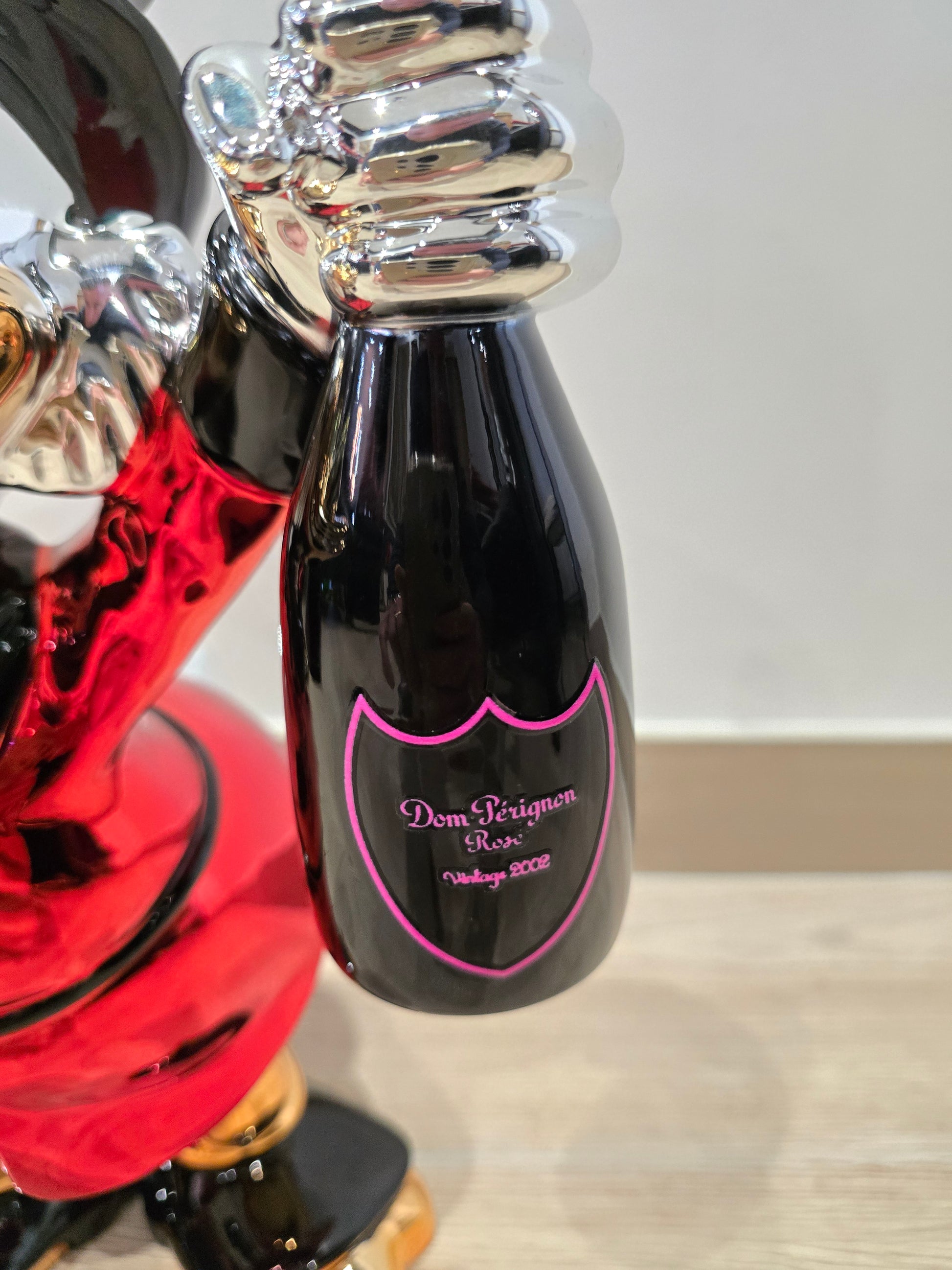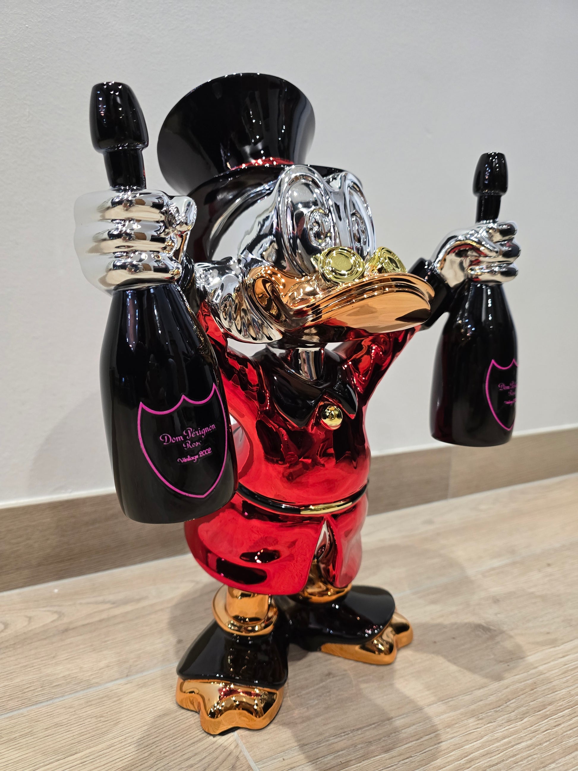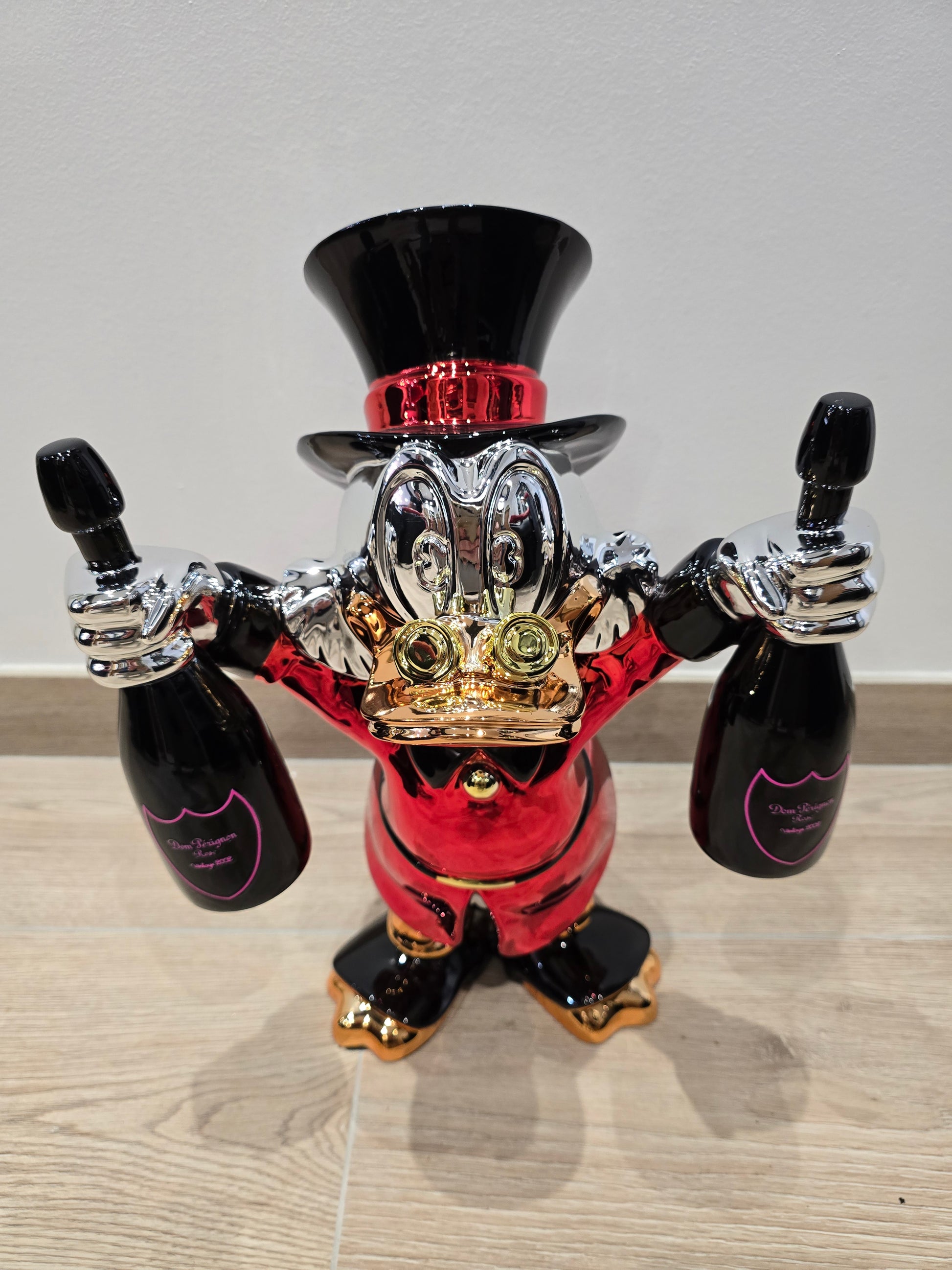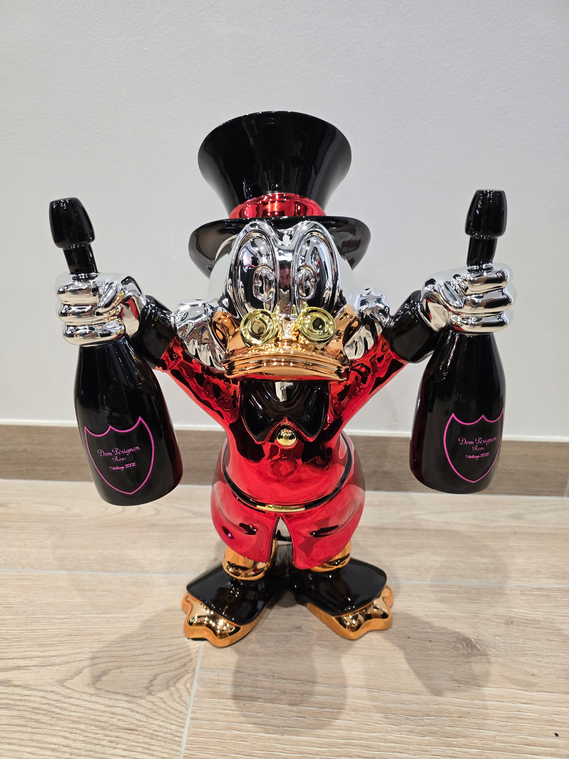 Voici une sculpture unique et décalée représentant Picsou, le célèbre canard milliardaire, revisité dans un style Pop Art ultra-moderne. Habillé en costume rouge métallisé et haut-de-forme noir, il tient fièrement deux bouteilles de Dom Pérignon Rosé Vintage 2002, clin d’œil assumé au luxe et à la fête.