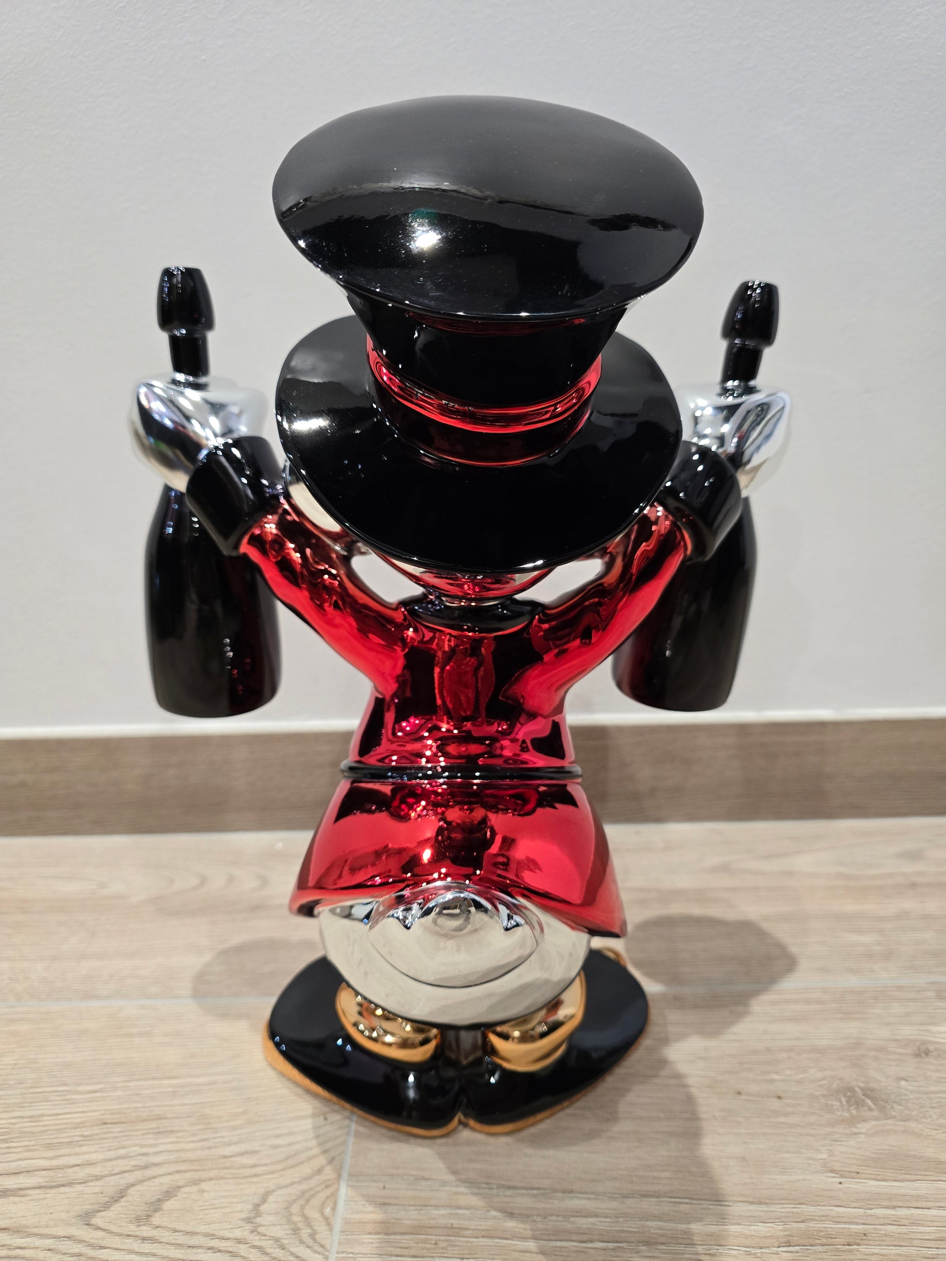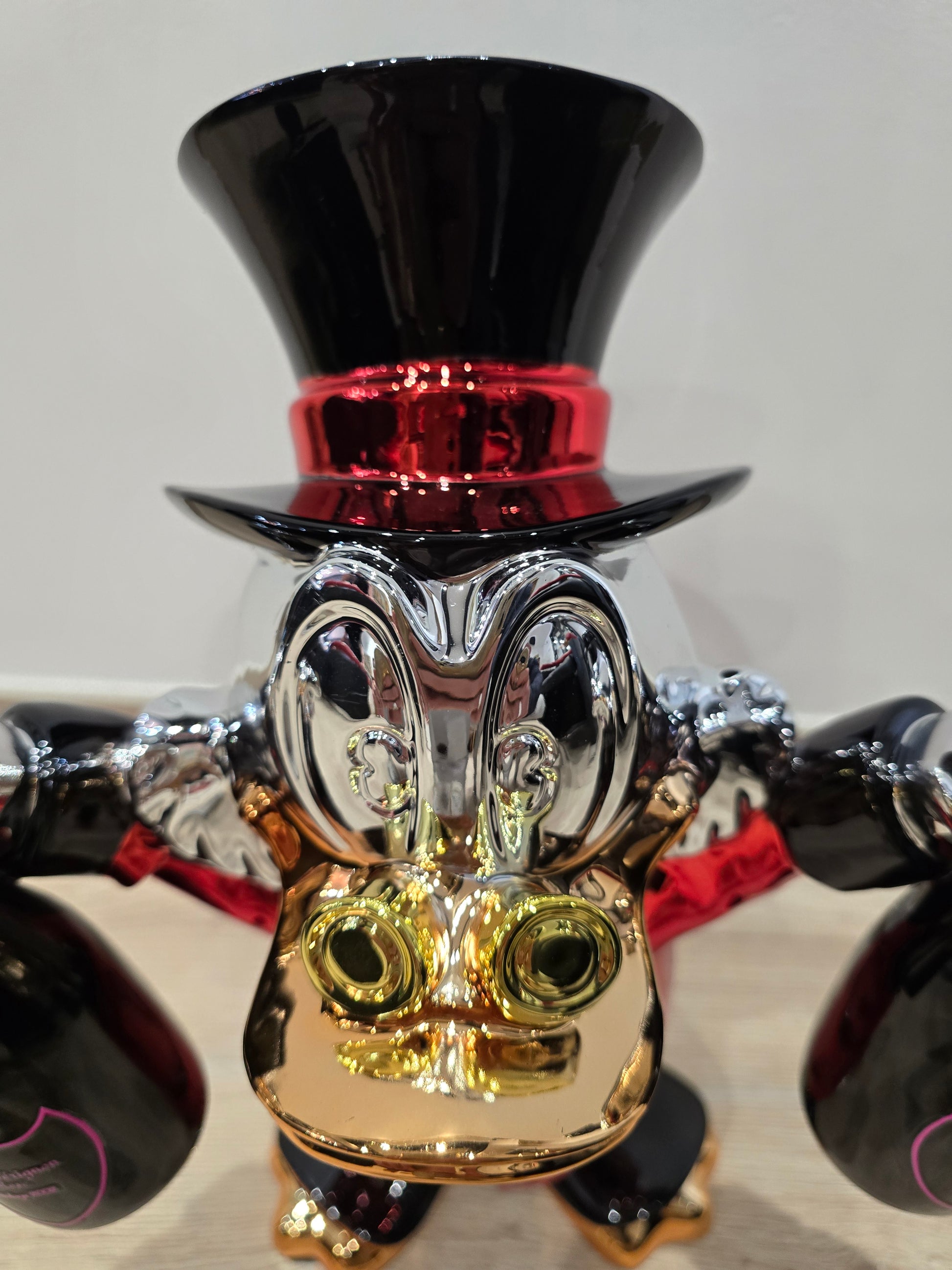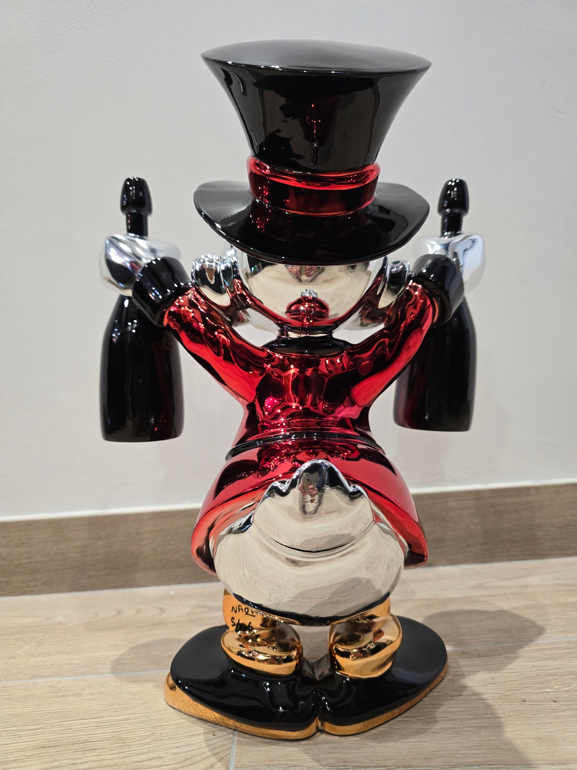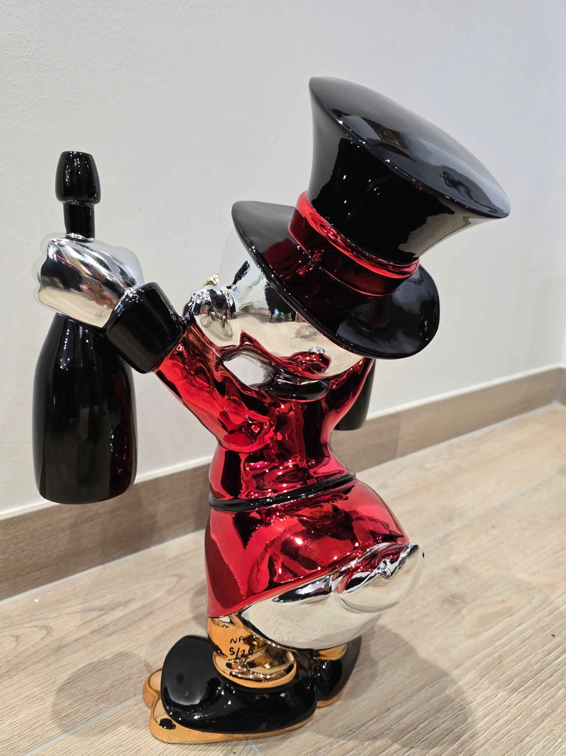 Voici une sculpture unique et décalée représentant Picsou, le célèbre canard milliardaire, revisité dans un style Pop Art ultra-moderne. Habillé en costume rouge métallisé et haut-de-forme noir, il tient fièrement deux bouteilles de Dom Pérignon Rosé Vintage 2002, clin d’œil assumé au luxe et à la fête.