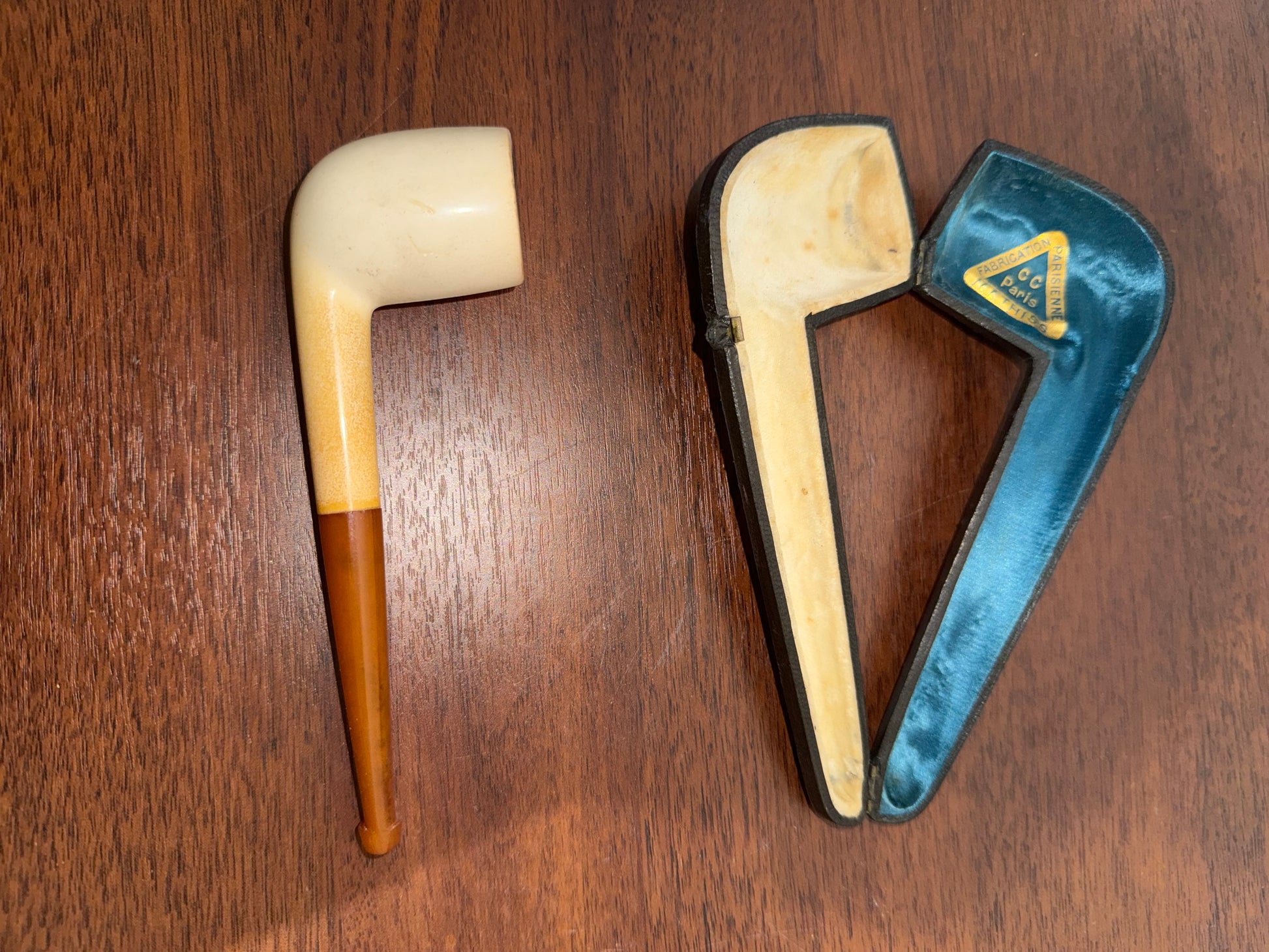 Pipe en écume de mer dans son écrin d’origine estampillée “Fabrication Parisienne C.C. Paris”.