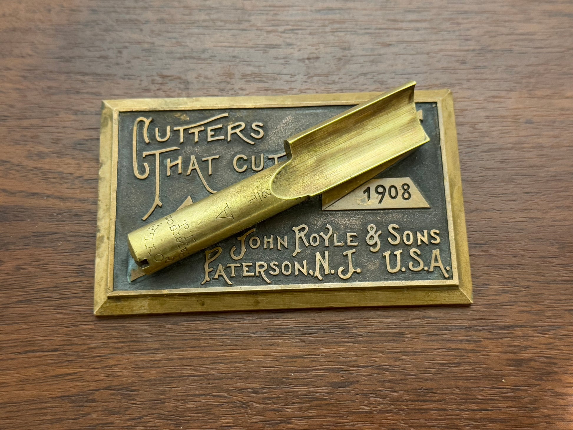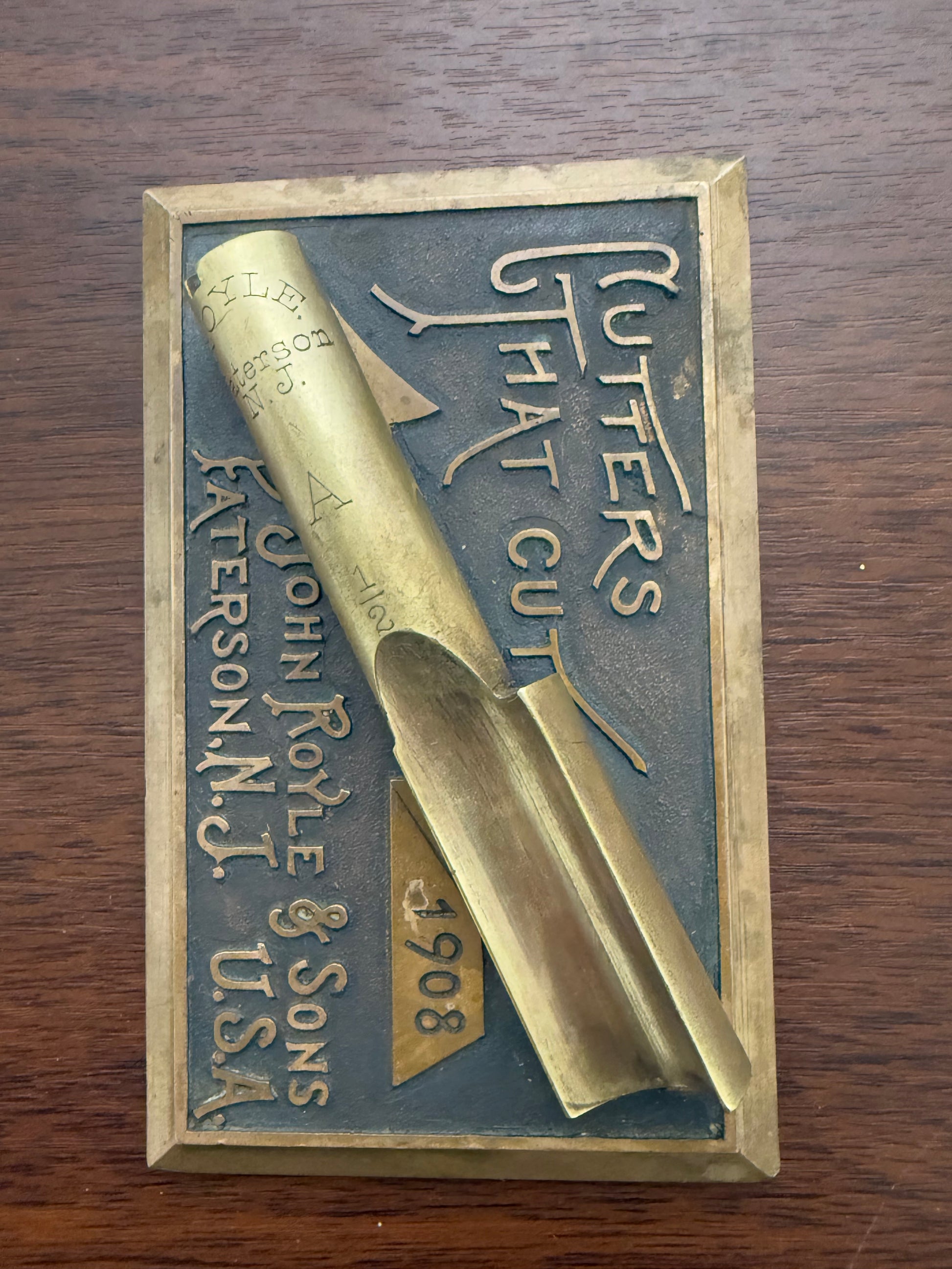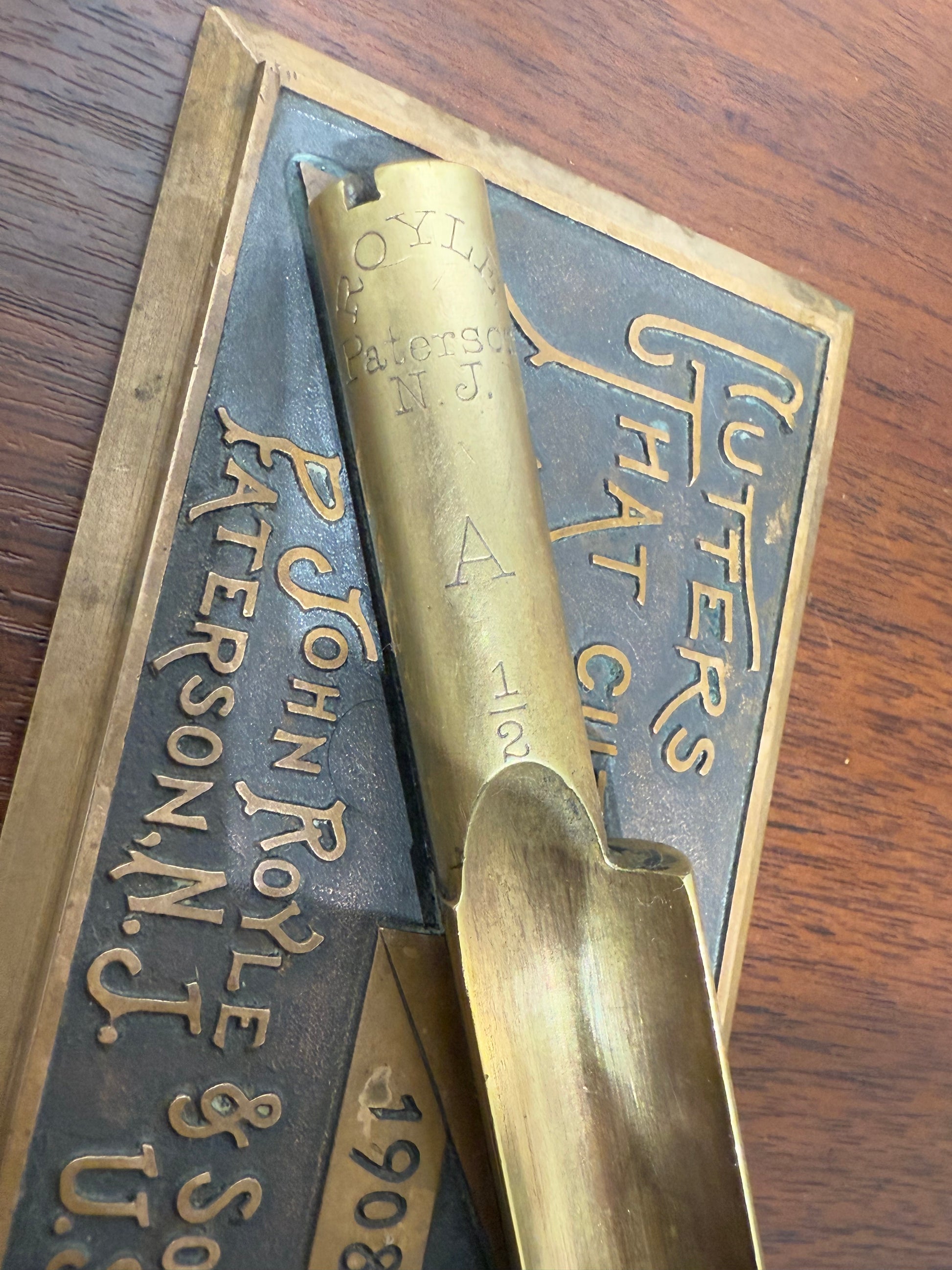 • Plaque en laiton frappée avec l’inscription “Cutters That Cut” et la mention de la société John Royle & Sons, basée à Paterson, New Jersey, USA.
