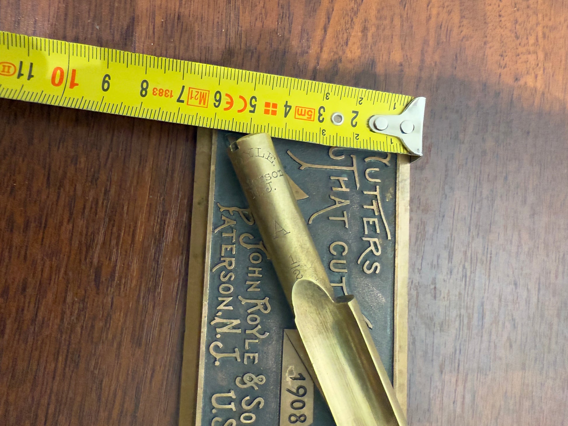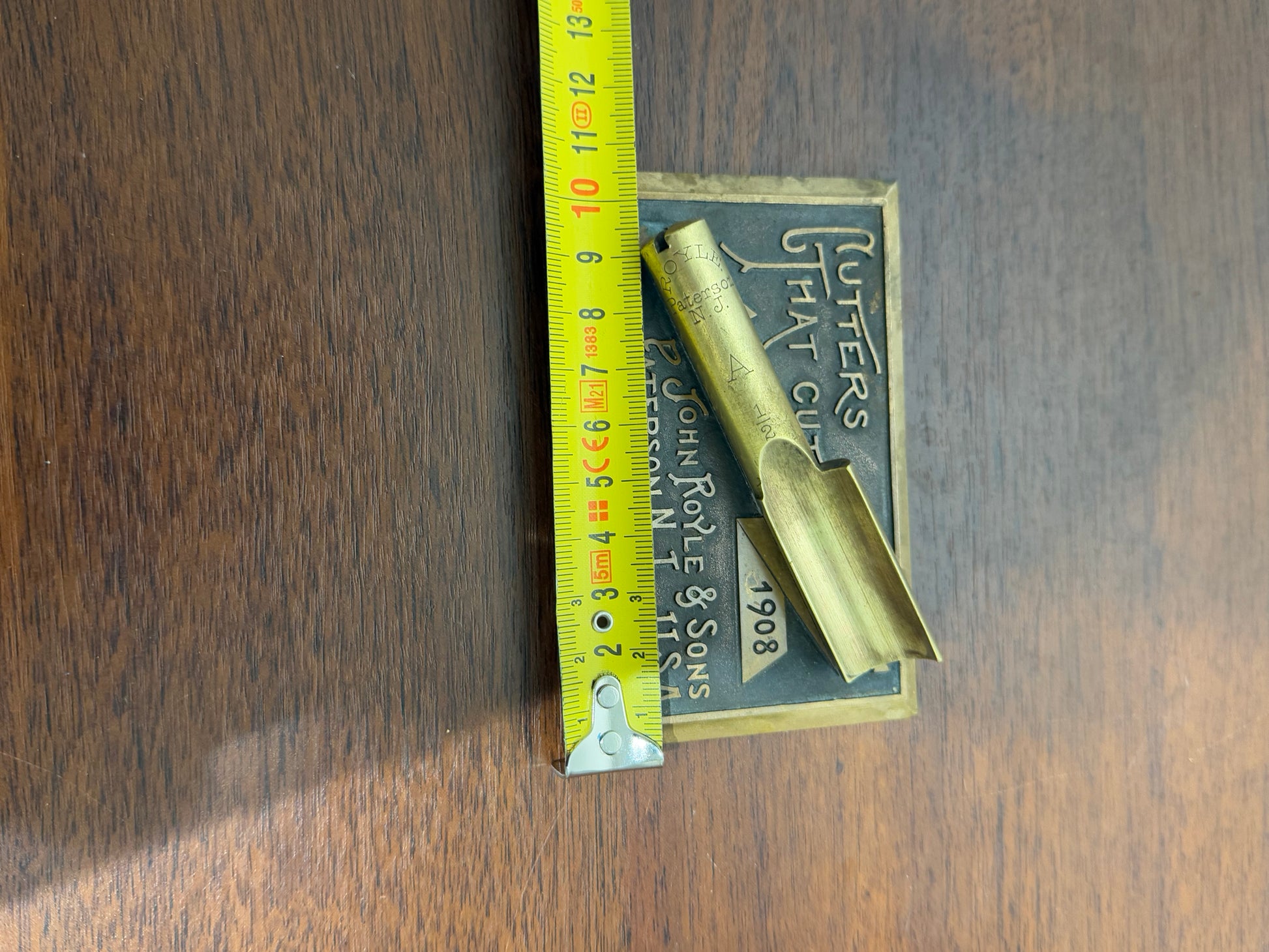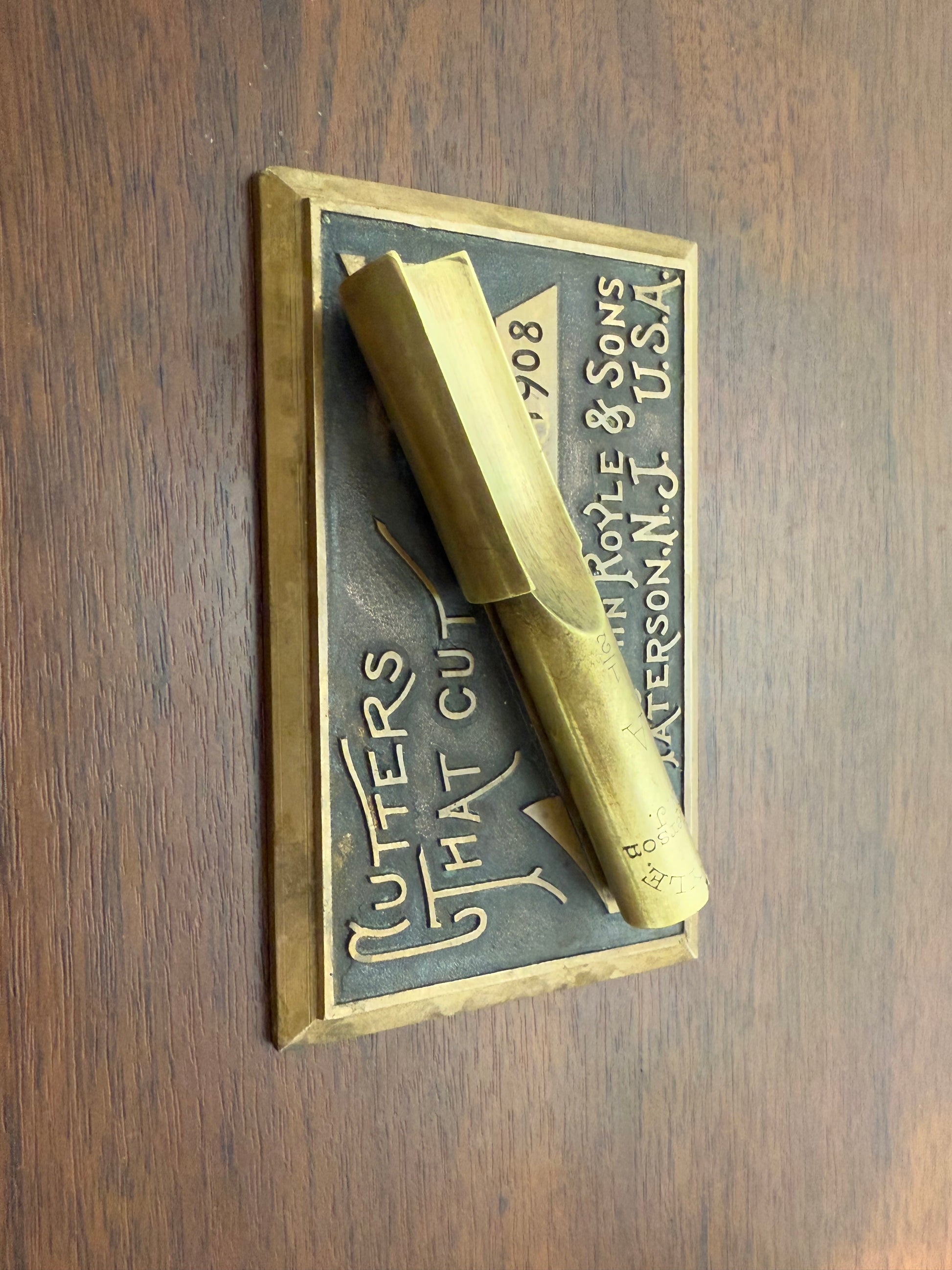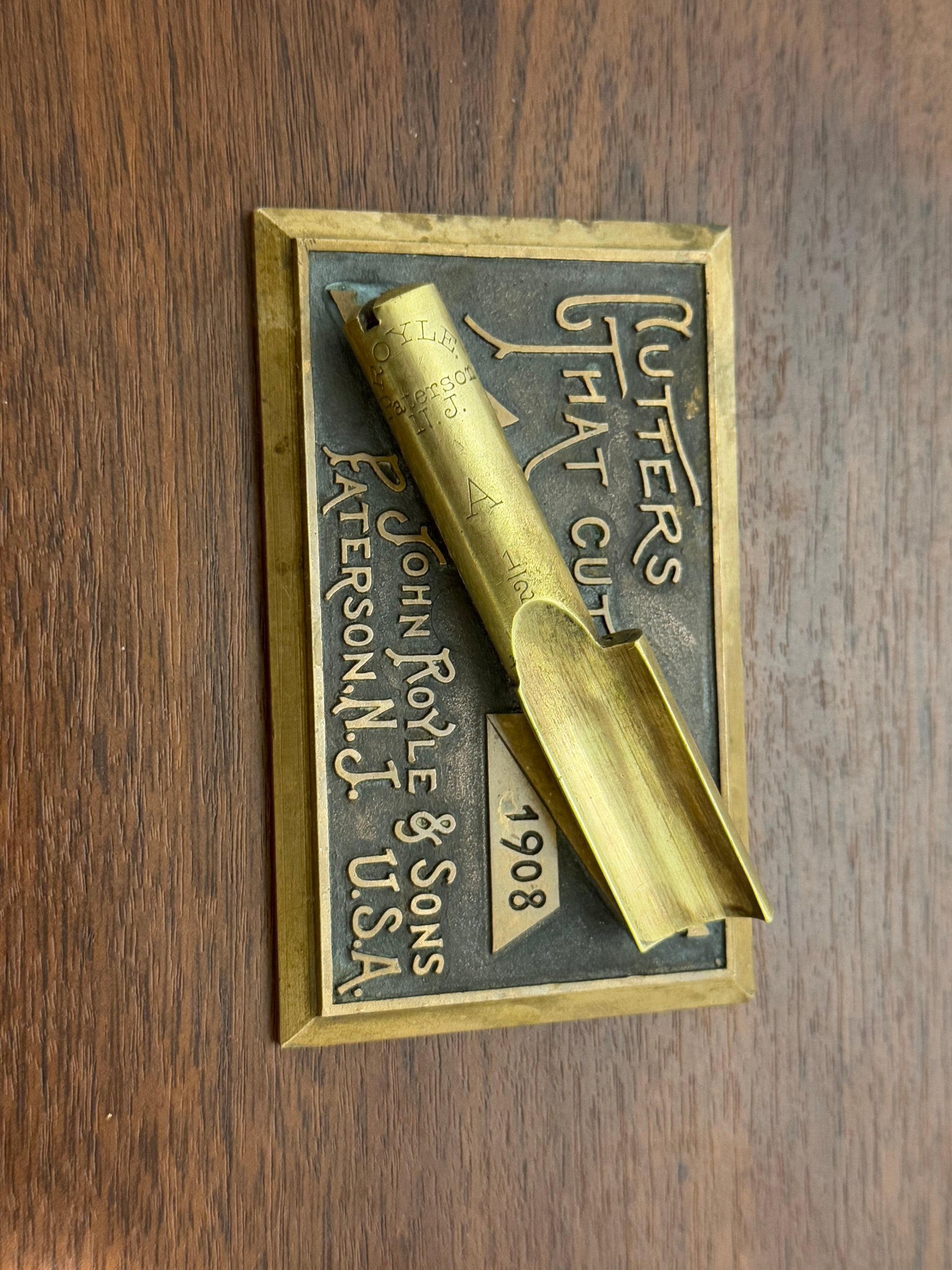 • Plaque en laiton frappée avec l’inscription “Cutters That Cut” et la mention de la société John Royle & Sons, basée à Paterson, New Jersey, USA.
