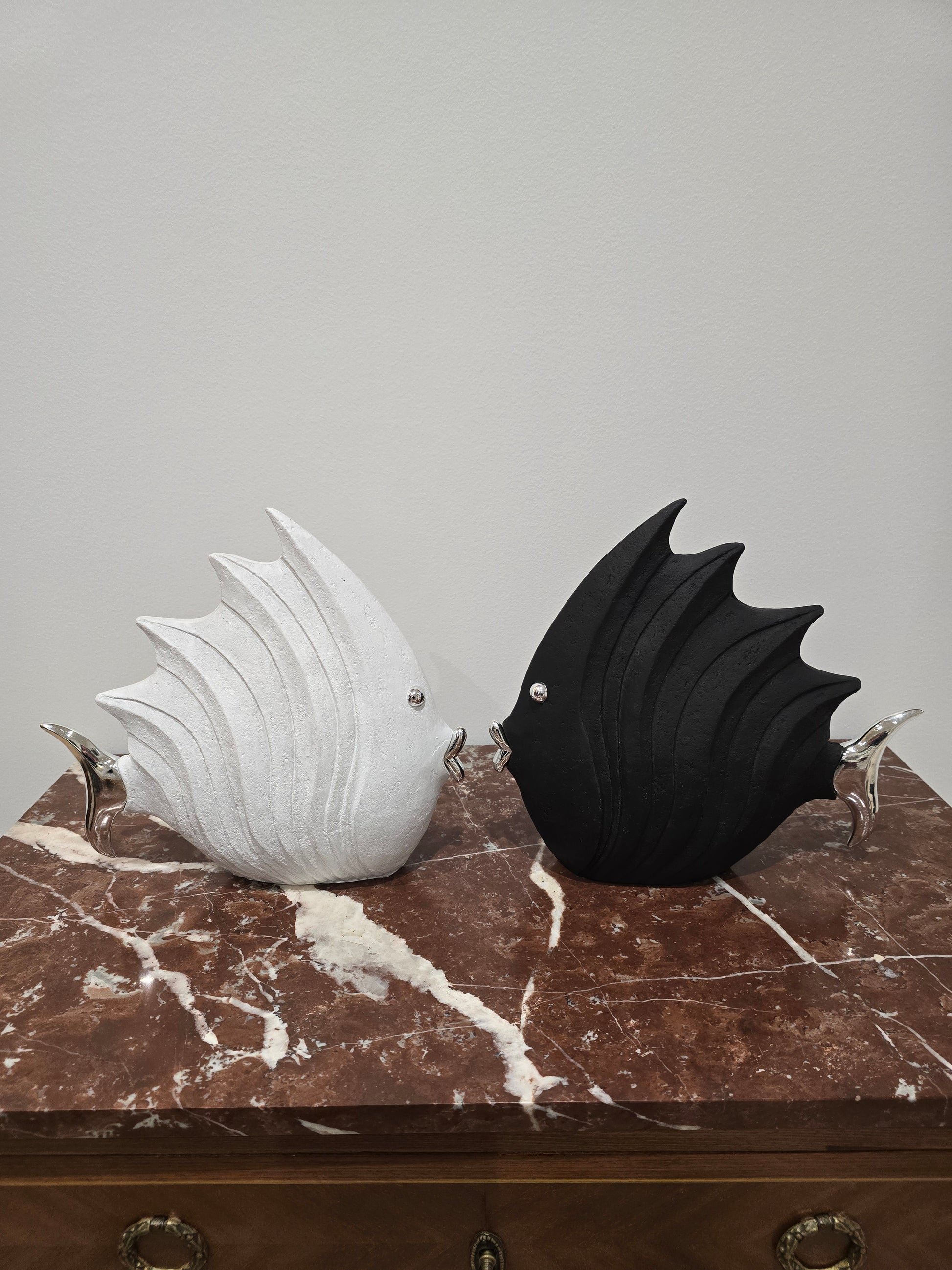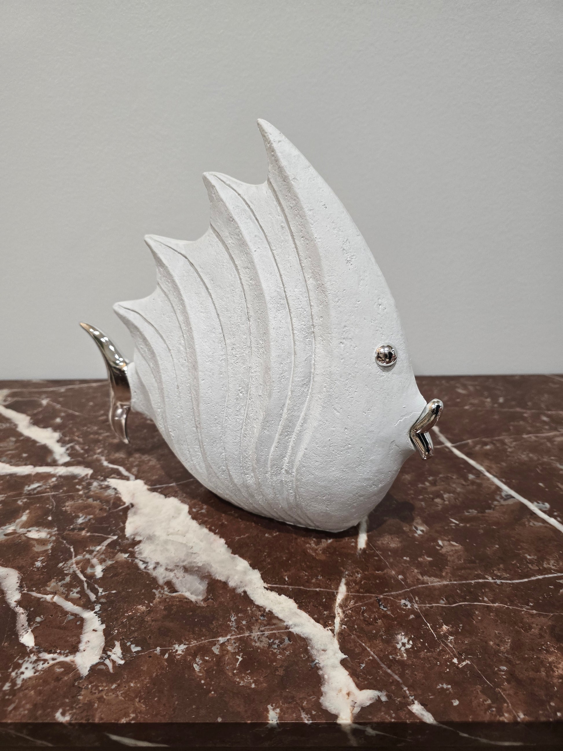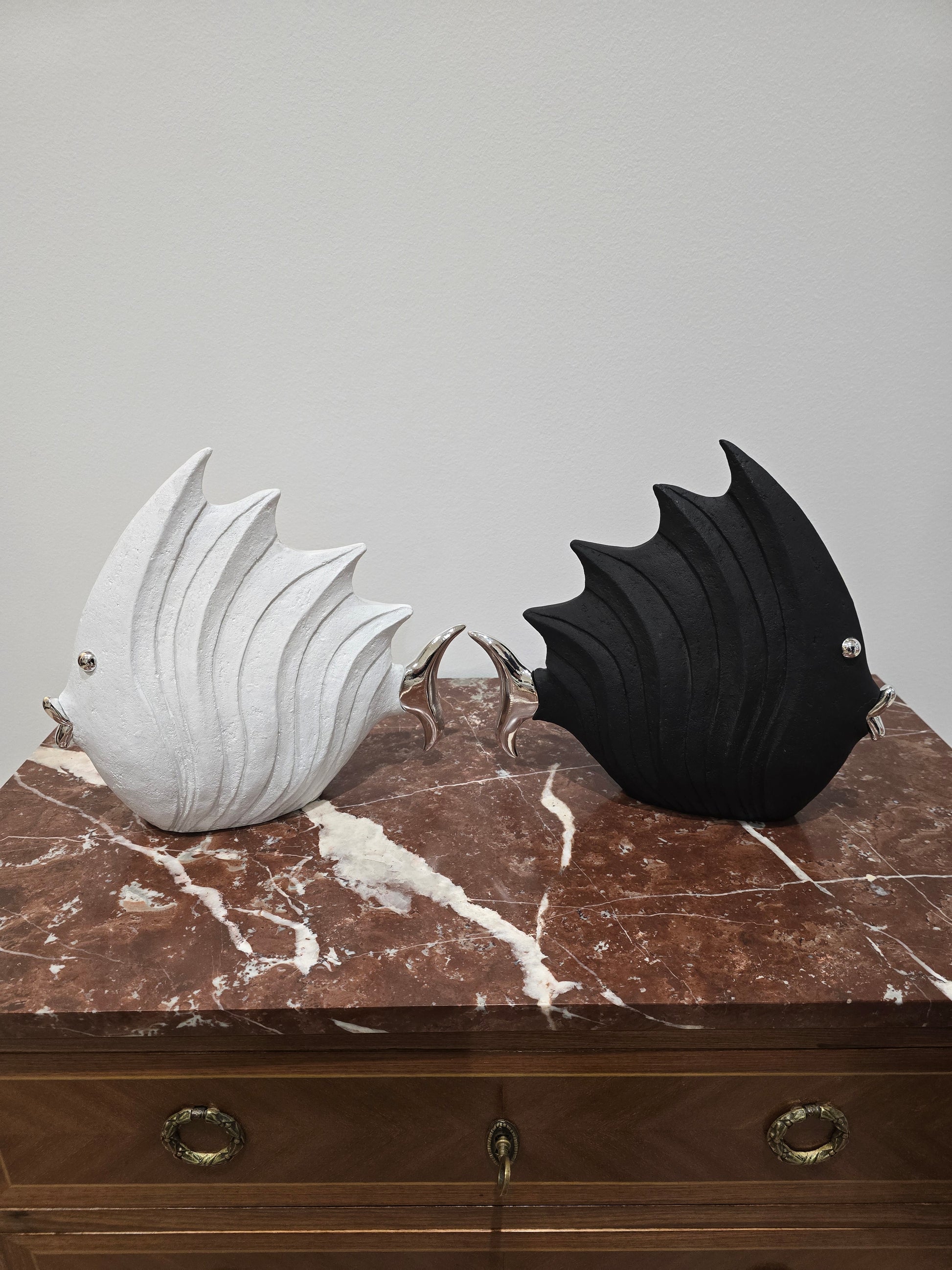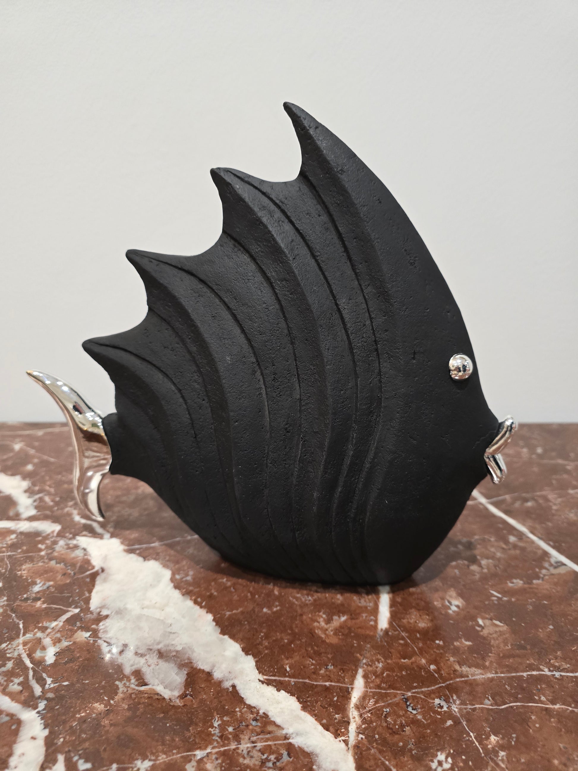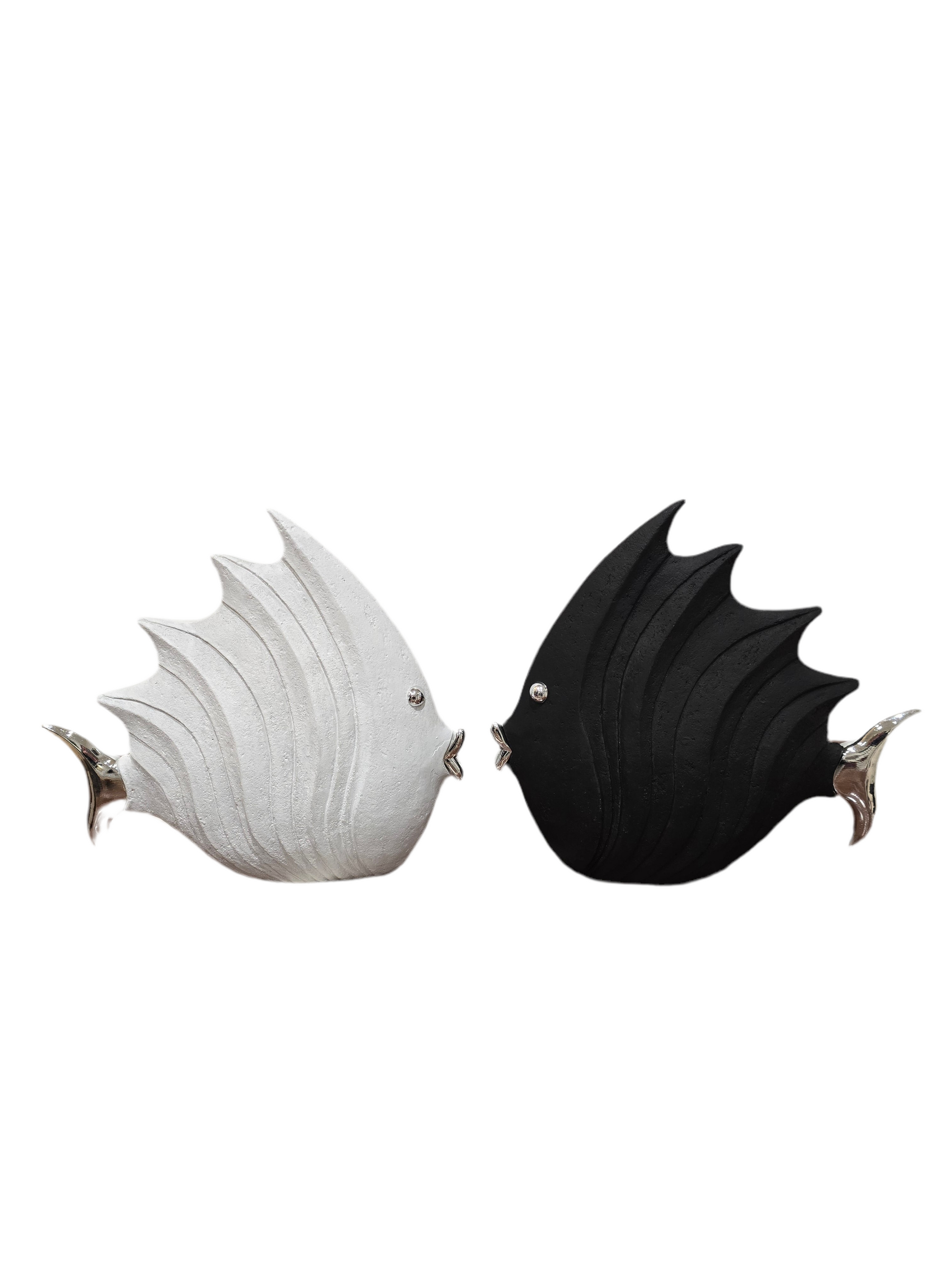 La figurine en résine "Poisson" impressionne par son design unique et sa finition de qualité. Avec des dimensions de 29 cm x 26 cm, c'est un accroche-regard décoratif pour n'importe quelle pièce. La combinaison de couleurs avec des accents noirs et argentés donne à la figurine une touche élégante. La surface est à la fois brillante et mate et donne un aspect intéressant. Que ce soit dans une ambiance maritime ou comme point fort moderne dans votre intérieur, cette figurine attire tous les regards. Laissez-vous inspirer