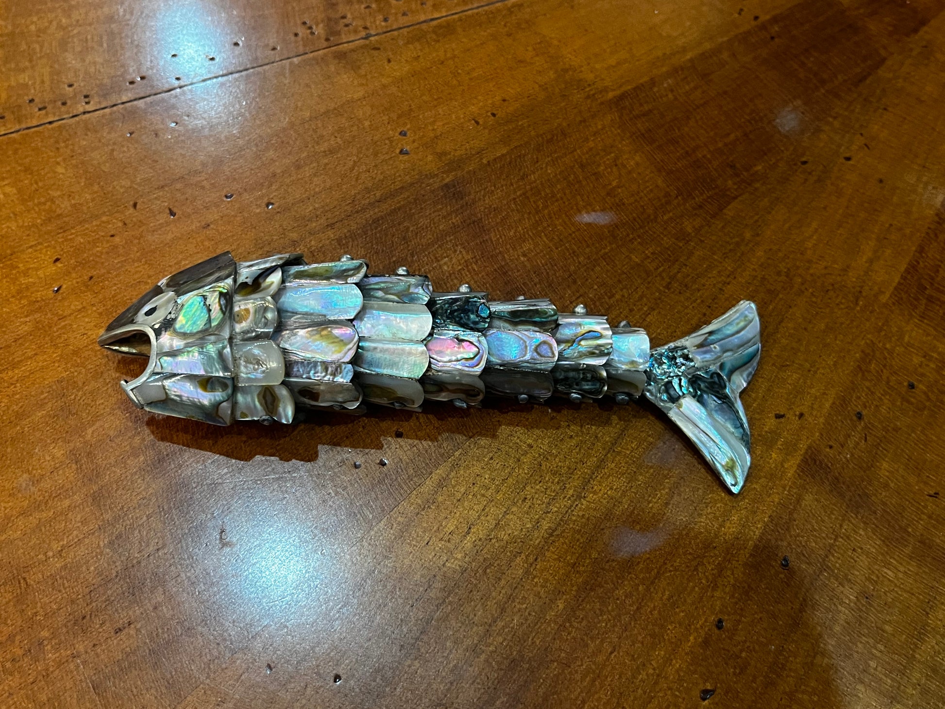 Ce poisson d'ormeau vintage articulé est un véritable bijou pour les collectionneurs. Incrusté de nacre et en métal argenté, ce décapsuleur original des années 70 est à la fois esthétique et fonctionnel. Un objet unique pour ouvrir vos bouteilles avec élégance et originalité.