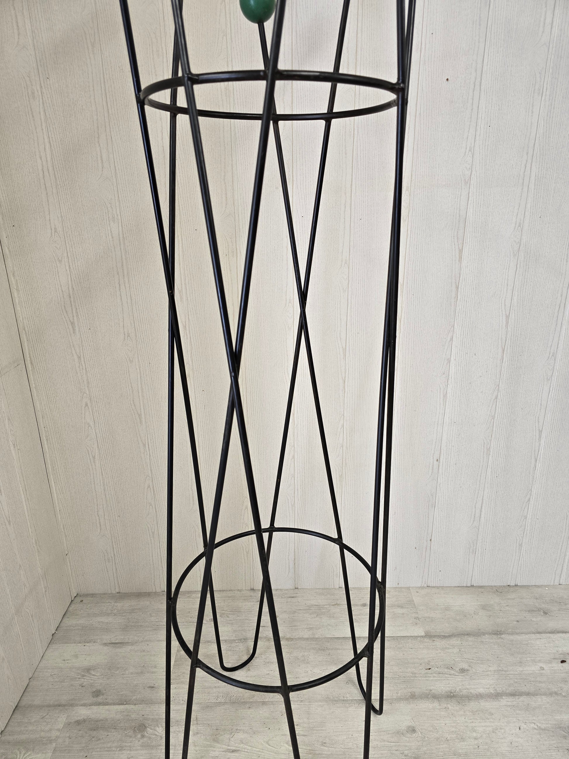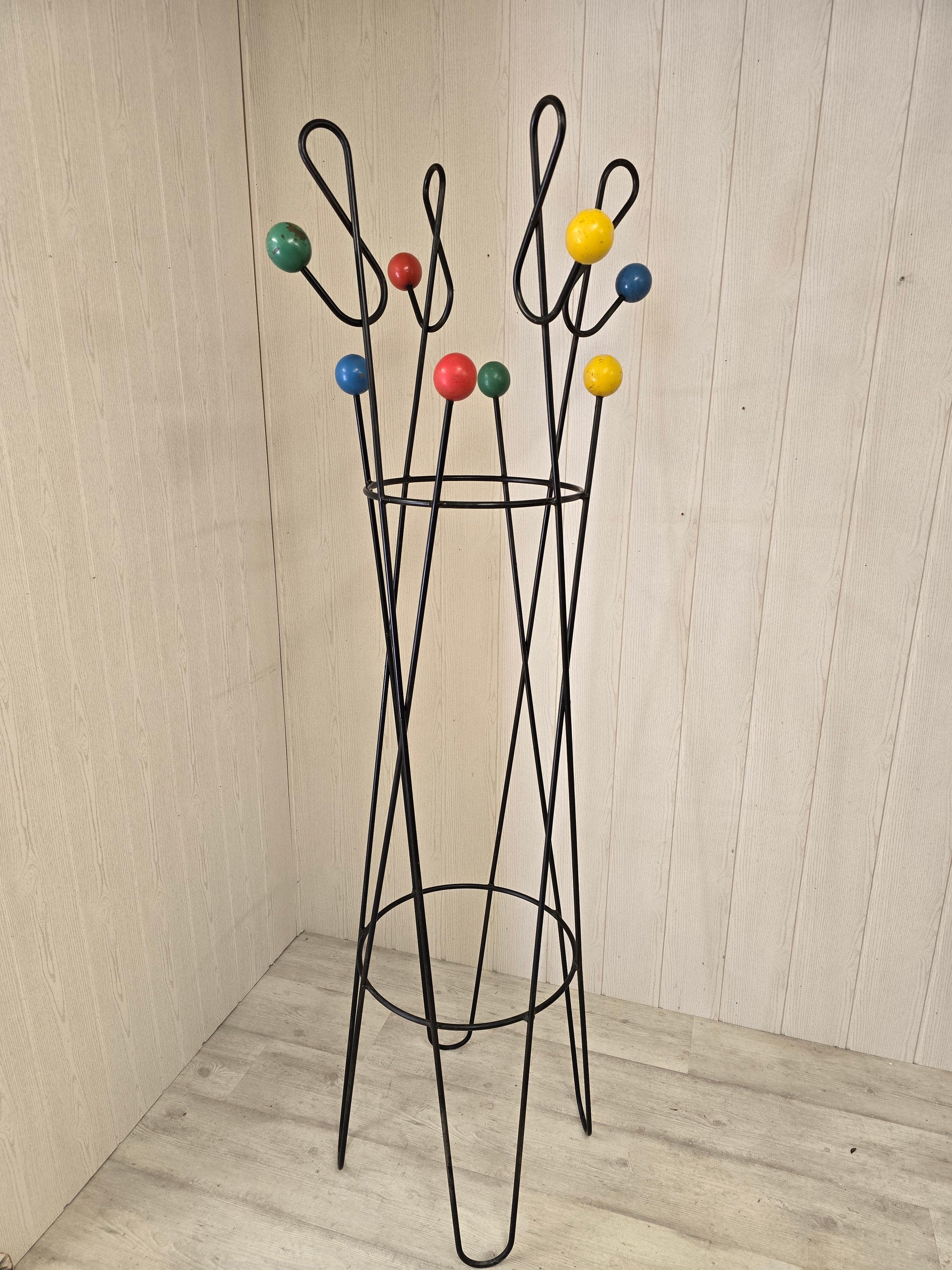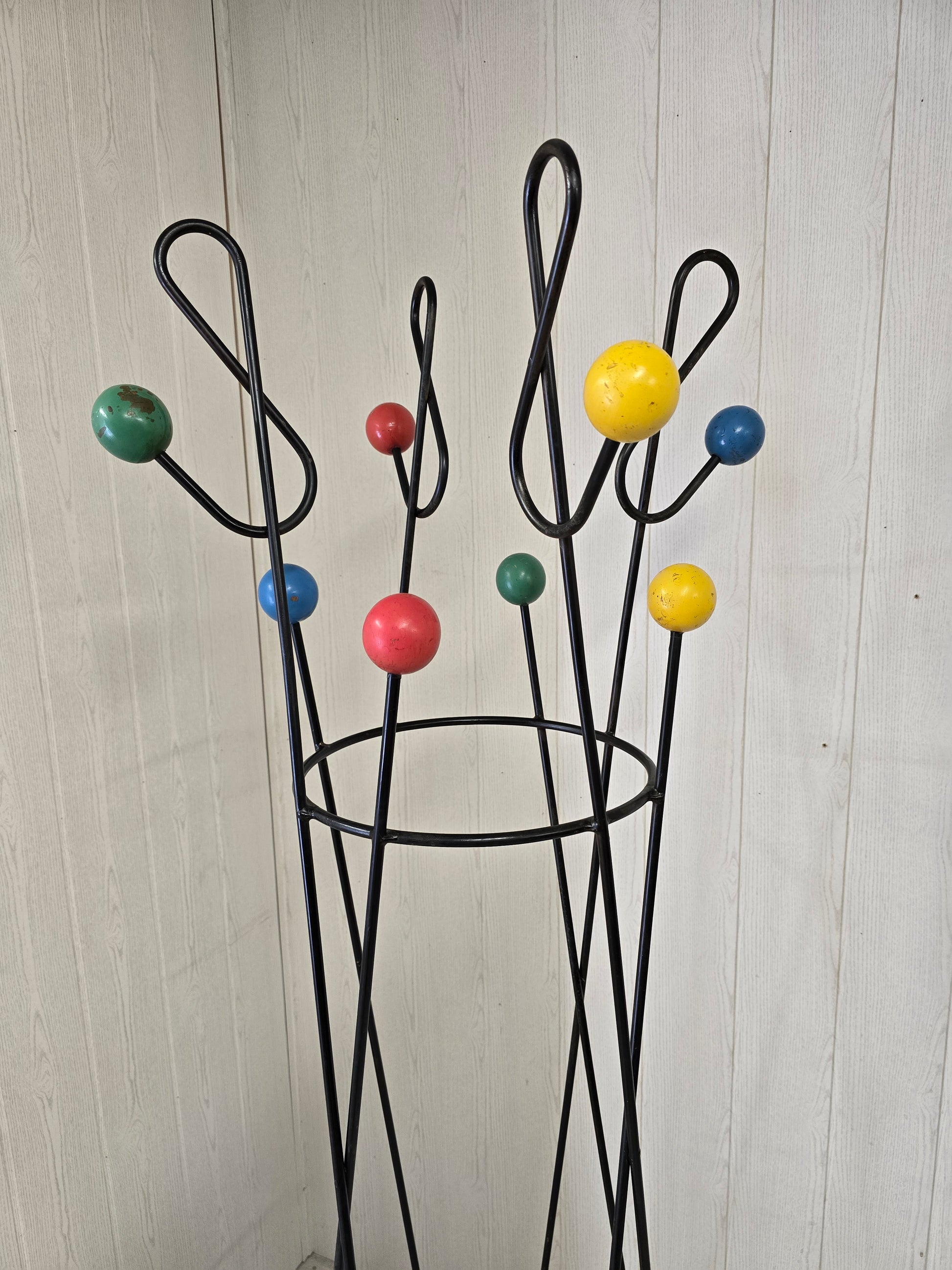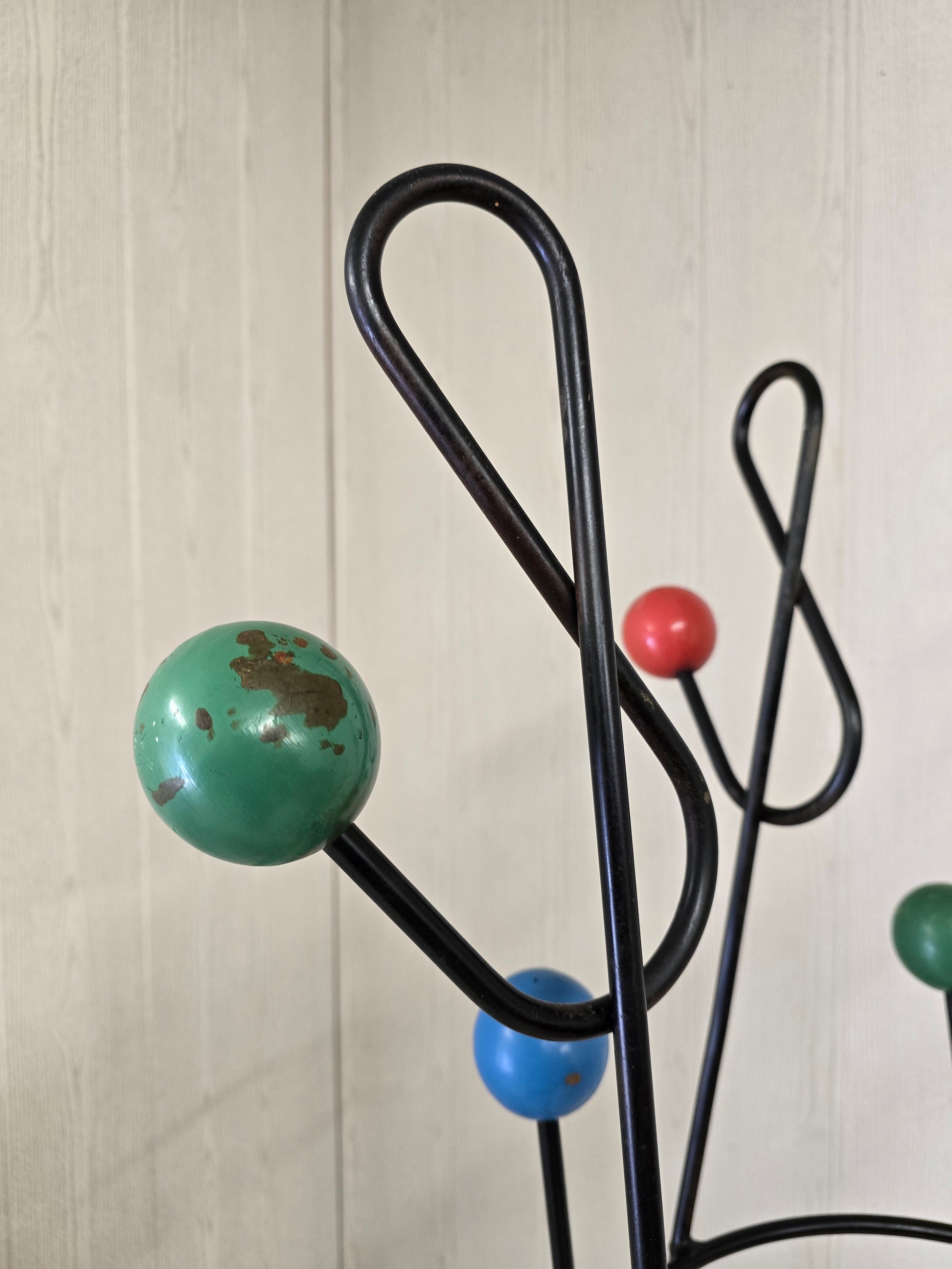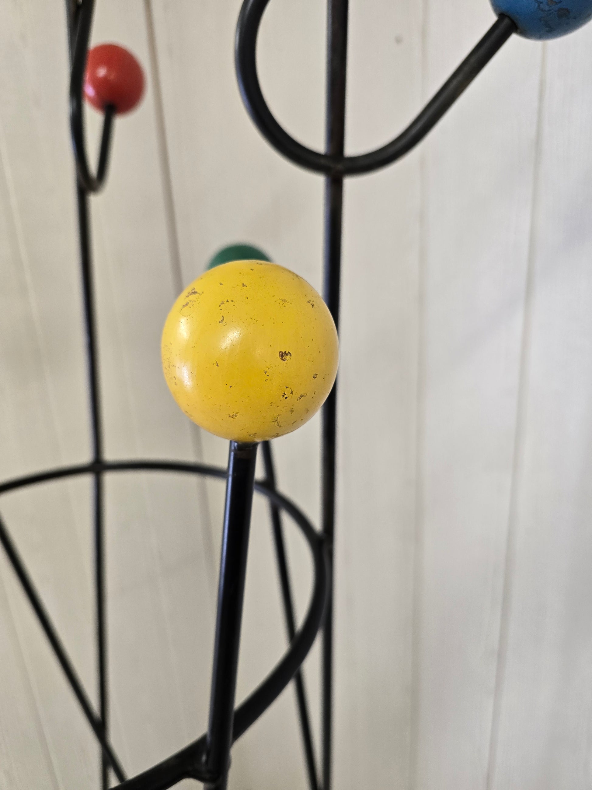 Élégant portemanteau signé Roger Feraud, designer emblématique du design français des années 50. Ce modèle iconique se distingue par sa structure aérienne en métal laqué noir formant une composition graphique et dynamique. Les embouts sont ornés de boules colorées en bois (rouge, jaune, bleu, vert), typiques du style joyeux et moderniste de l’époque.
