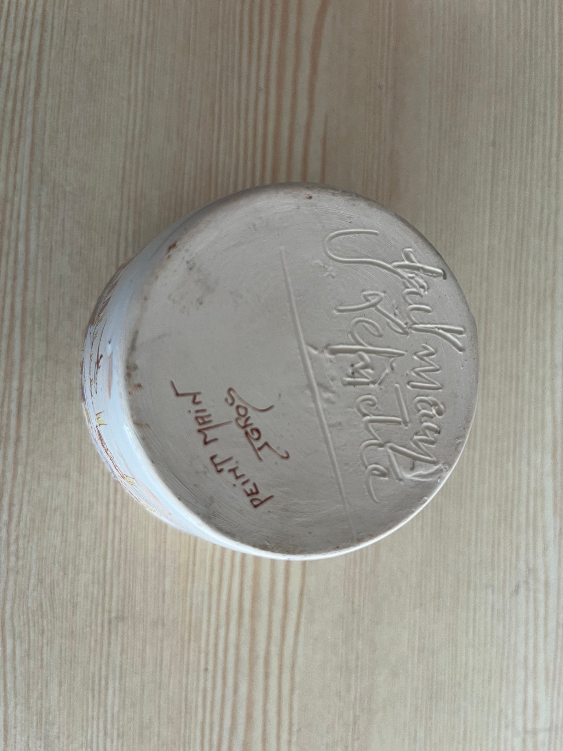 Découvrez ce petit pot fait et peint à la main, signé par un artiste de talent. Avec sa fabrication artisanale, chaque pot est unique et possède une belle touche personnelle. Offrant un look original et authentique, ce pot apportera de l'élégance à votre décoration intérieure.