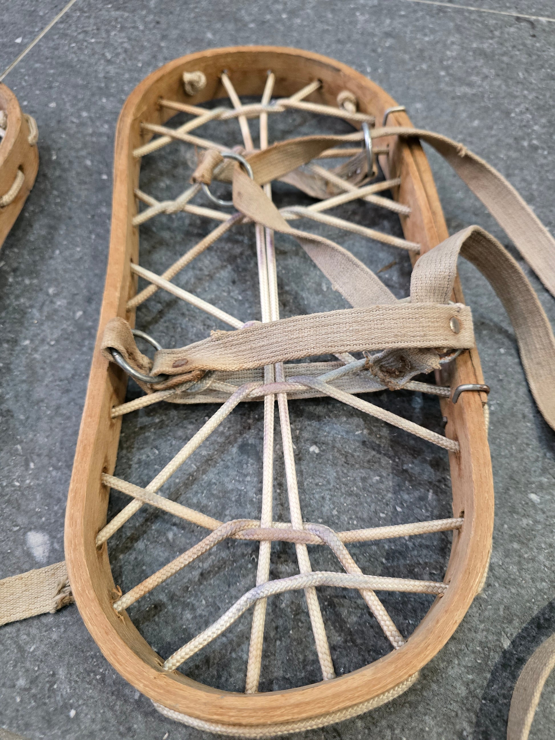 Réalisées en bois cintré avec un tressage en corde solide et des sangles en toile d’origine, ces raquettes typiques des années 1950-1970 témoignent du savoir-faire artisanal français dédié aux équipements de montagne.