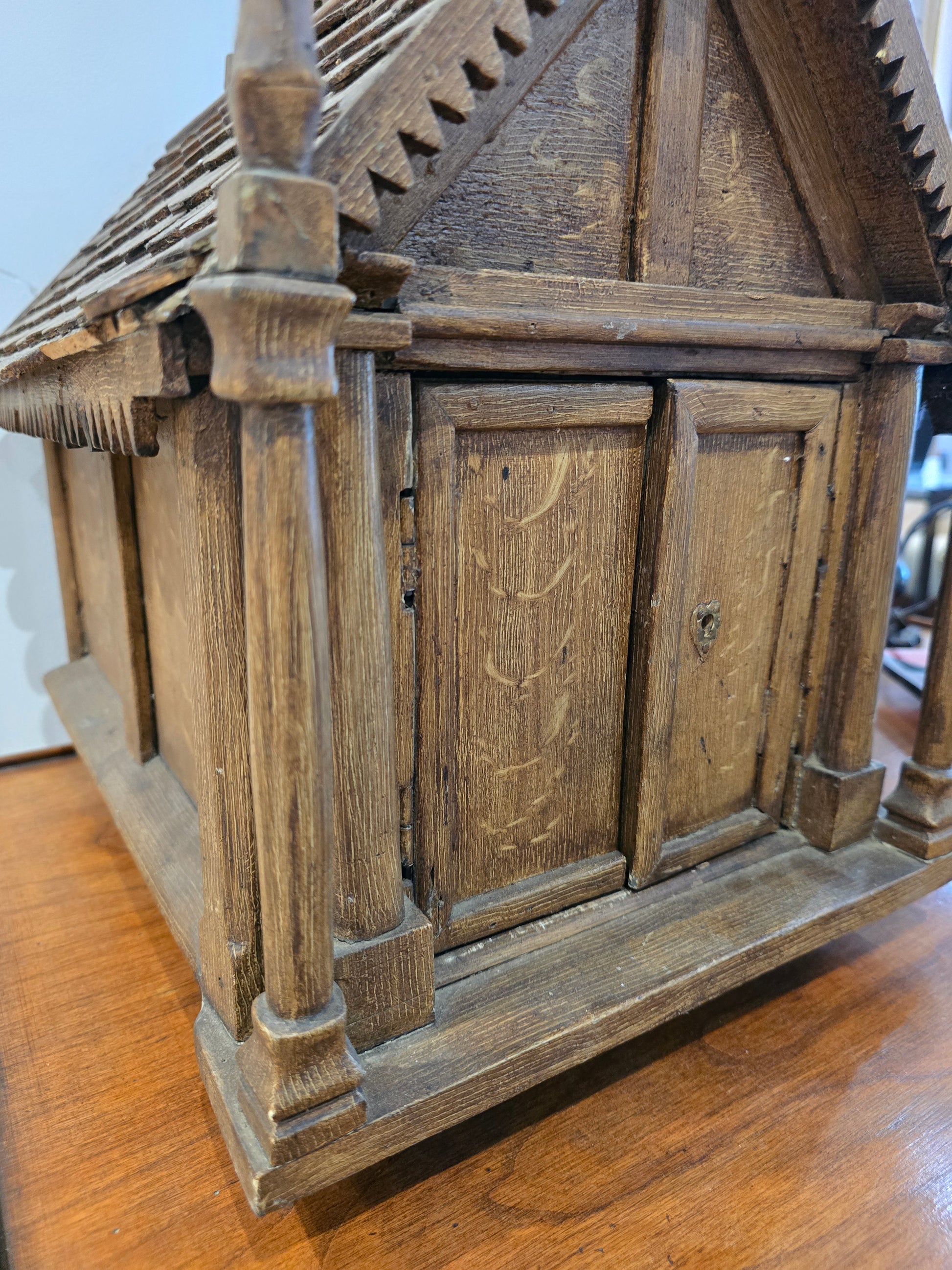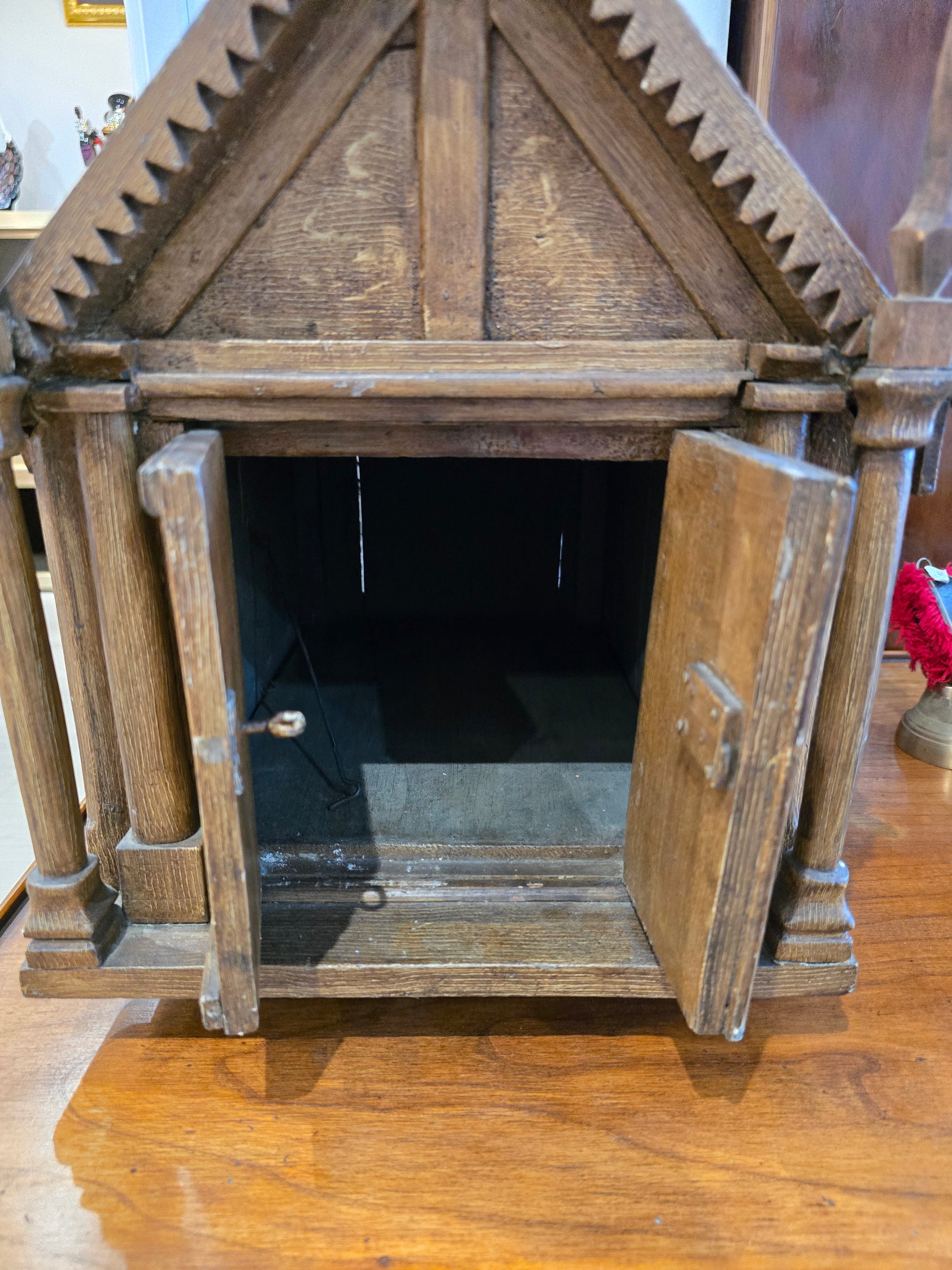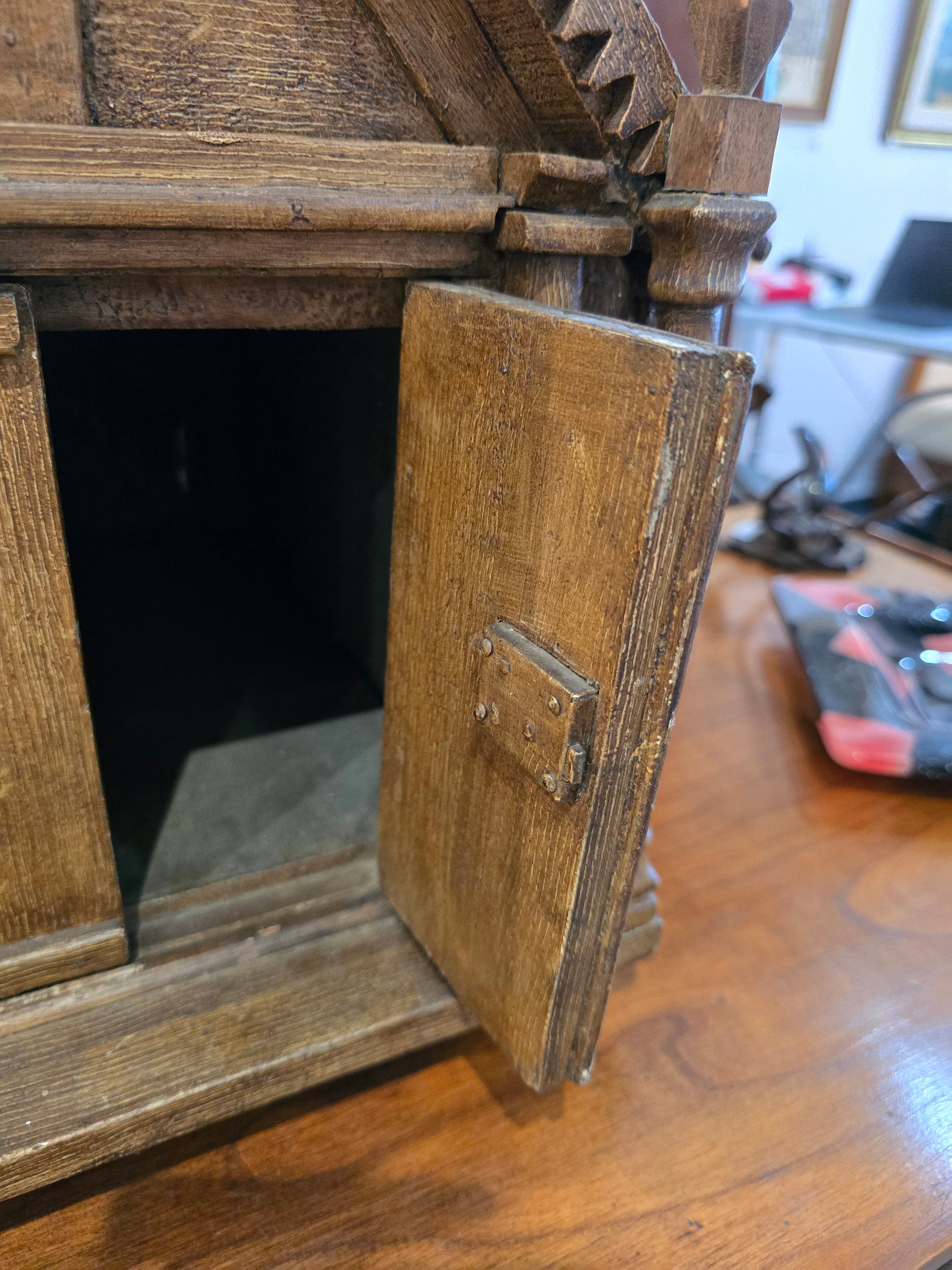 Très bon état pour son âge. Petits manques visibles sur les bords du toit, usures légères, mais rien qui altère son charme ou sa solidité. Patine ancienne préservée, serrure fonctionnelle.