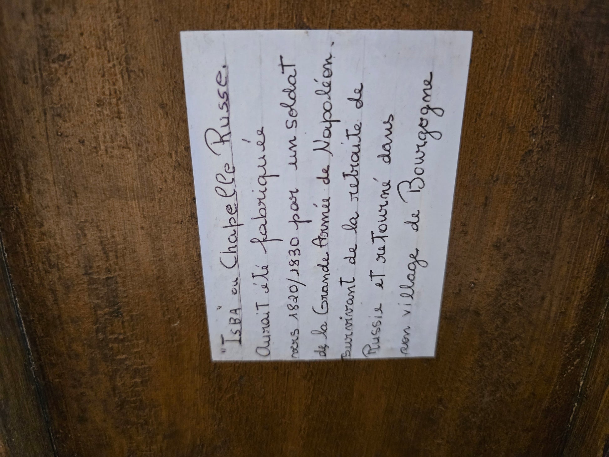 Objet exceptionnel à forte valeur historique et sentimentale : cette petite chapelle votive en bois sculpté, appelée isba ou chapelle russe, aurait été fabriquée entre 1820 et 1830 par un ancien soldat de la Grande Armée de Napoléon. Ce dernier, survivant de la terrible retraite de Russie en 1812, serait revenu dans son village natal de Bourgogne et aurait façonné cette œuvre en mémoire de cette période marquante.