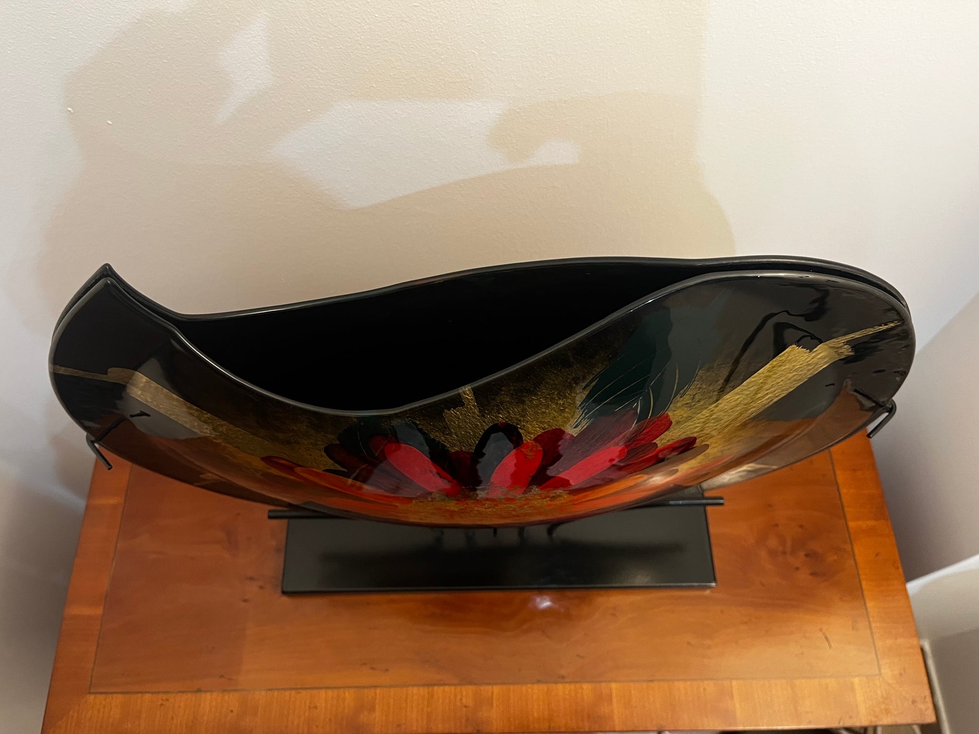 Le vase en verre Doré peint à la main attire tous les regards. Disponible en or, vert et rouge, il impressionne par son design délicat et son magnifique motif floral. Avec des dimensions de longueur 9 cm, largeur 32 cm et hauteur 37 cm, il s'adapte parfaitement sur n'importe quelle table ou dans une vitrine. La forme plate et ronde les rend particulièrement polyvalents. Veuillez noter que le vase n'est pas étanche et est donc idéal pour les fleurs sèches ou uniquement pour la décoration. L'intérieur du vase est peint à la main