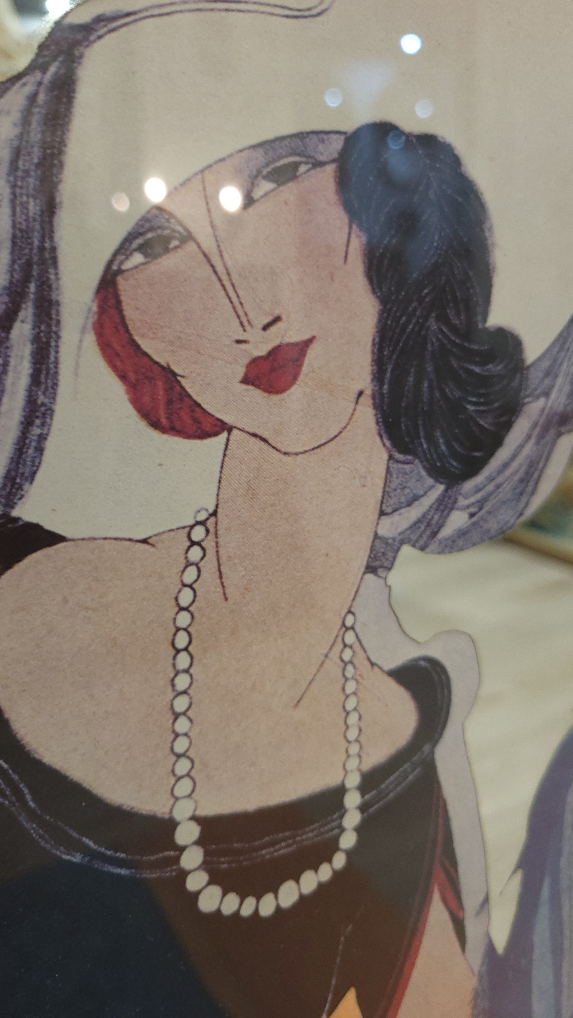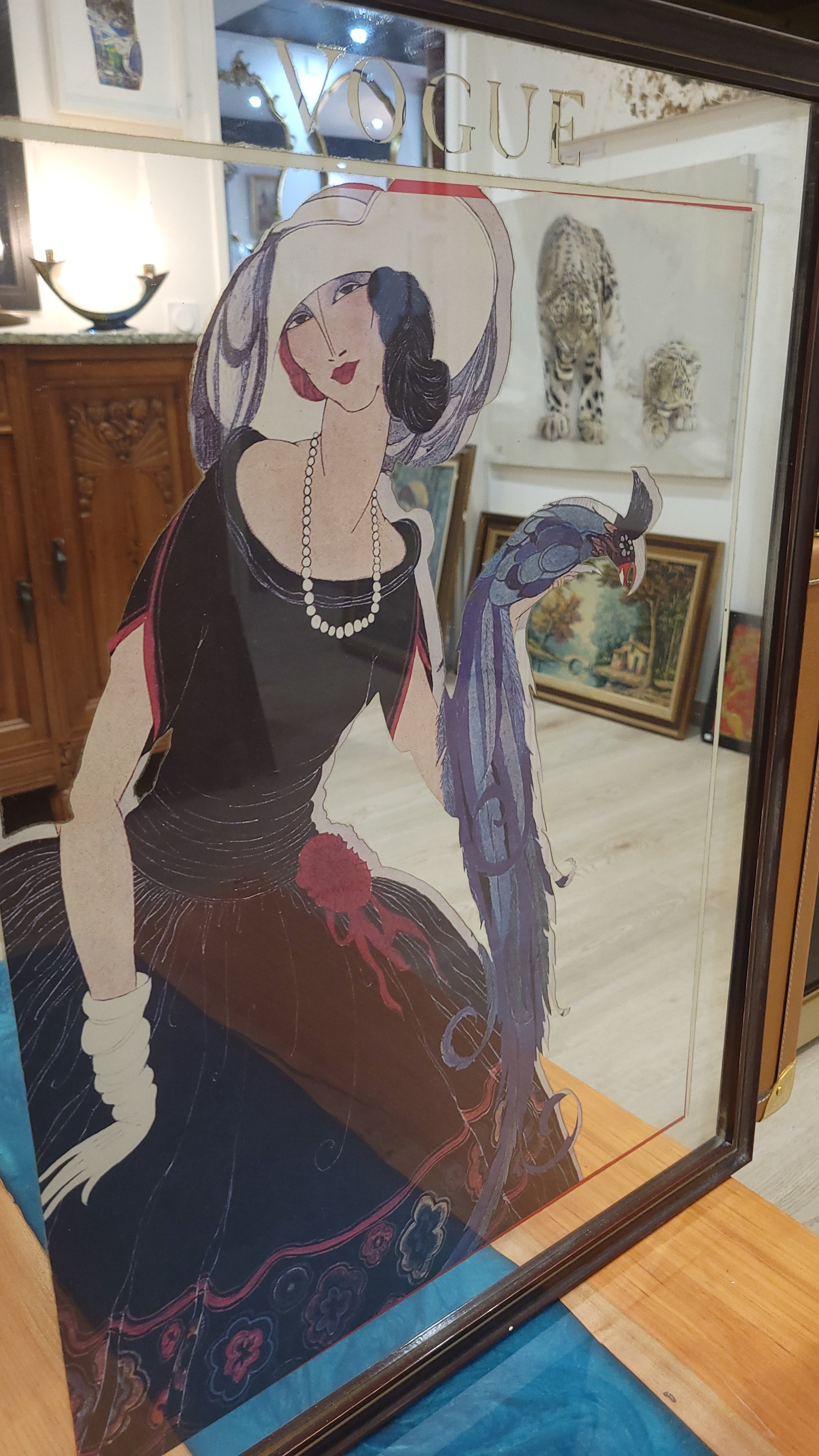 Élégant miroir décoratif de style Art déco, sérigraphié d’un visuel inspiré des célèbres couvertures du magazine VOGUE des années 1920. On y découvre une femme au port altier, vêtue d’une robe noire ornée d’un motif floral, coiffée d’un grand chapeau blanc et tenant un oiseau exotique aux plumes bleutées (probablement un faisan stylisé). L’inscription “VOGUE”, couronne la composition.