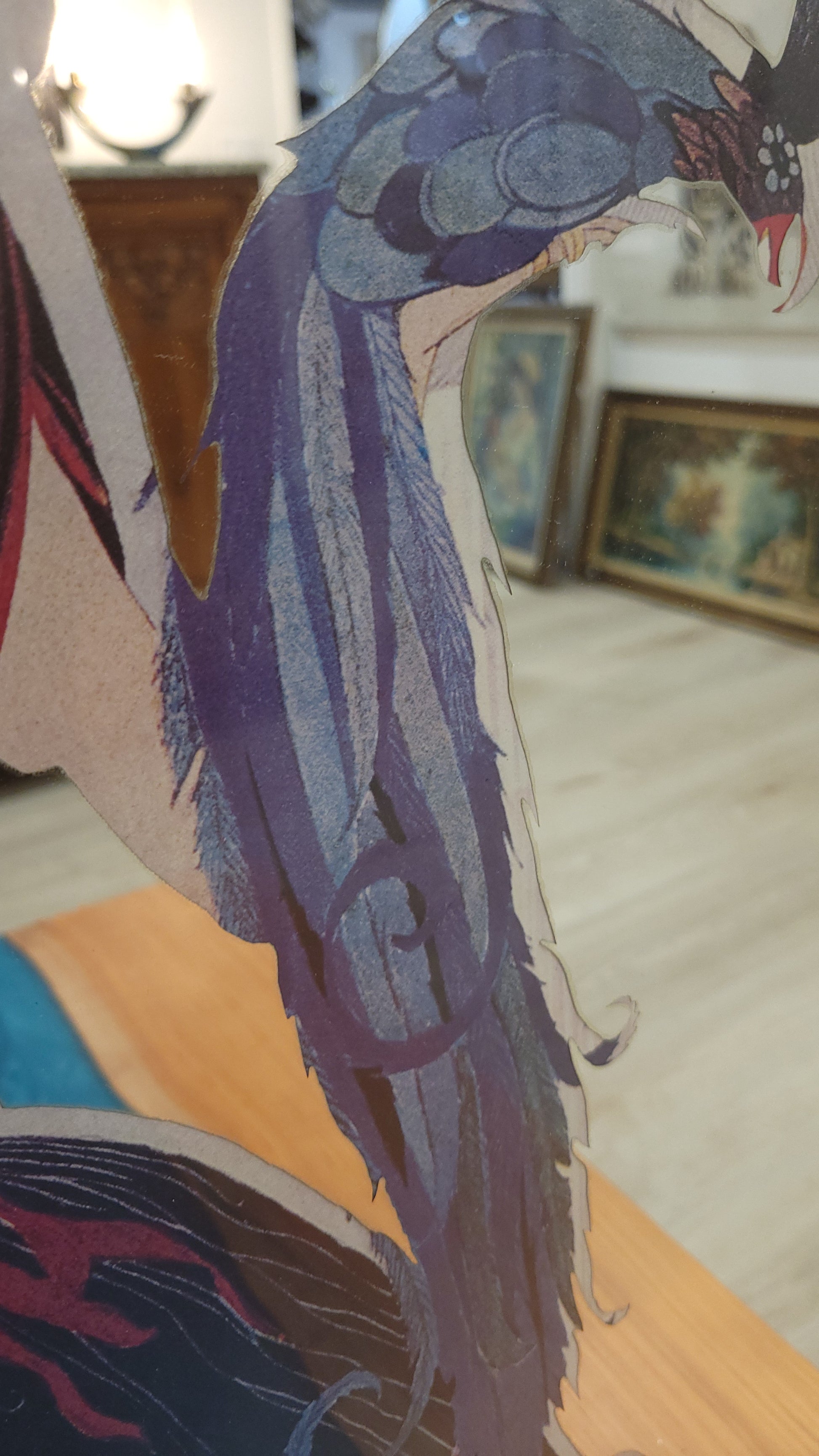 L’image est directement appliquée par sérigraphie sur le verre miroir, créant un effet luxueux et original : le fond réfléchissant interagit avec l’environnement et ajoute de la profondeur à la scène. L’ensemble est encadré dans un cadre en bois foncé à profil simple, élégant et prêt à suspendre.