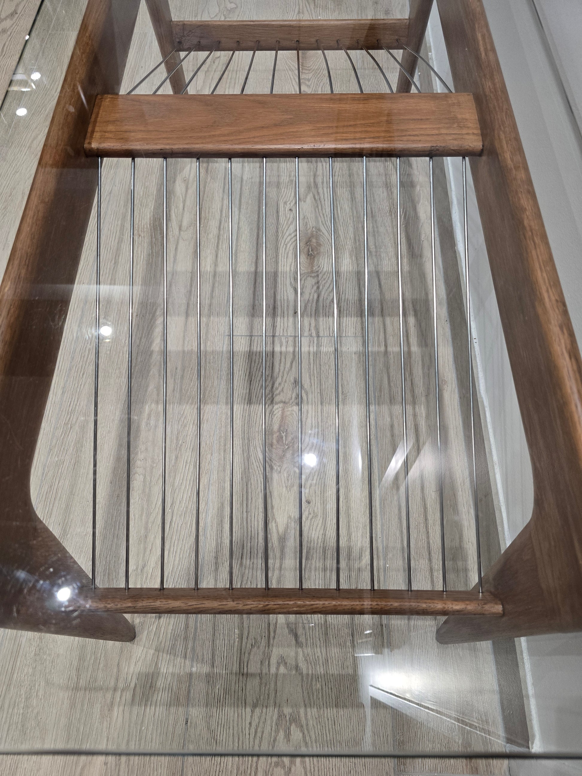 Élégante table basse vintage au design scandinave, alliant la chaleur du bois et la transparence d’un plateau en verre. Son piétement effilé et son porte-revues en tiges métalliques apportent à la fois légèreté et fonctionnalité, dans un style typique des années 1950-60.