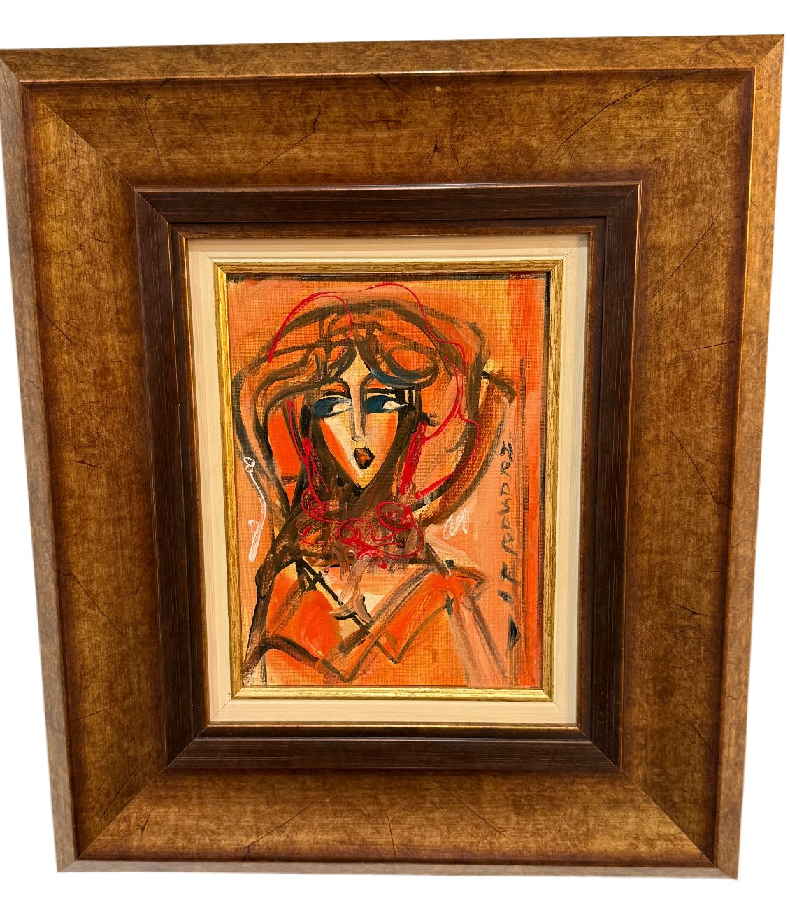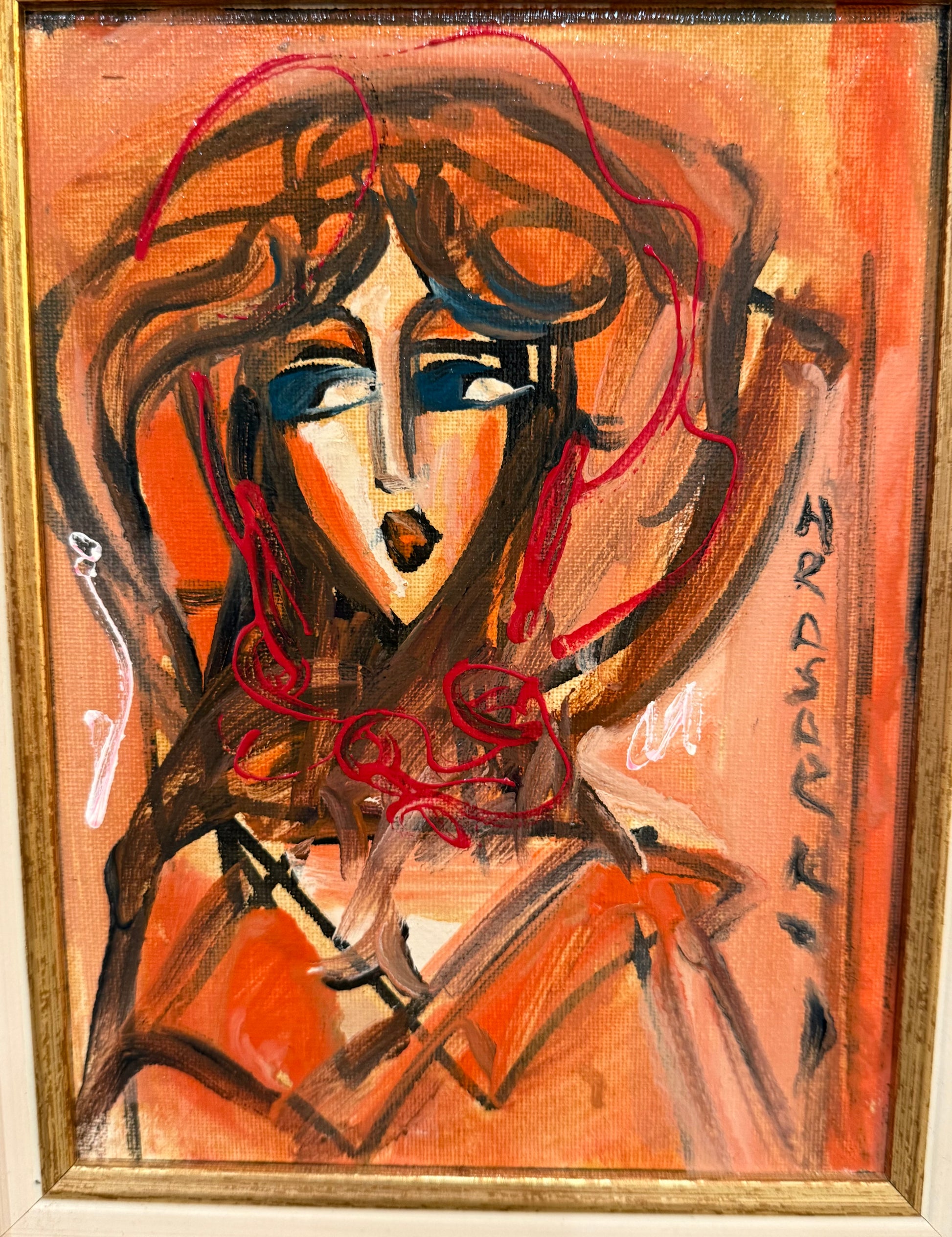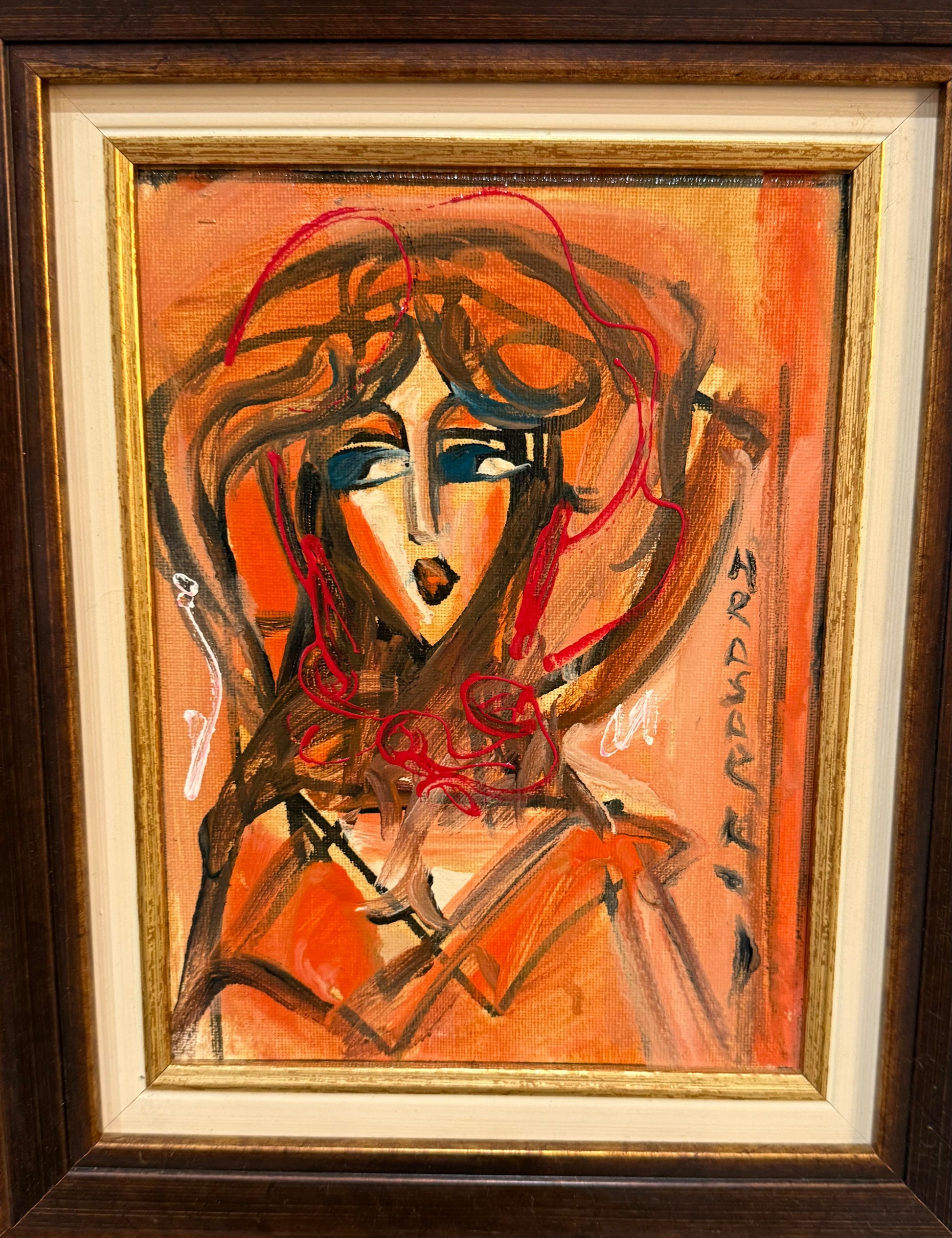 Ce tableau représente un portrait stylisé de femme, aux traits anguleux et yeux très marqués, dans une palette chaude de tons orangés et rouges. L’expression est à la fois théâtrale et énigmatique. La chevelure foisonnante entoure le visage avec des traits libres, presque calligraphiques. Ce style évoque l’univers de la femme muse, très présent dans certaines écoles modernes d’Europe de l’Est.