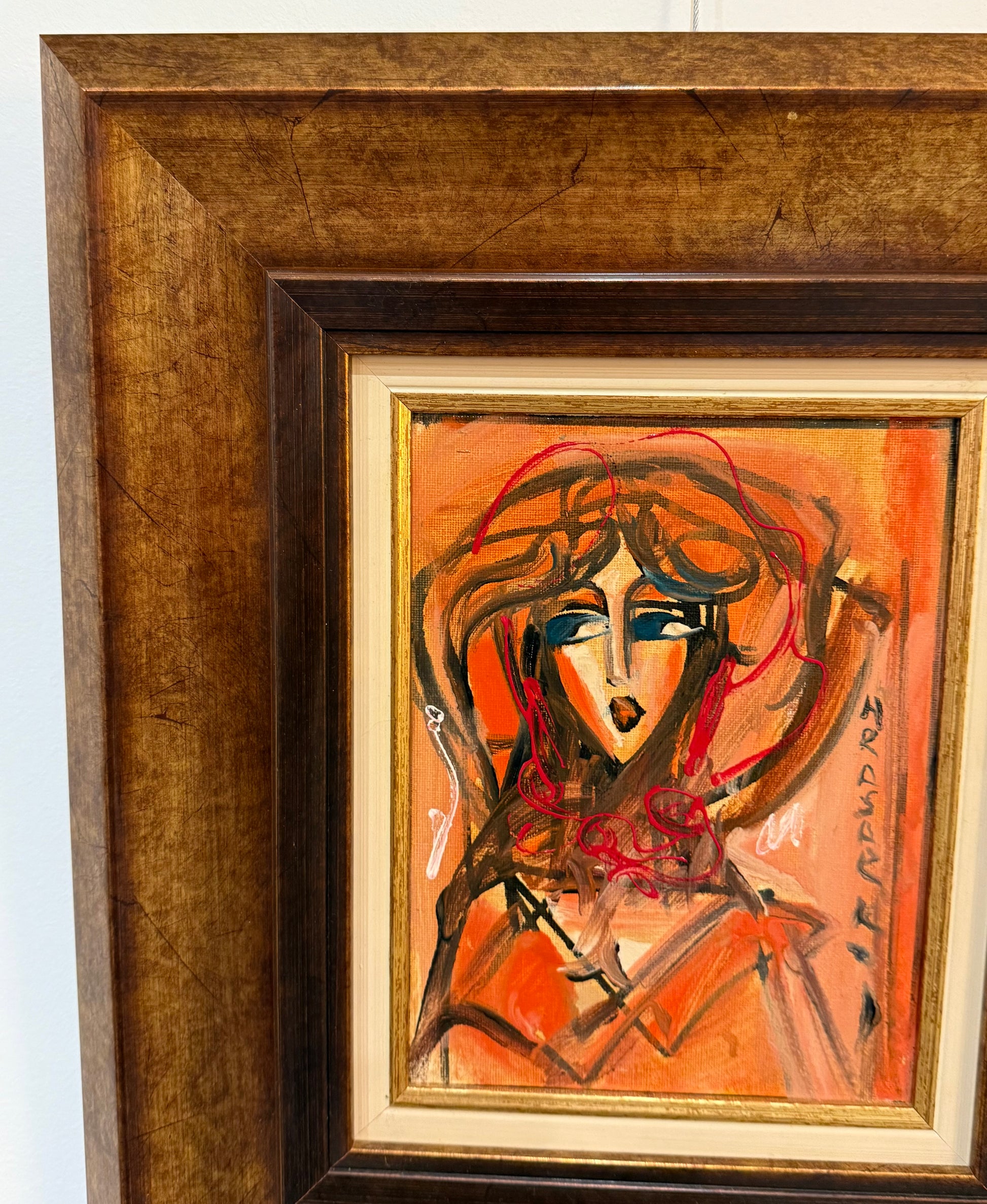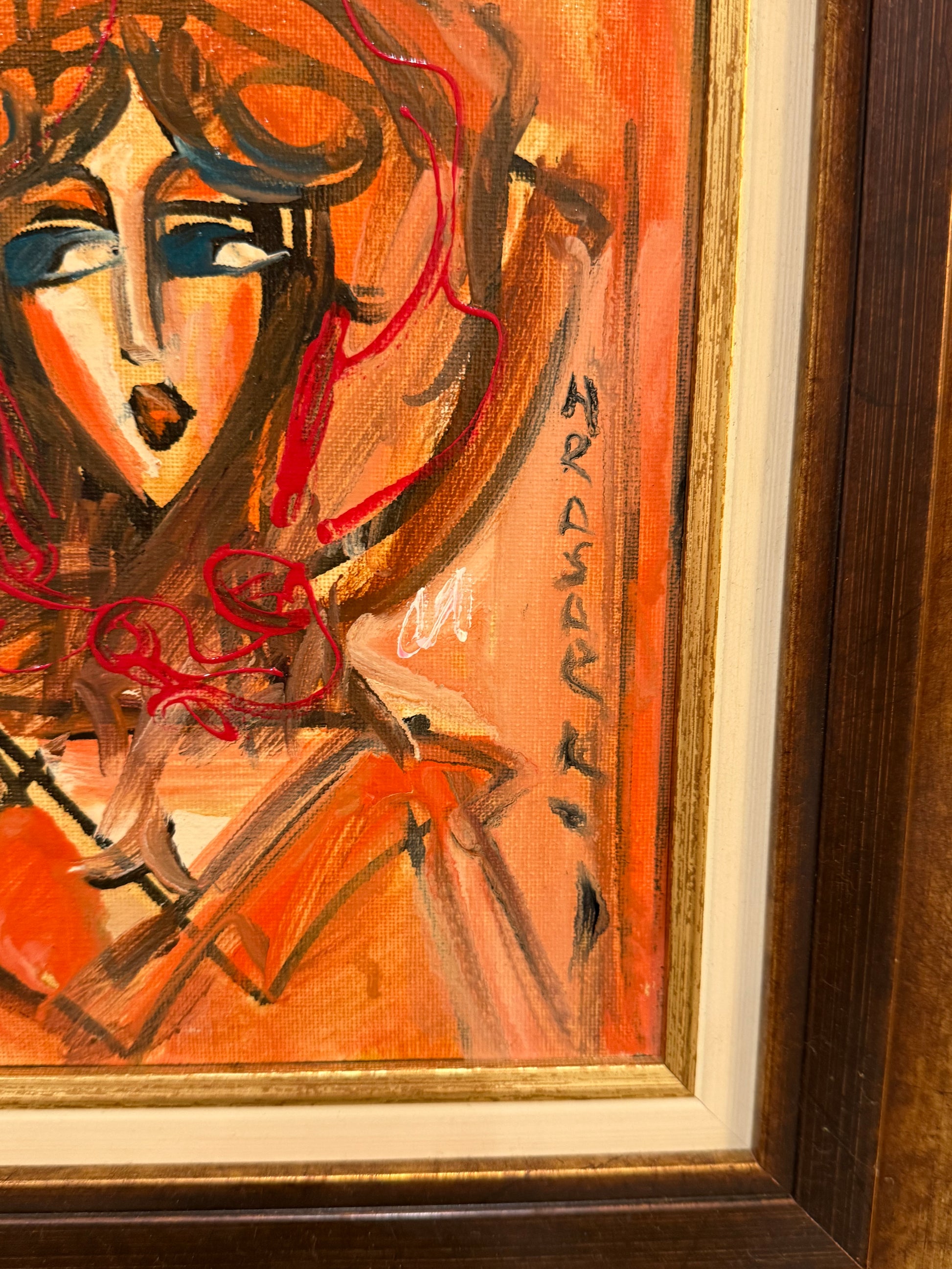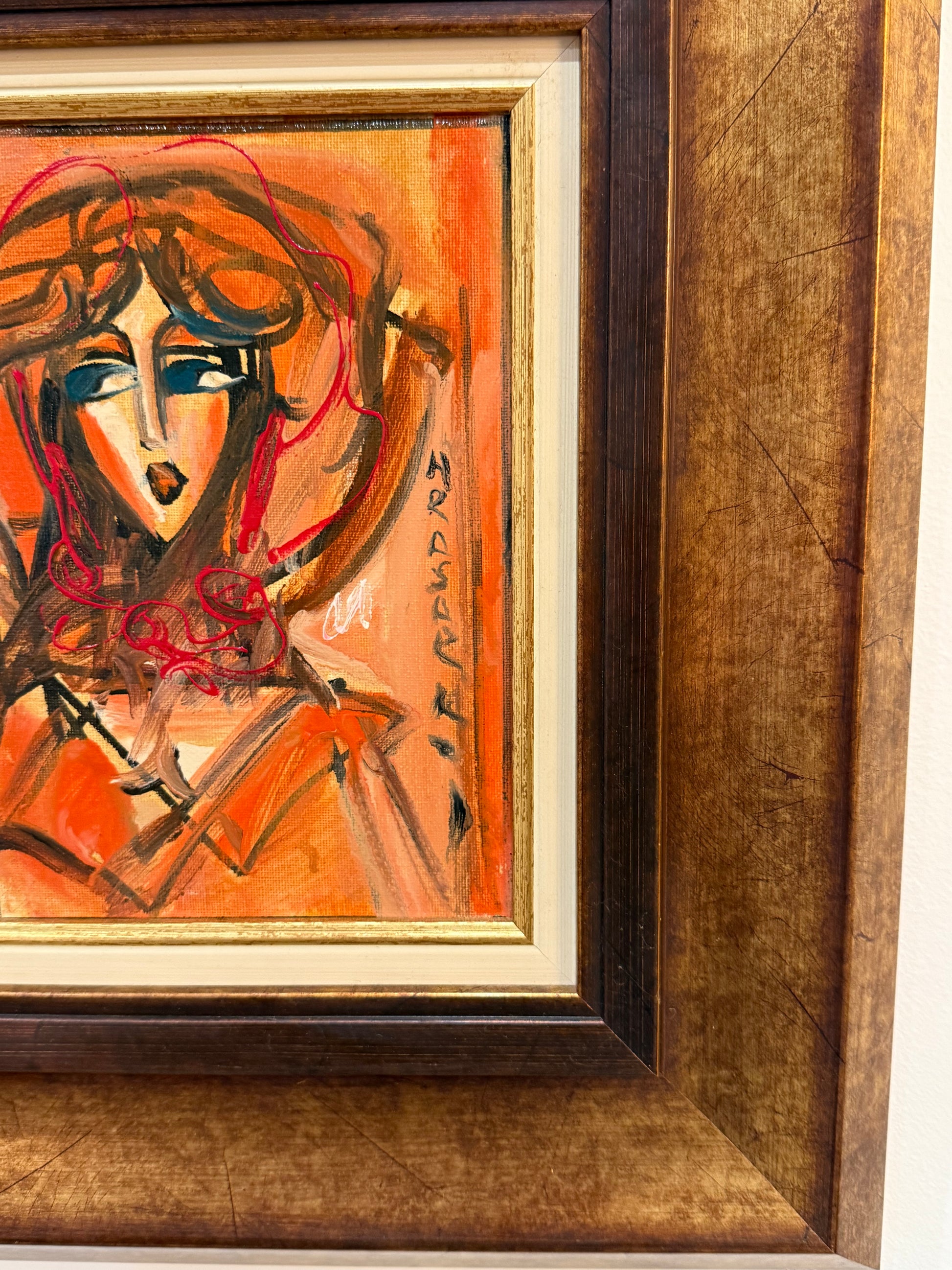 Ce tableau représente un portrait stylisé de femme, aux traits anguleux et yeux très marqués, dans une palette chaude de tons orangés et rouges. L’expression est à la fois théâtrale et énigmatique. La chevelure foisonnante entoure le visage avec des traits libres, presque calligraphiques. Ce style évoque l’univers de la femme muse, très présent dans certaines écoles modernes d’Europe de l’Est.