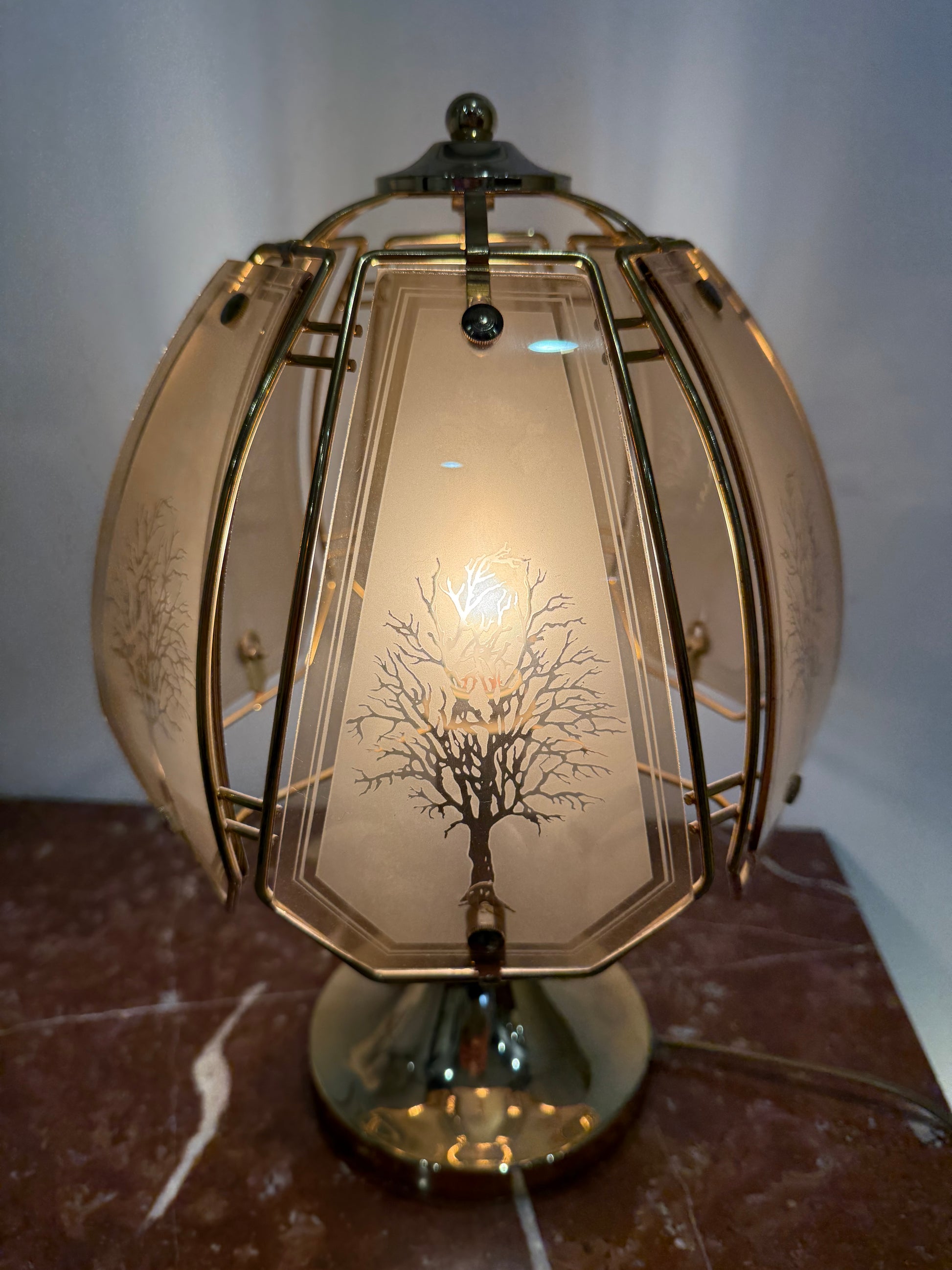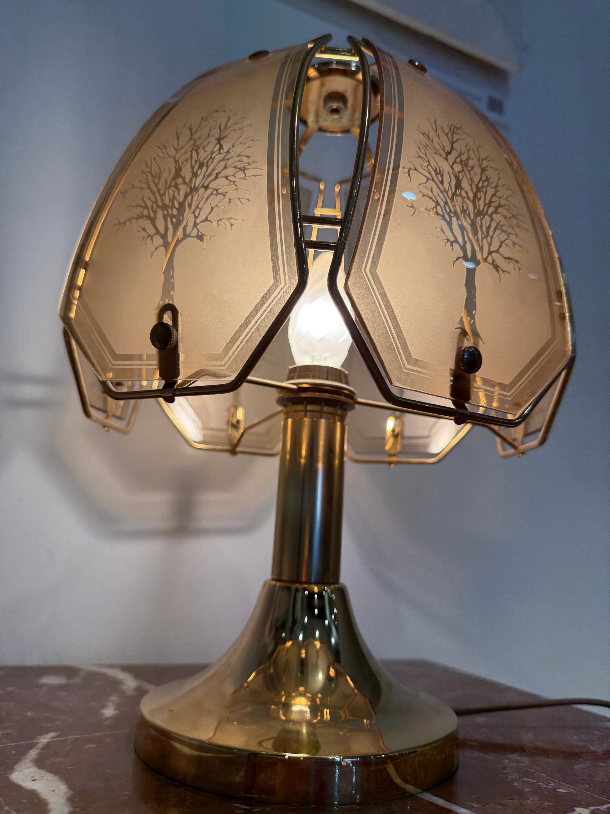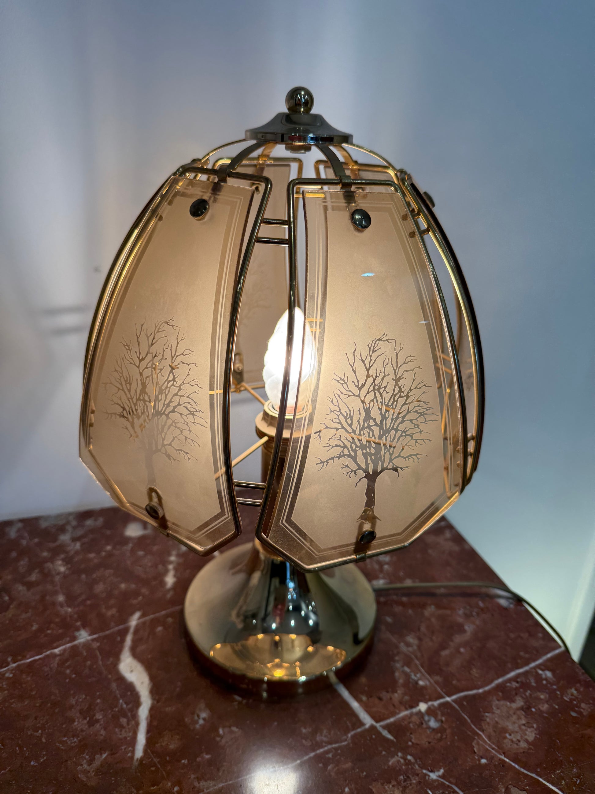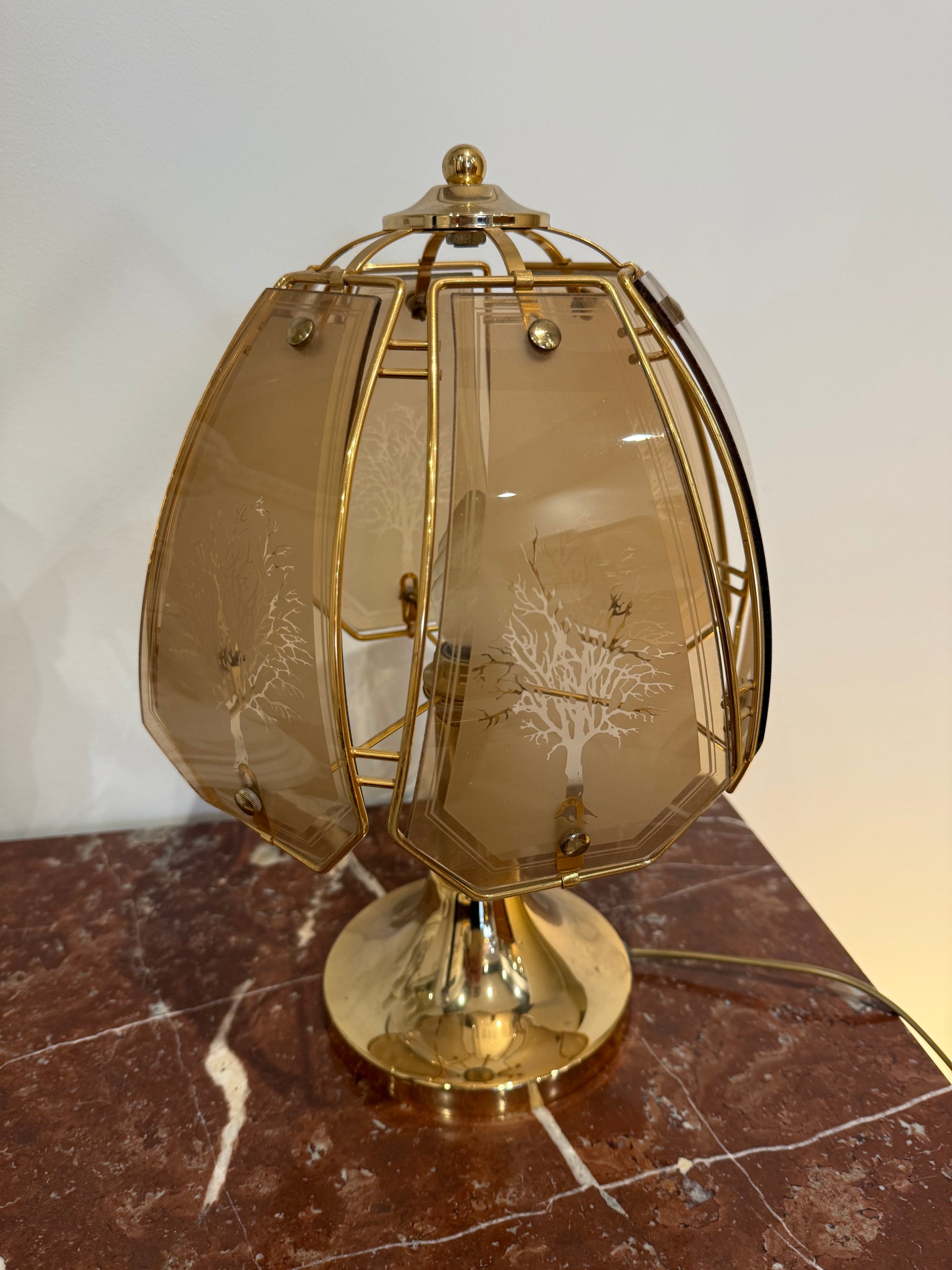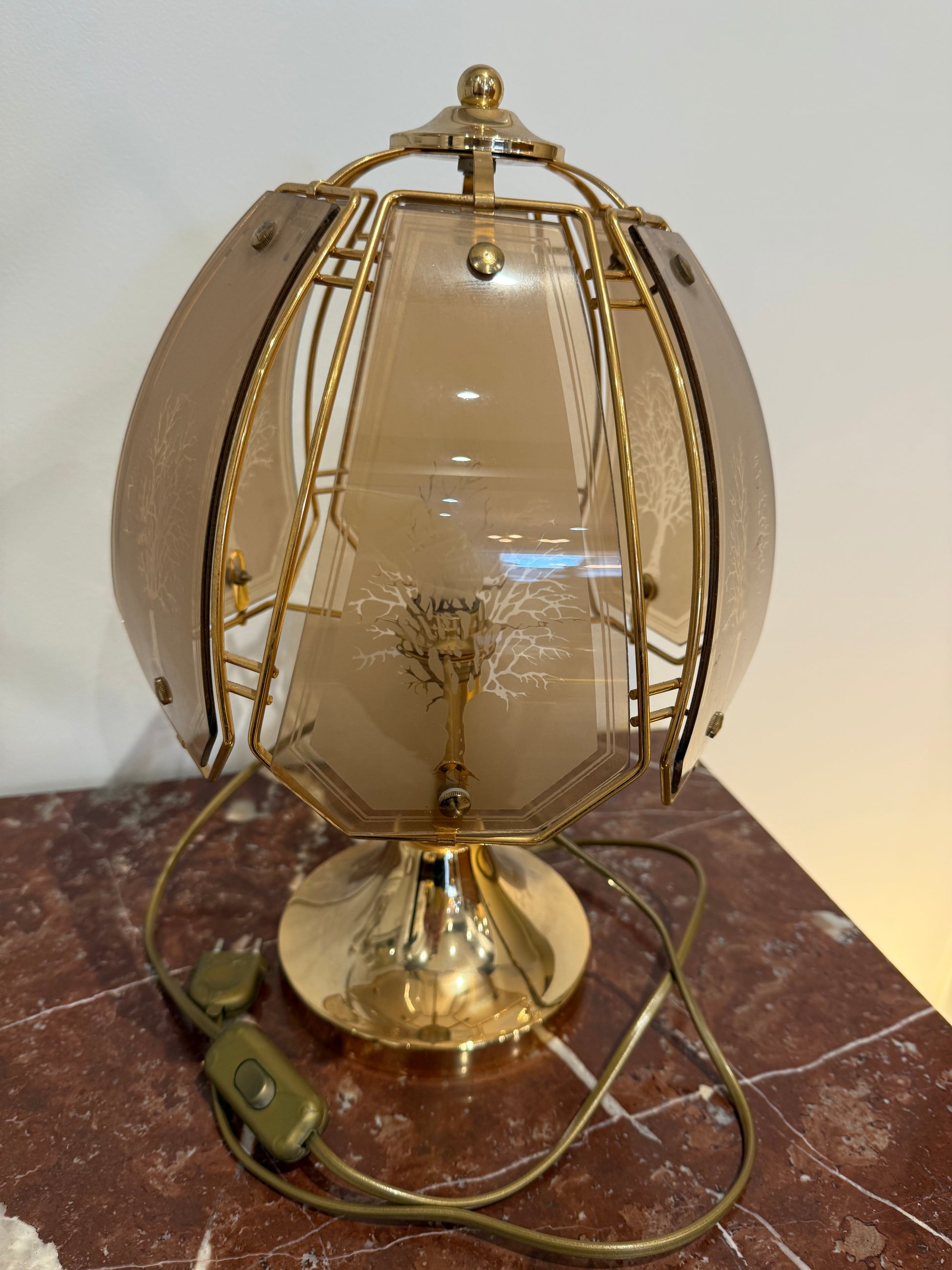 Sublimez votre intérieur avec cette lampe vintage en laiton et verre gravé, au design inspiré de l’Art Déco. Son abat-jour original est composé de panneaux de verre fumé aux motifs d’arbres gravés, créant une ambiance tamisée et élégante.