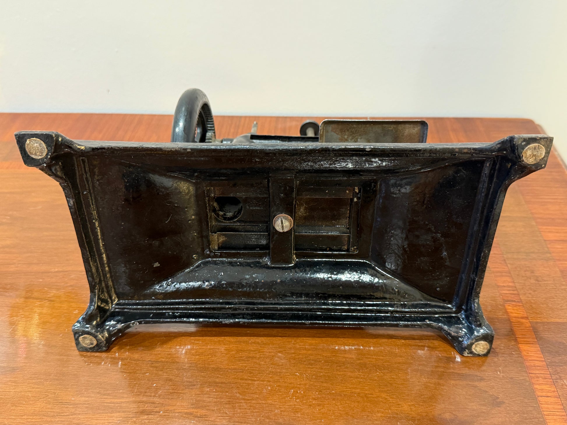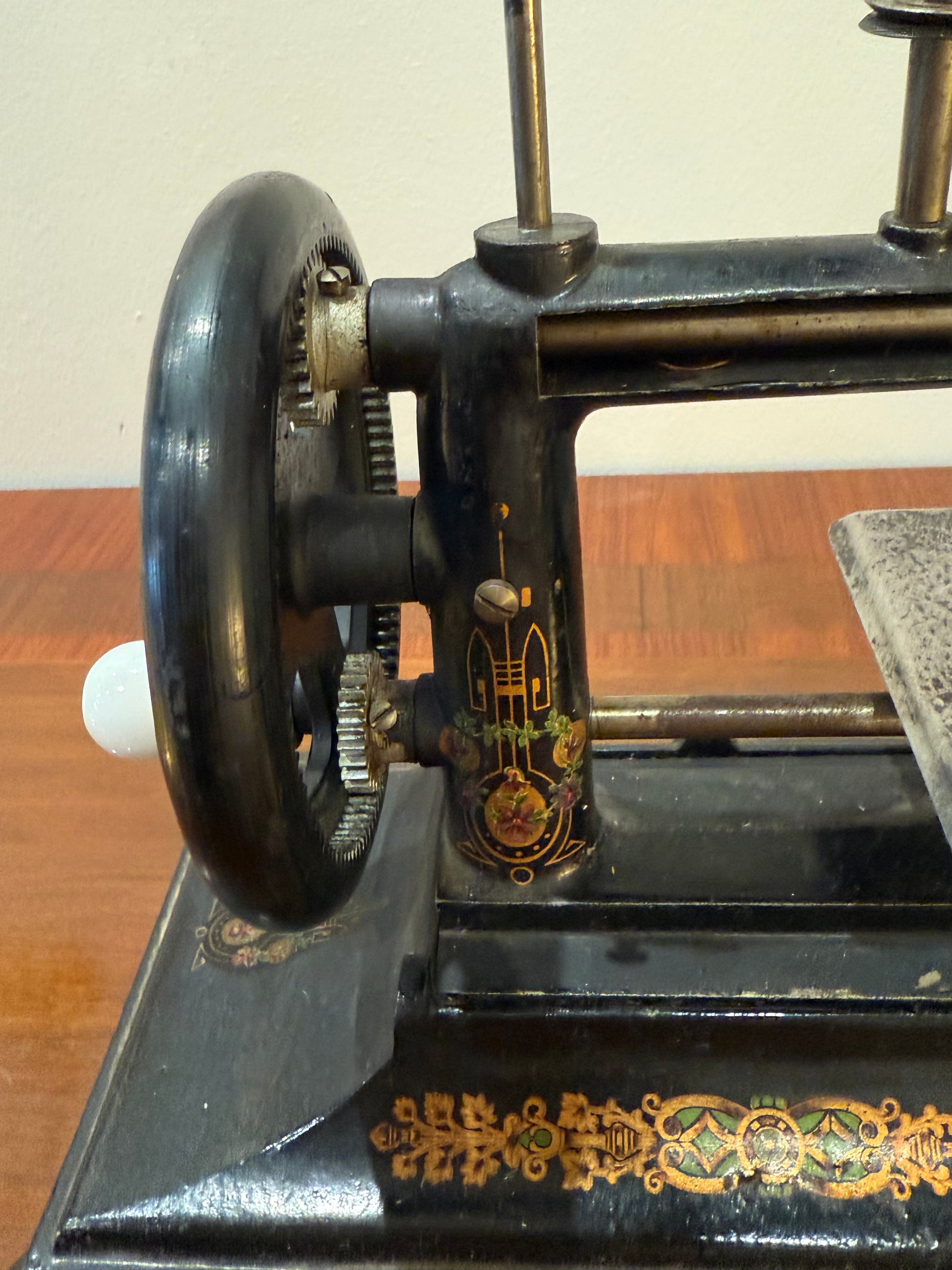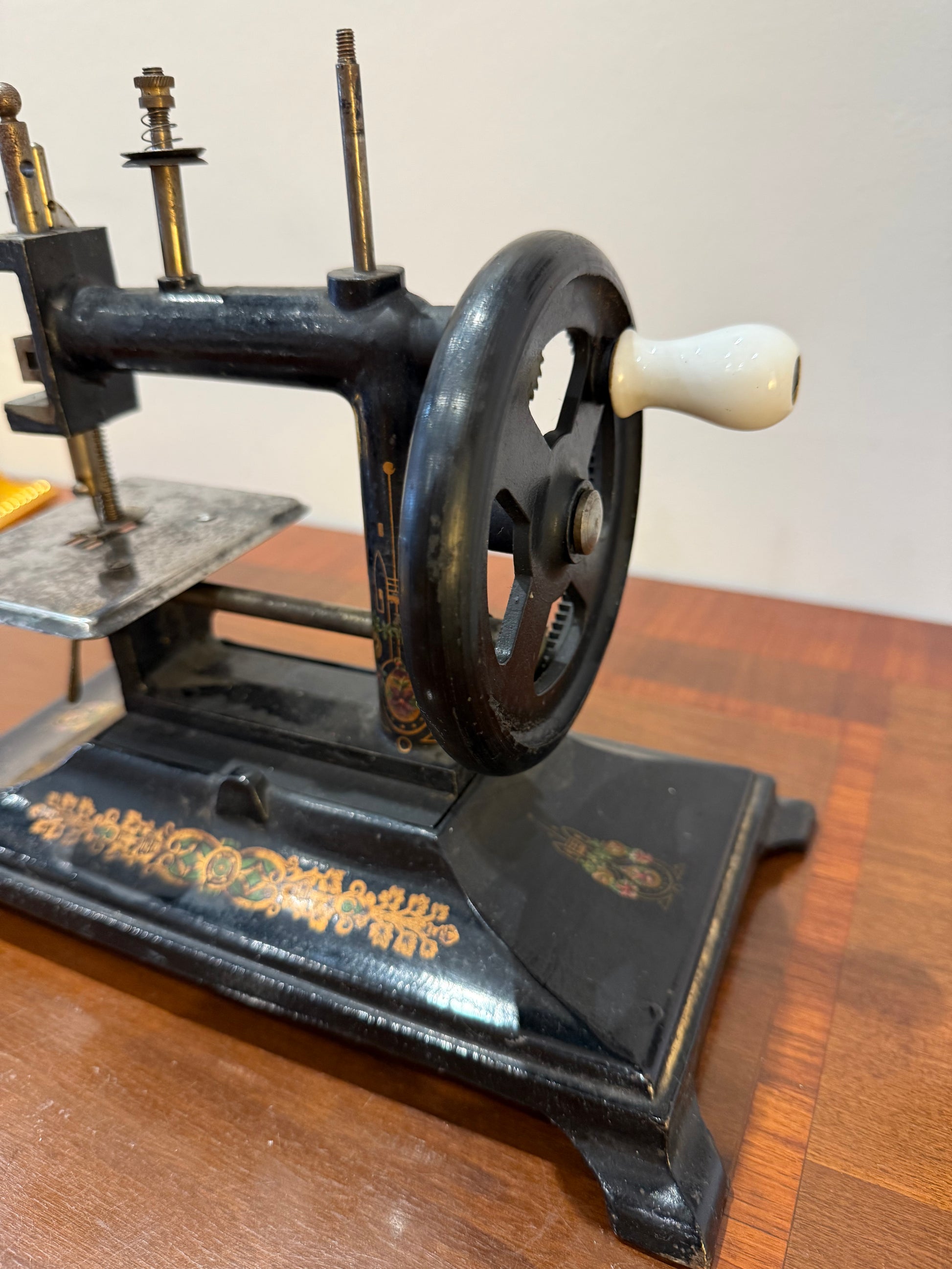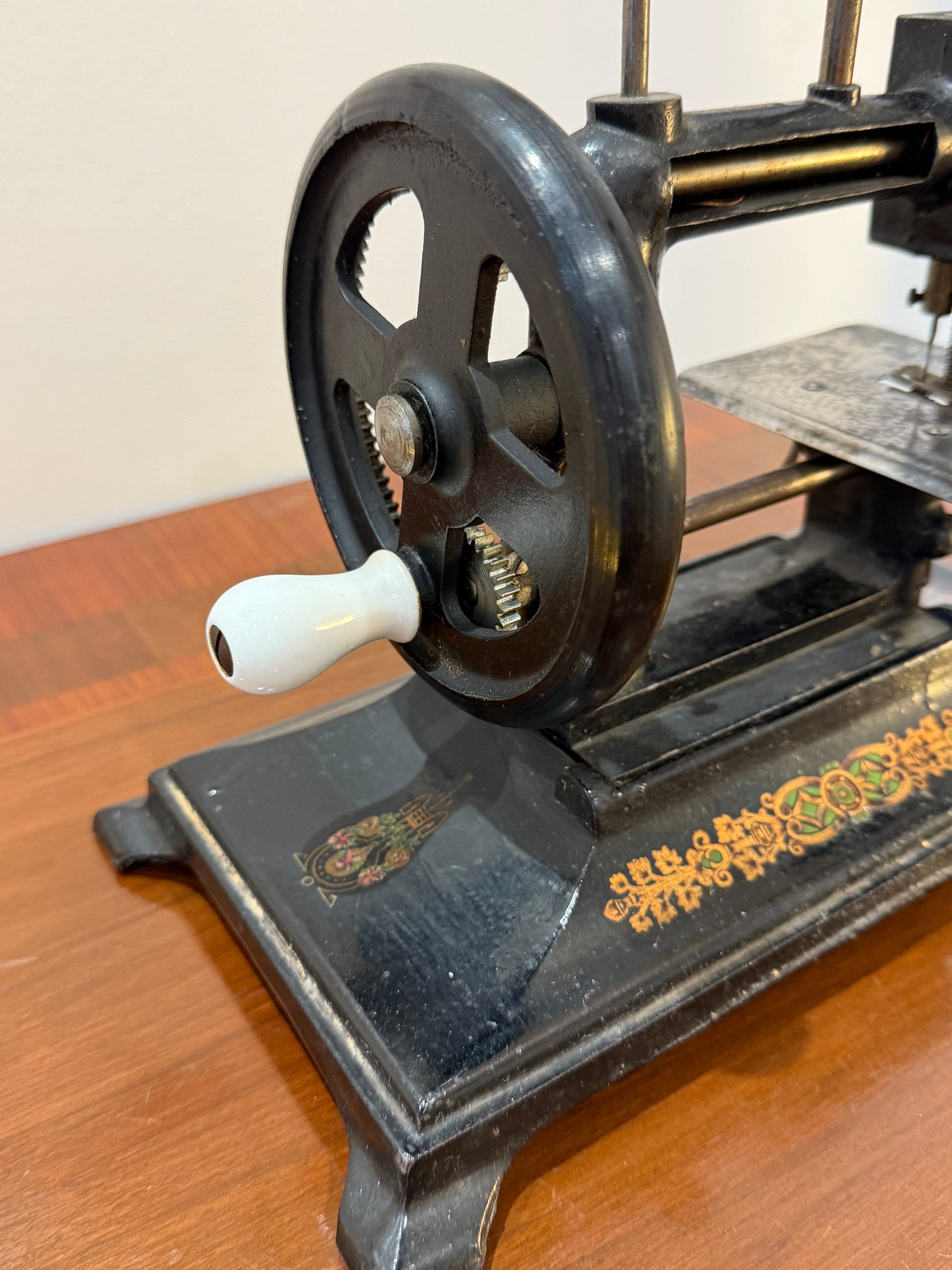 Superbe machine à coudre miniature ancienne, probablement datant de la fin du XIXᵉ ou début du XXᵉ siècle. Cette pièce de collection, en fonte noire ornée de motifs dorés, reprend l’esthétique des grandes machines à coudre de l’époque avec son volant manuel et sa manivelle en porcelaine.