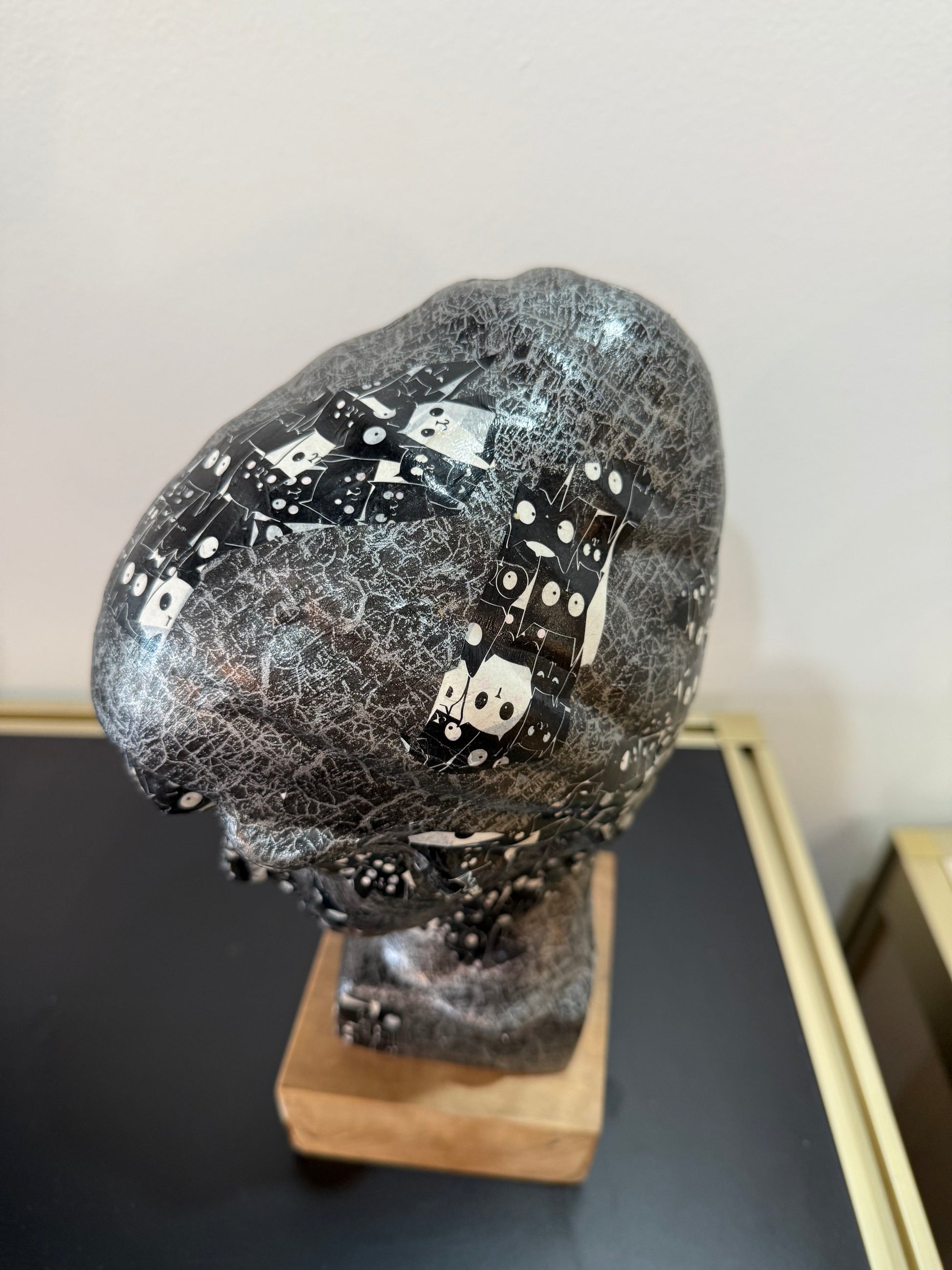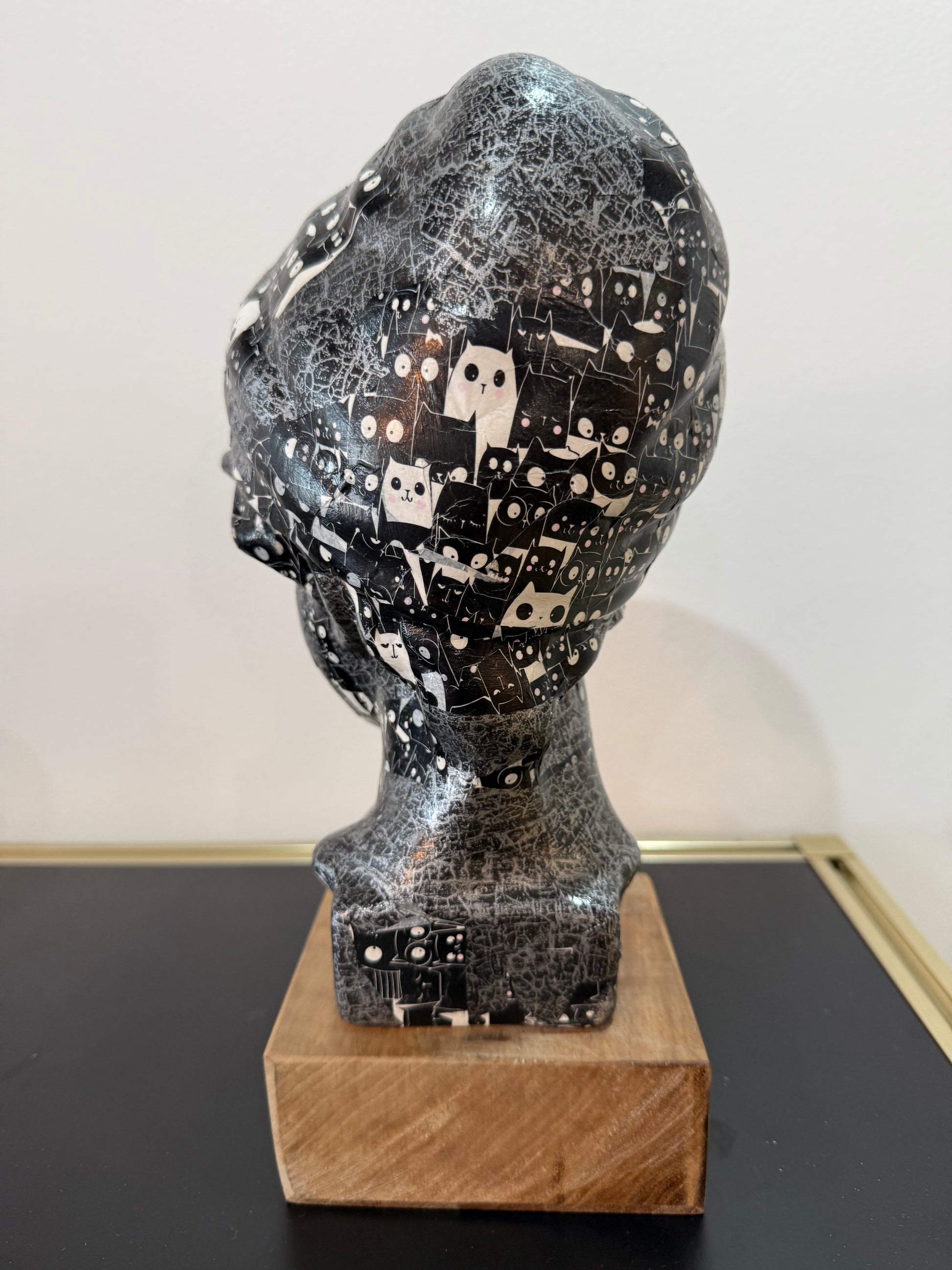 Apportez une touche artistique et décalée à votre intérieur avec ce buste sculpté en céramique, recouvert d’un collage de motifs modernes représentant des chats noirs stylisés sur fond noir et blanc. L’effet visuel est accentué par une finition craquelée brillante, lui conférant un aspect volontairement vieilli et original. Chaque angle révèle de nouveaux détails, entre humour graphique et allure design.