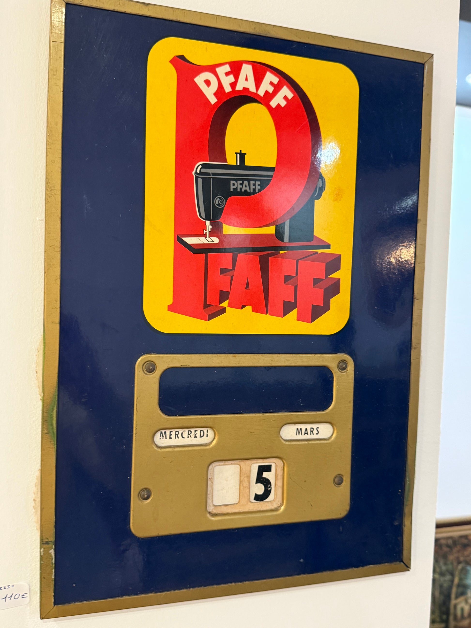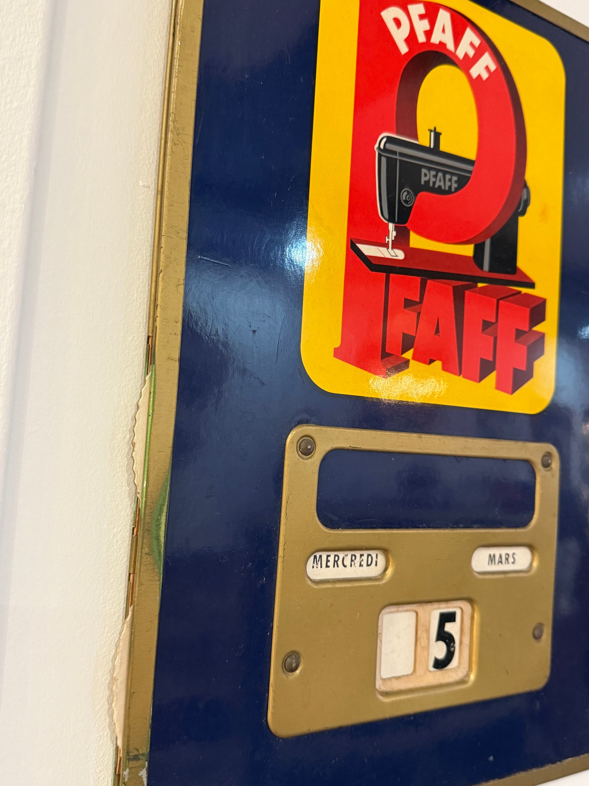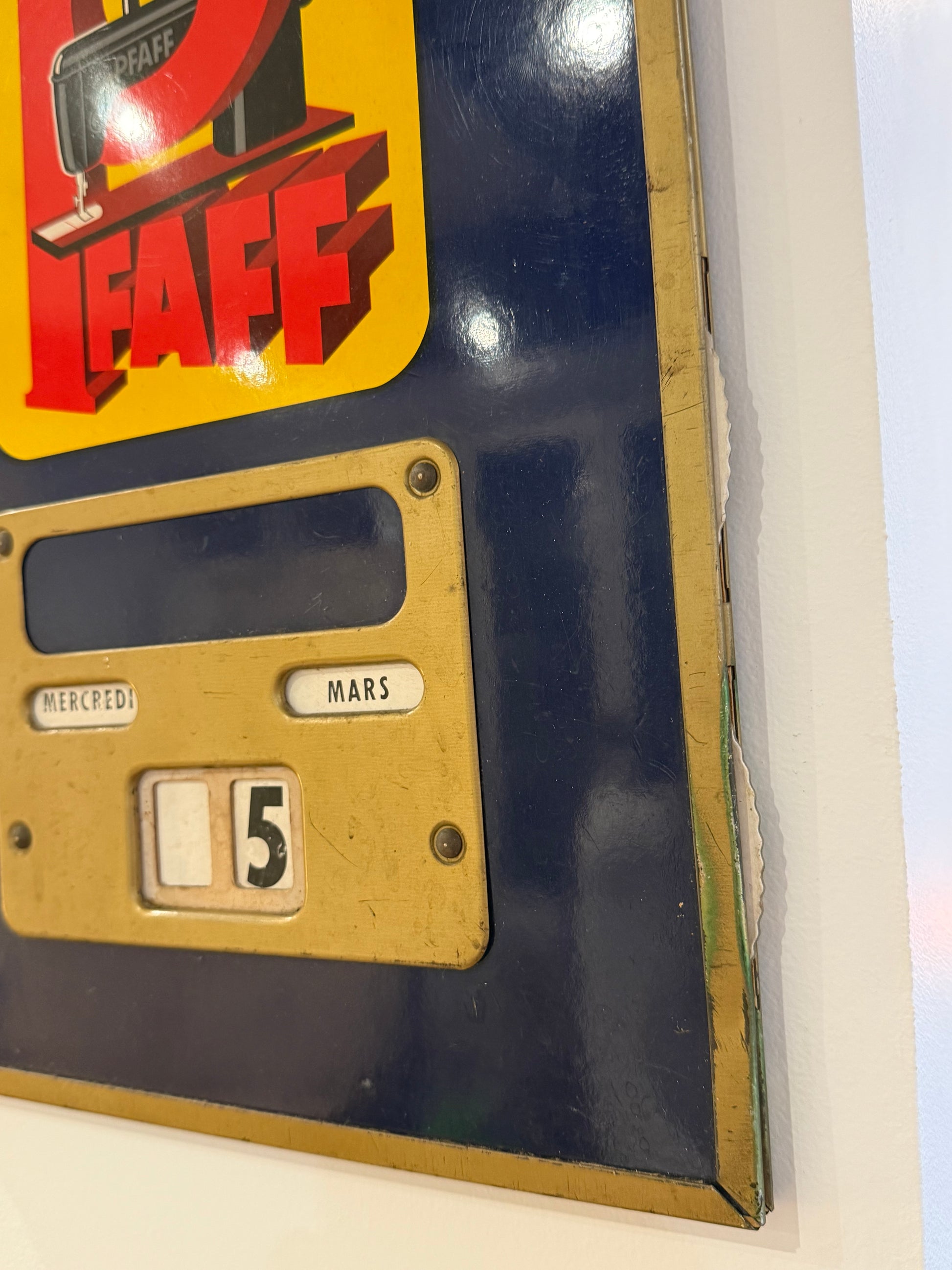 Calendrier perpétuel publicitaire émaillé de la marque PFAFF, conçu par Carl Ph. Schmidt à Kaiserslautern, Allemagne. Datant du milieu du XXe siècle, cet objet rare présente un design emblématique mettant en avant une machine à coudre PFAFF sur un fond bleu et jaune vif, avec des détails en rouge et une finition émaillée brillante.