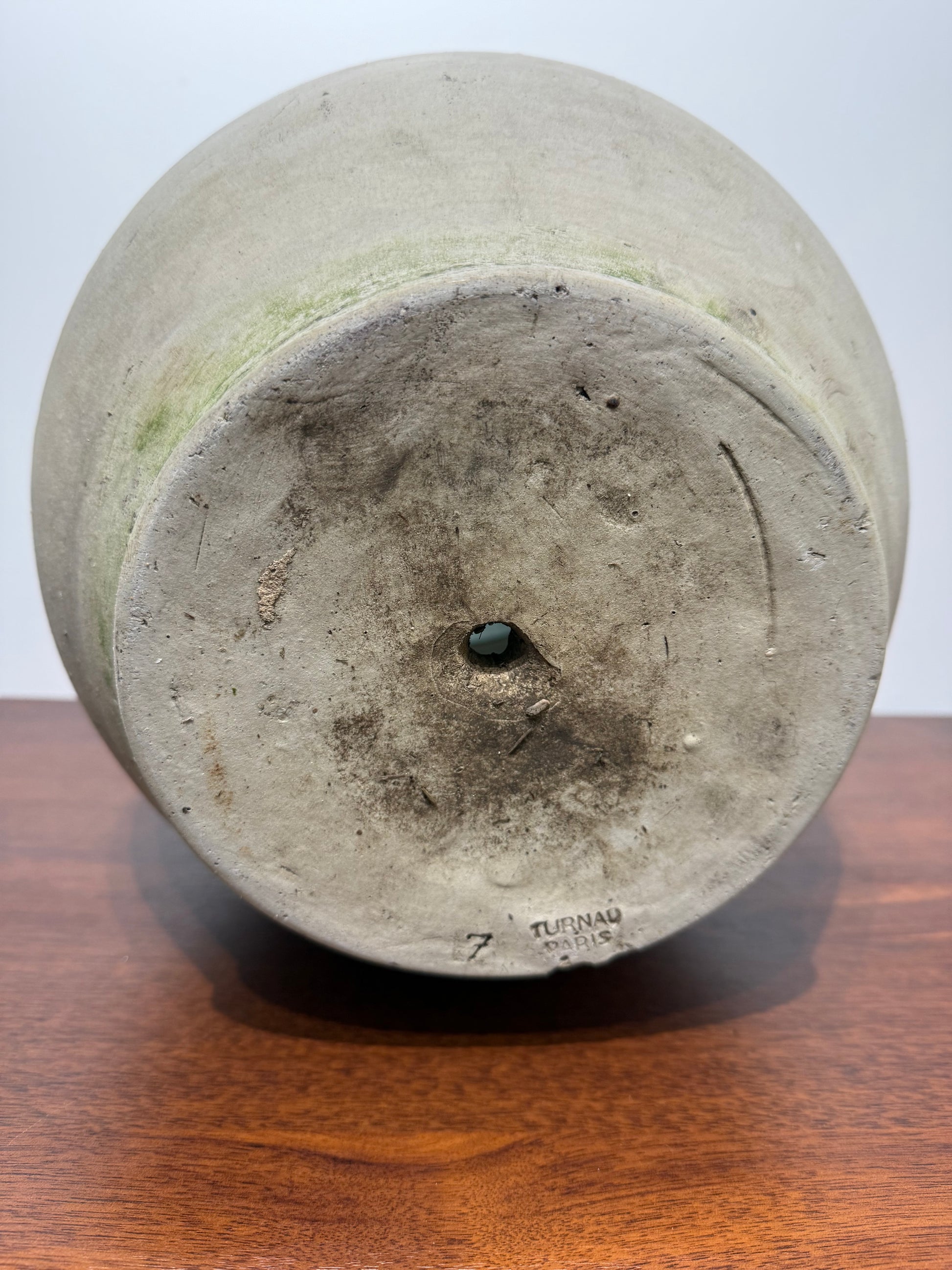 Superbe vase en céramique signé Turnau Paris, un modèle authentique à l’esthétique épurée et intemporelle. Ce vase se distingue par son contraste harmonieux entre la céramique brute de la partie inférieure et l’émail vert brillant de la partie supérieure, offrant une touche artisanale et élégante.