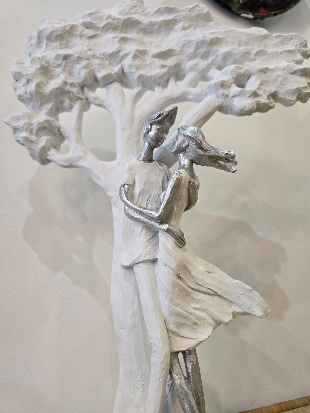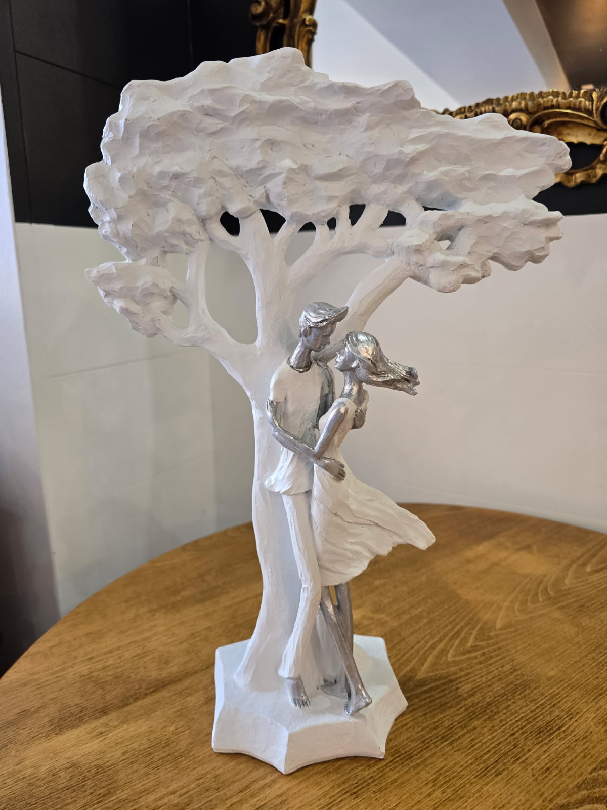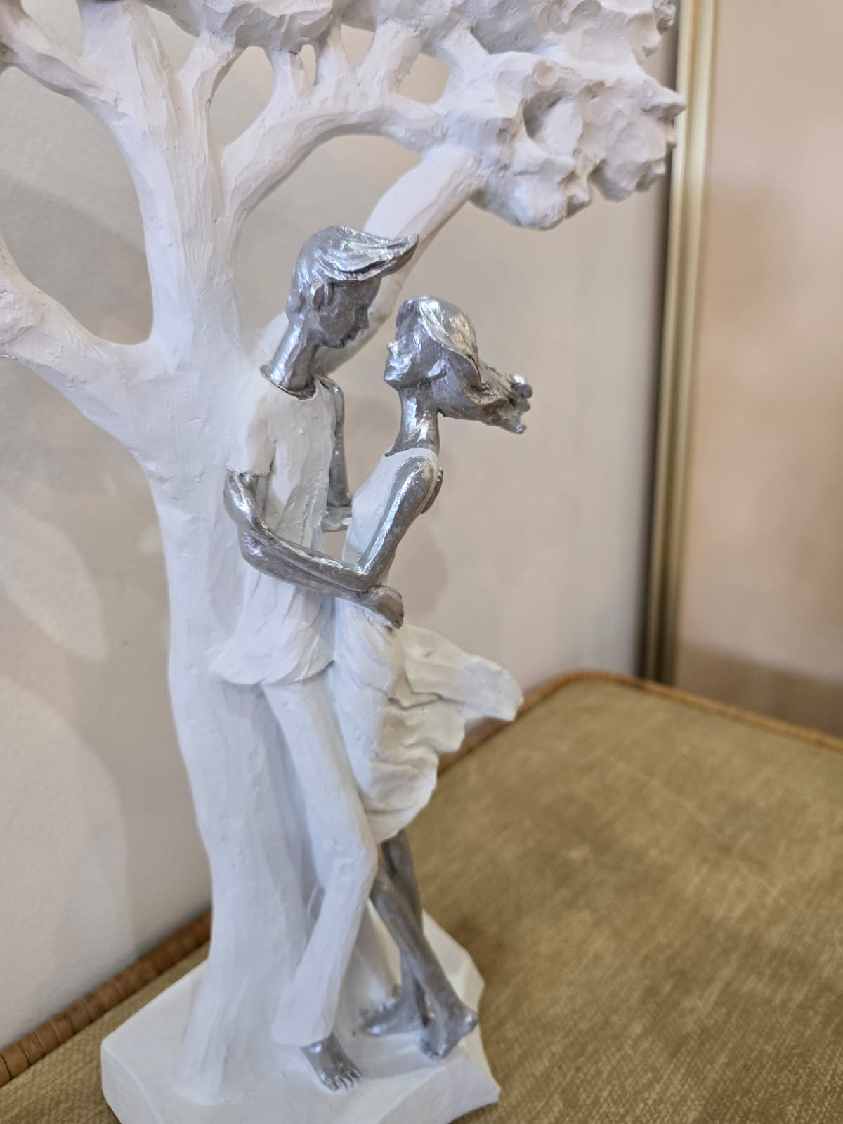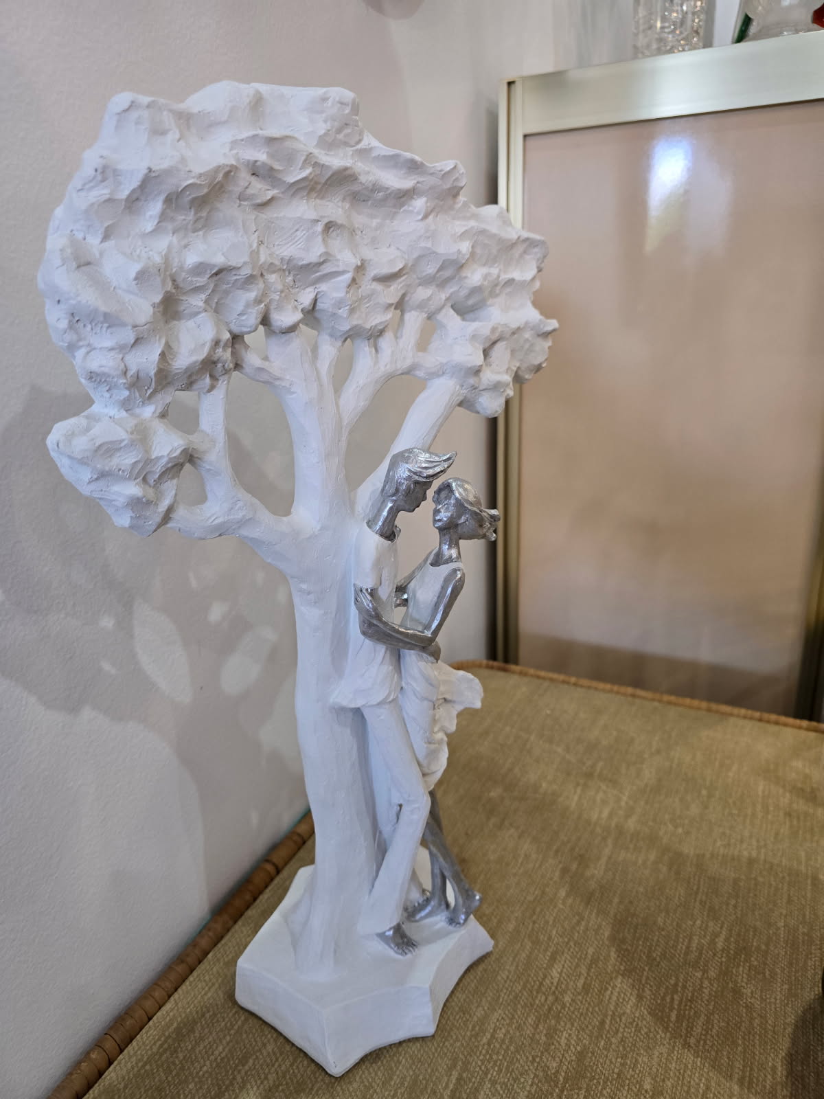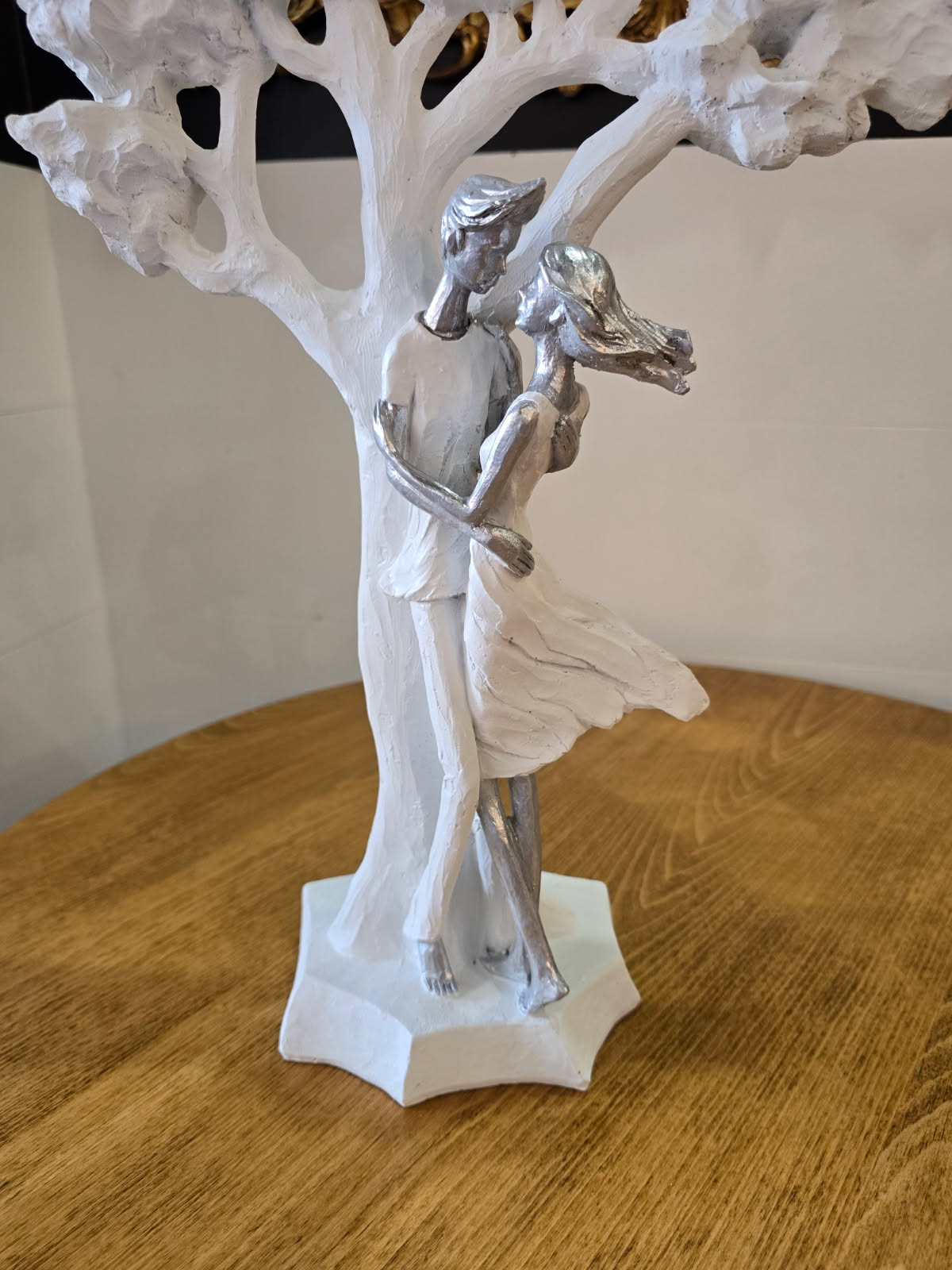 La sculpture « Regards d'amour » est un objet figuratif qui crée une atmosphère particulière dans n'importe quelle pièce en tant que figure décorative et élément décoratif. Cette figurine d'art est fabriquée en résine synthétique et impressionne par sa couleur blanche avec des accents argentés qui ont un aspect mat et métallique. La forme de la sculpture montre un couple allongé dans les bras l'un de l'autre, amoureux et protégé sous un arbre. Avec une hauteur de 44 cm, une largeur de 32 cm et une profondeur de 13 cm, cette sculpture est une œuvre d'art qui sera du plus bel effet sur un buffet ou décorativement sur une cheminée. La sculpture Liebesblicke est équipée de patins en feutre pour protéger les surfaces des meubles et permettre un placement sûr. Cet élément décoratif est idéal pour tous ceux qui souhaitent ajouter une touche élégante et émotionnelle à leur intérieur.