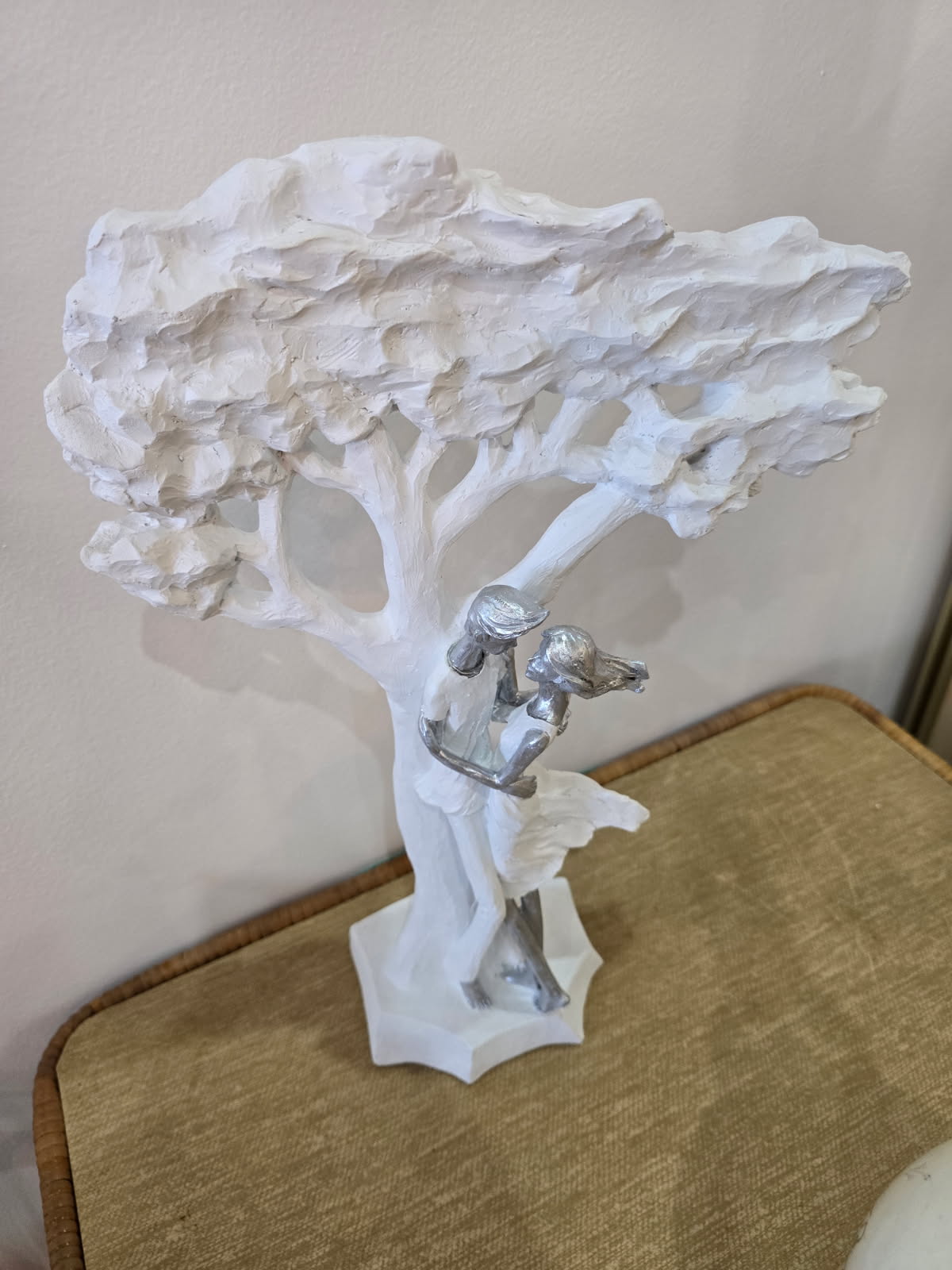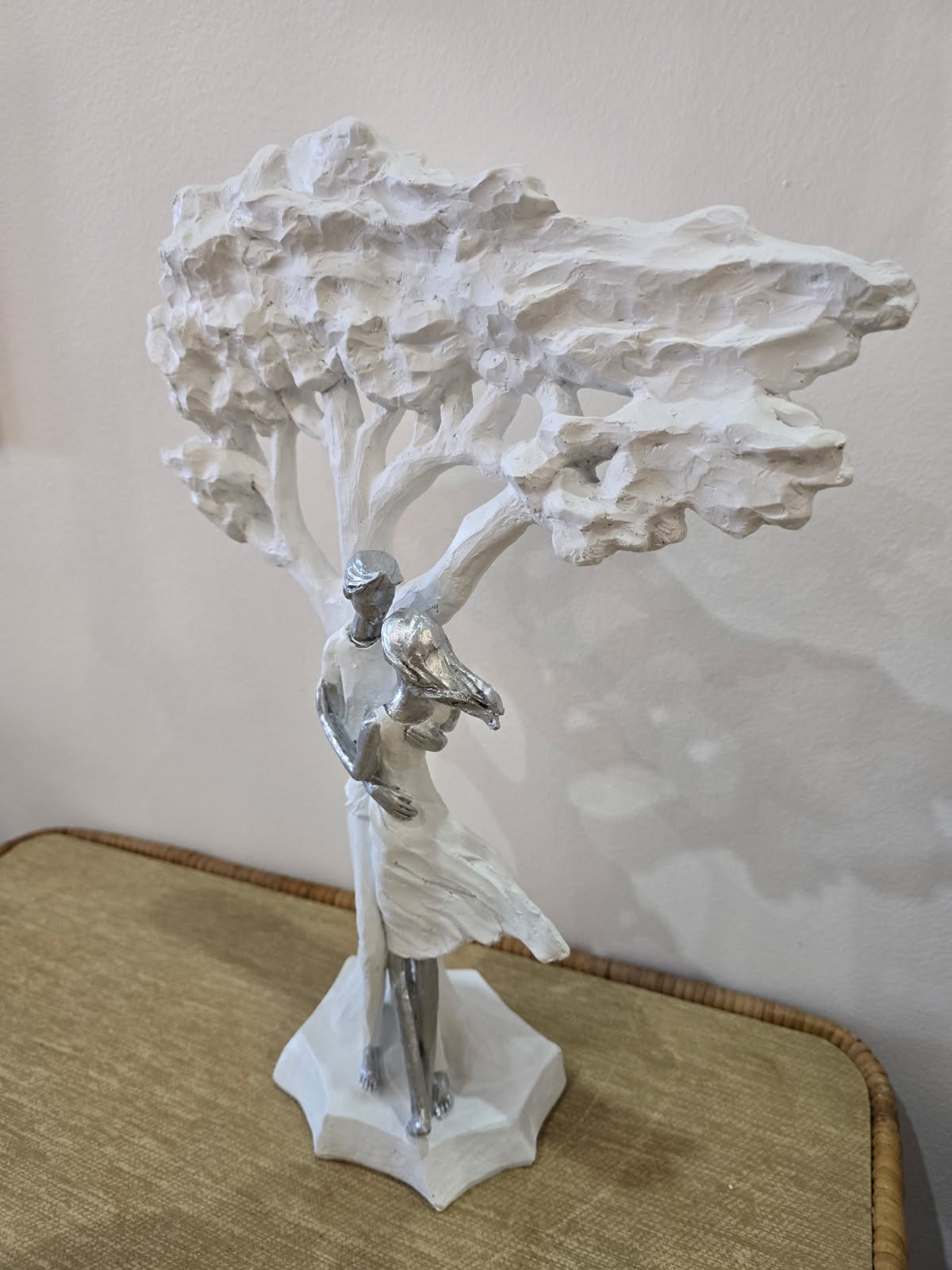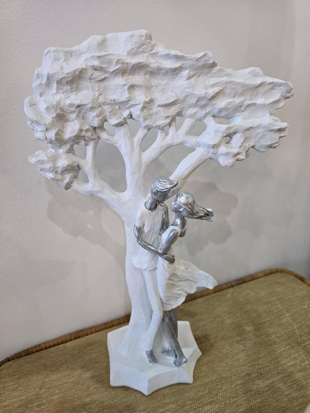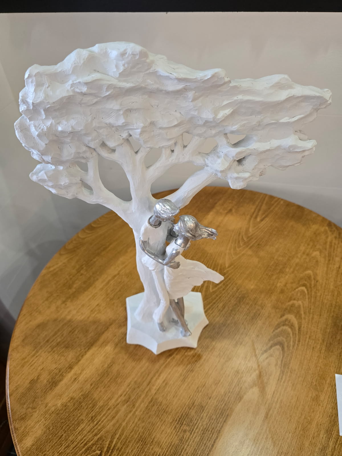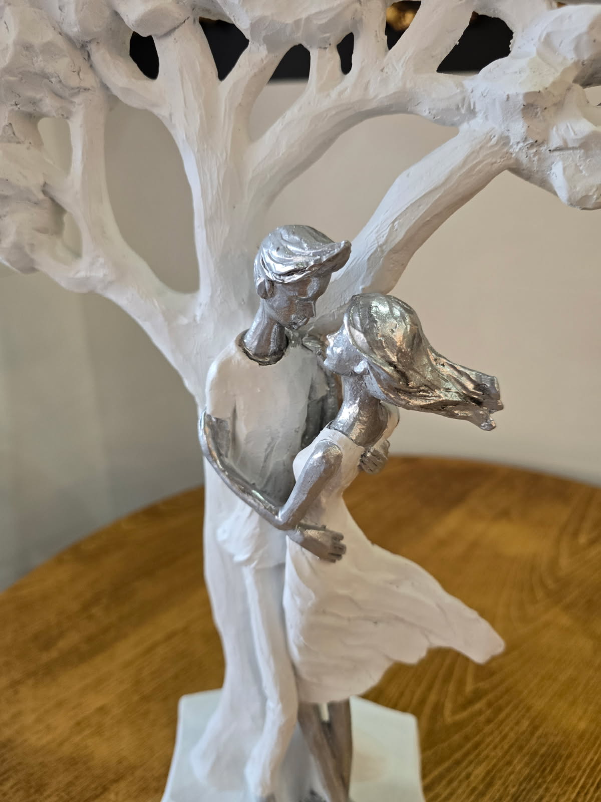 La sculpture « Regards d'amour » est un objet figuratif qui crée une atmosphère particulière dans n'importe quelle pièce en tant que figure décorative et élément décoratif. Cette figurine d'art est fabriquée en résine synthétique et impressionne par sa couleur blanche avec des accents argentés qui ont un aspect mat et métallique. La forme de la sculpture montre un couple allongé dans les bras l'un de l'autre, amoureux et protégé sous un arbre. Avec une hauteur de 44 cm, une largeur de 32 cm et une profondeur de 13 cm, cette sculpture est une œuvre d'art qui sera du plus bel effet sur un buffet ou décorativement sur une cheminée. La sculpture Liebesblicke est équipée de patins en feutre pour protéger les surfaces des meubles et permettre un placement sûr. Cet élément décoratif est idéal pour tous ceux qui souhaitent ajouter une touche élégante et émotionnelle à leur intérieur.