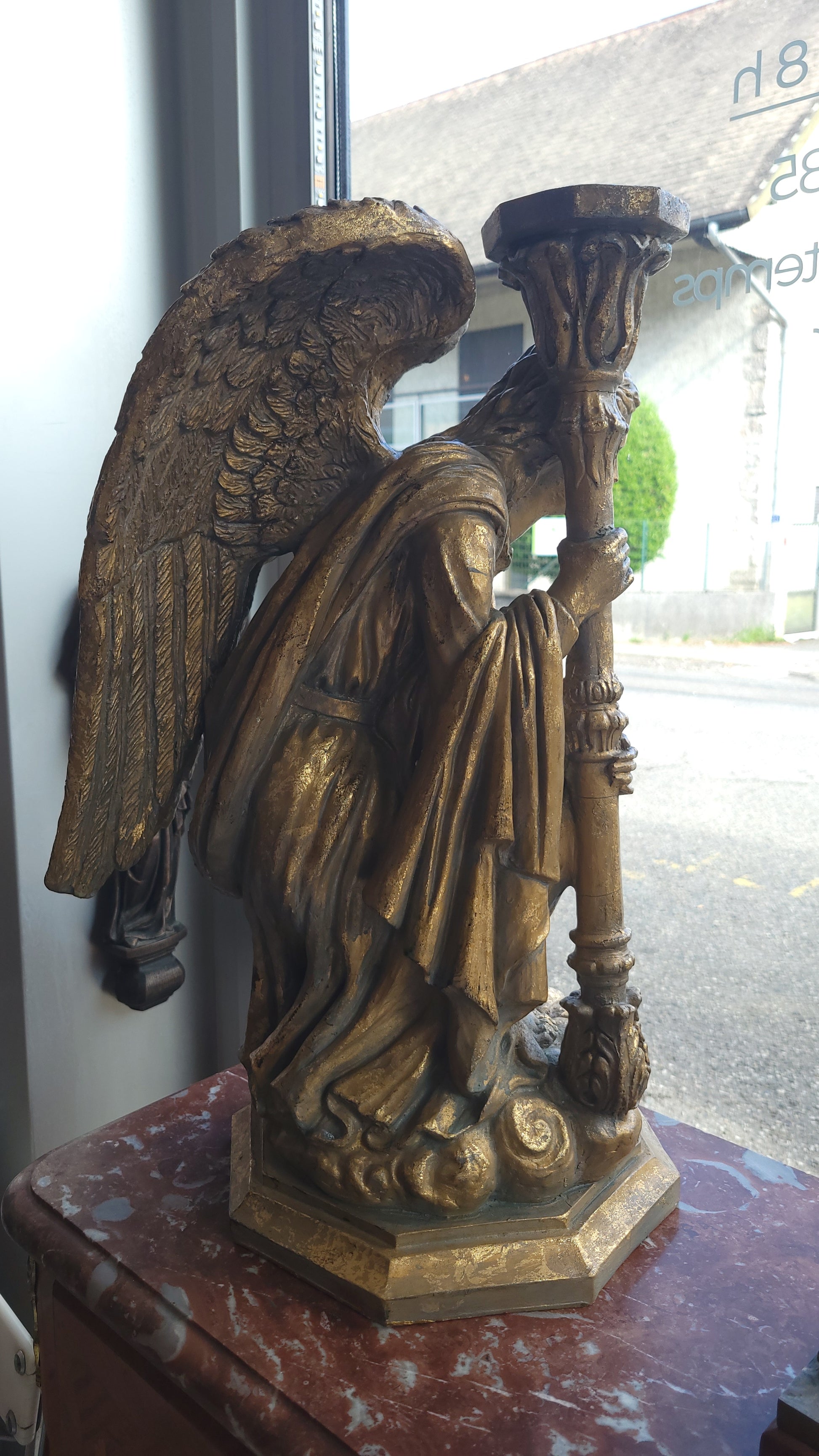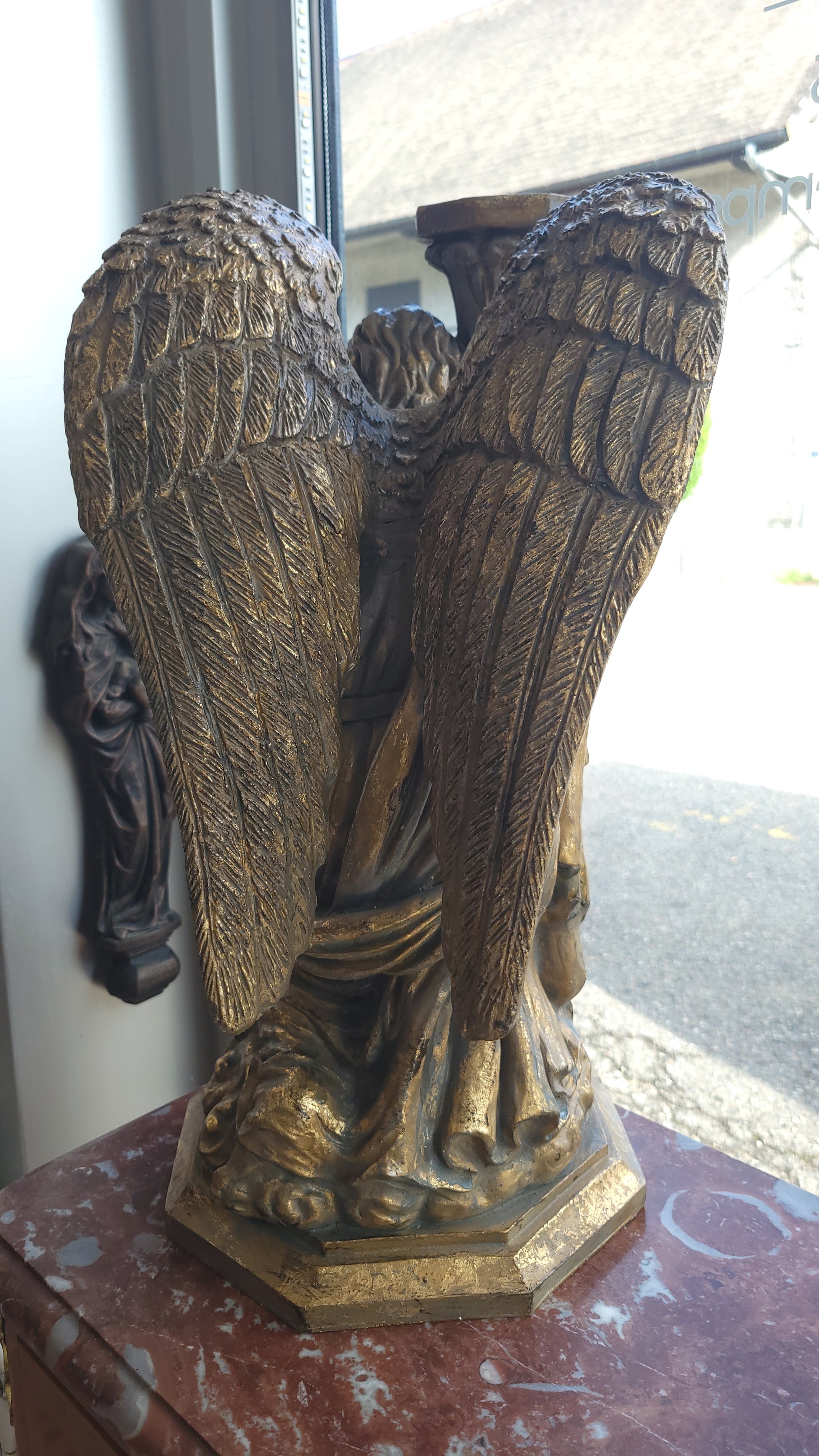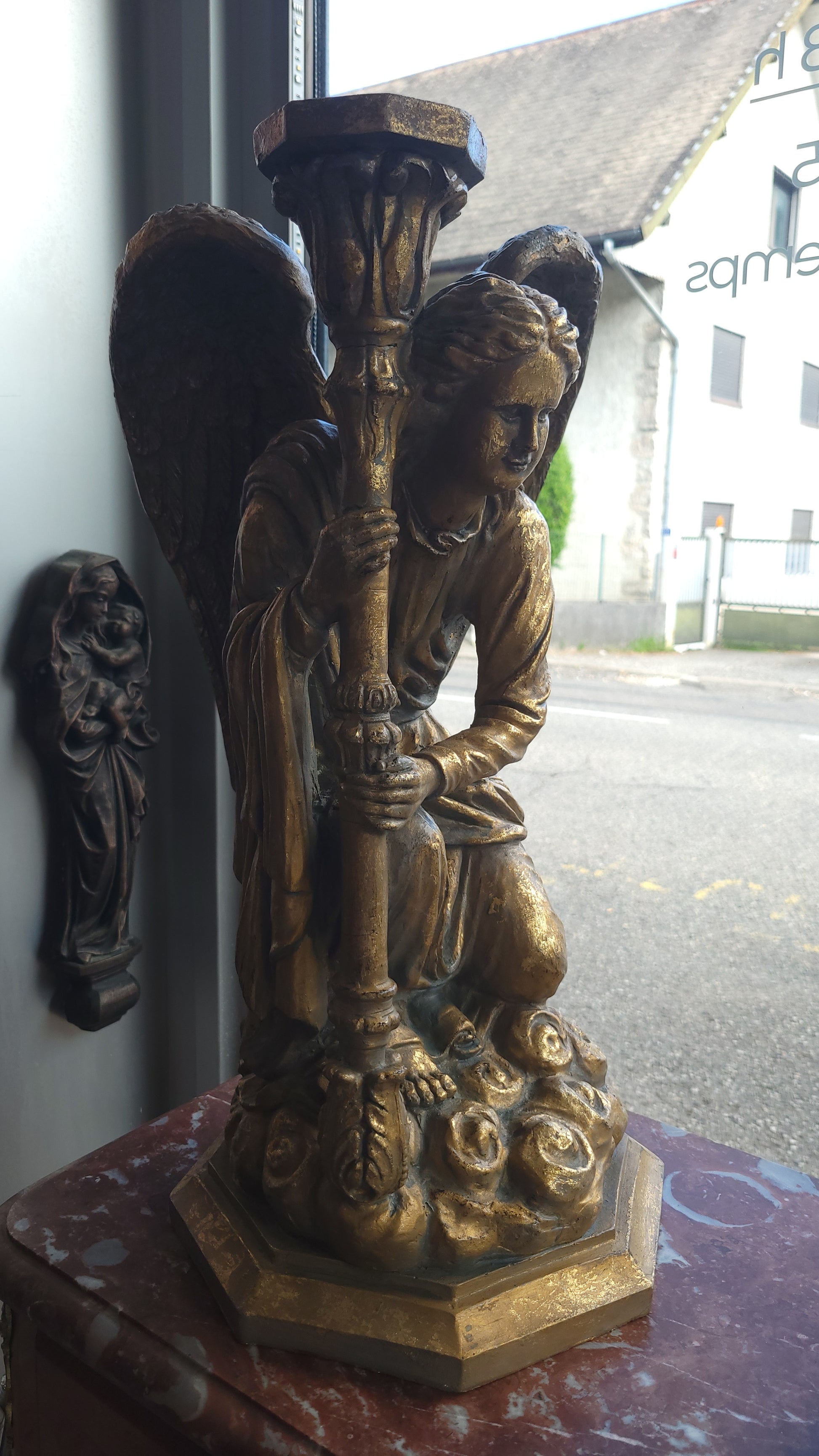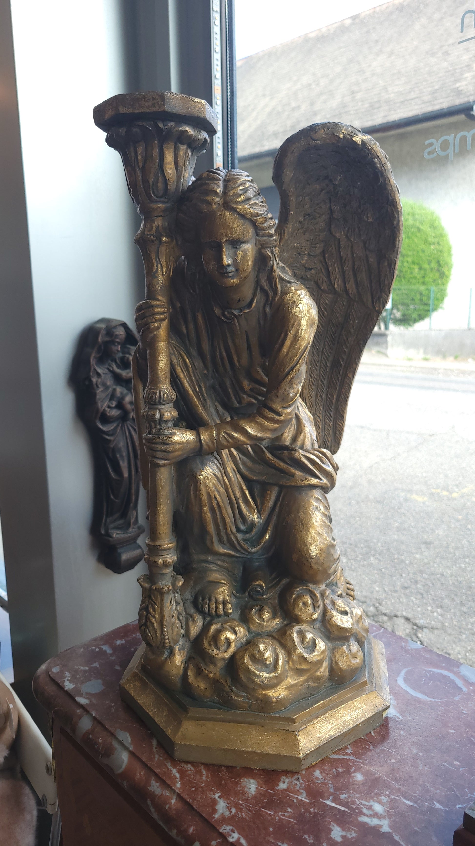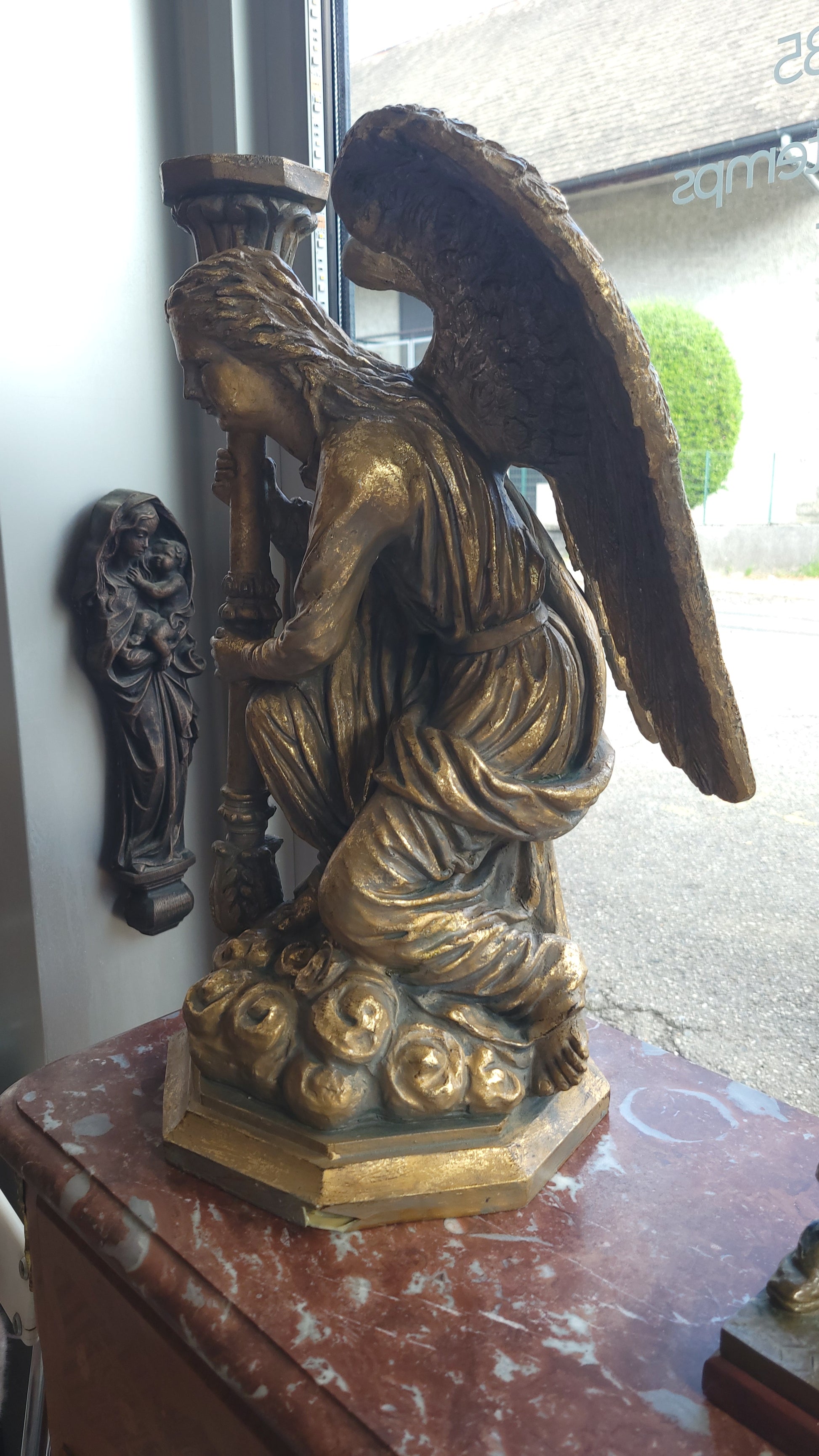Imposante sculpture religieuse représentant un ange agenouillé tenant un candélabre ou support de torche, dans une posture méditative. Cette œuvre date probablement des années 1950, période durant laquelle la résine moulée faisait ses débuts comme alternative au plâtre ou au bronze dans la production de statues décoratives.