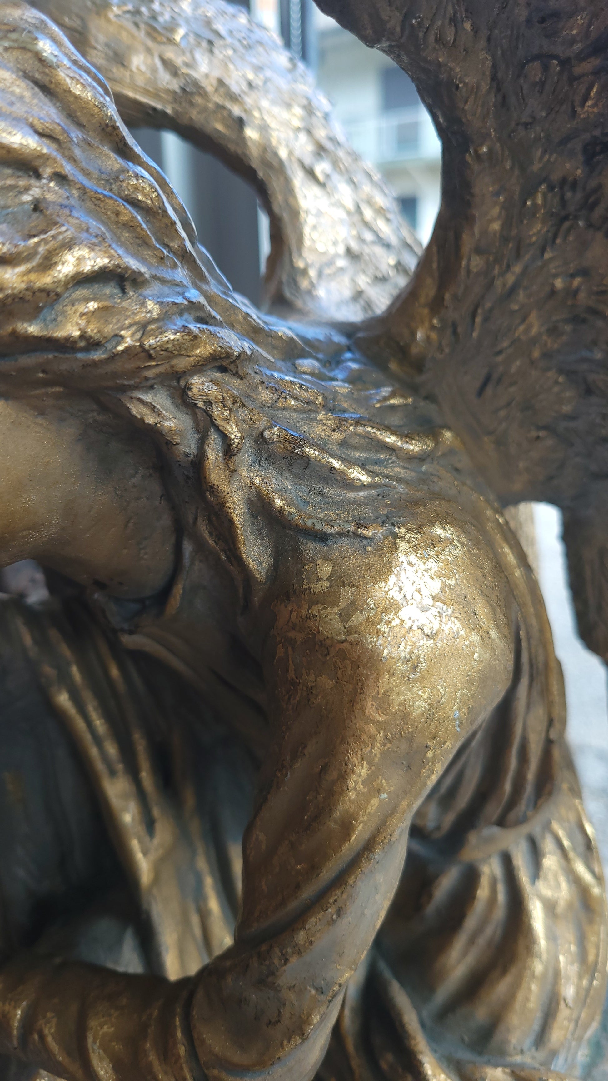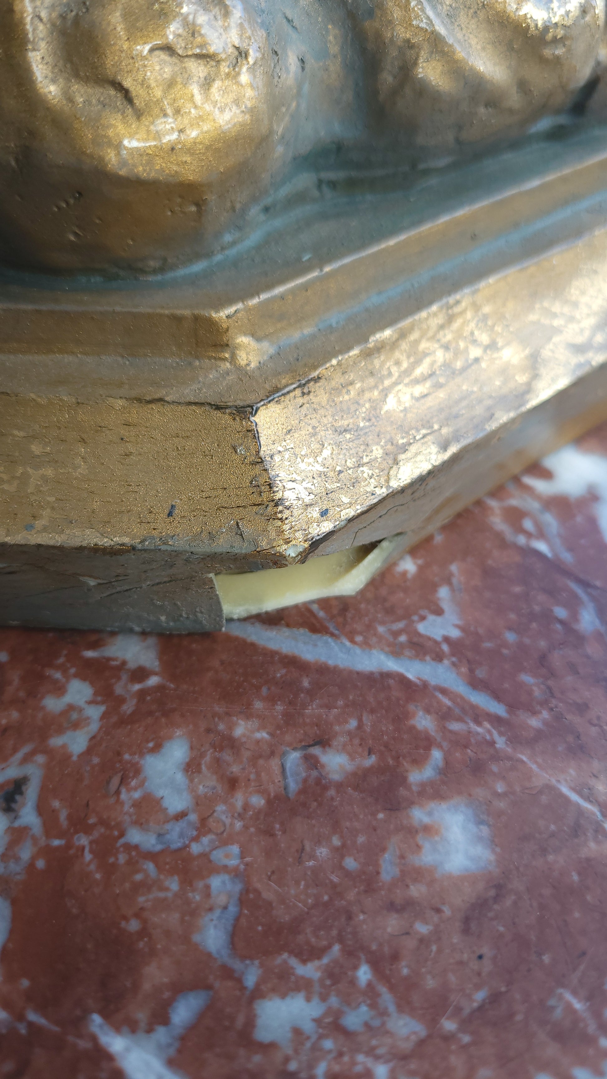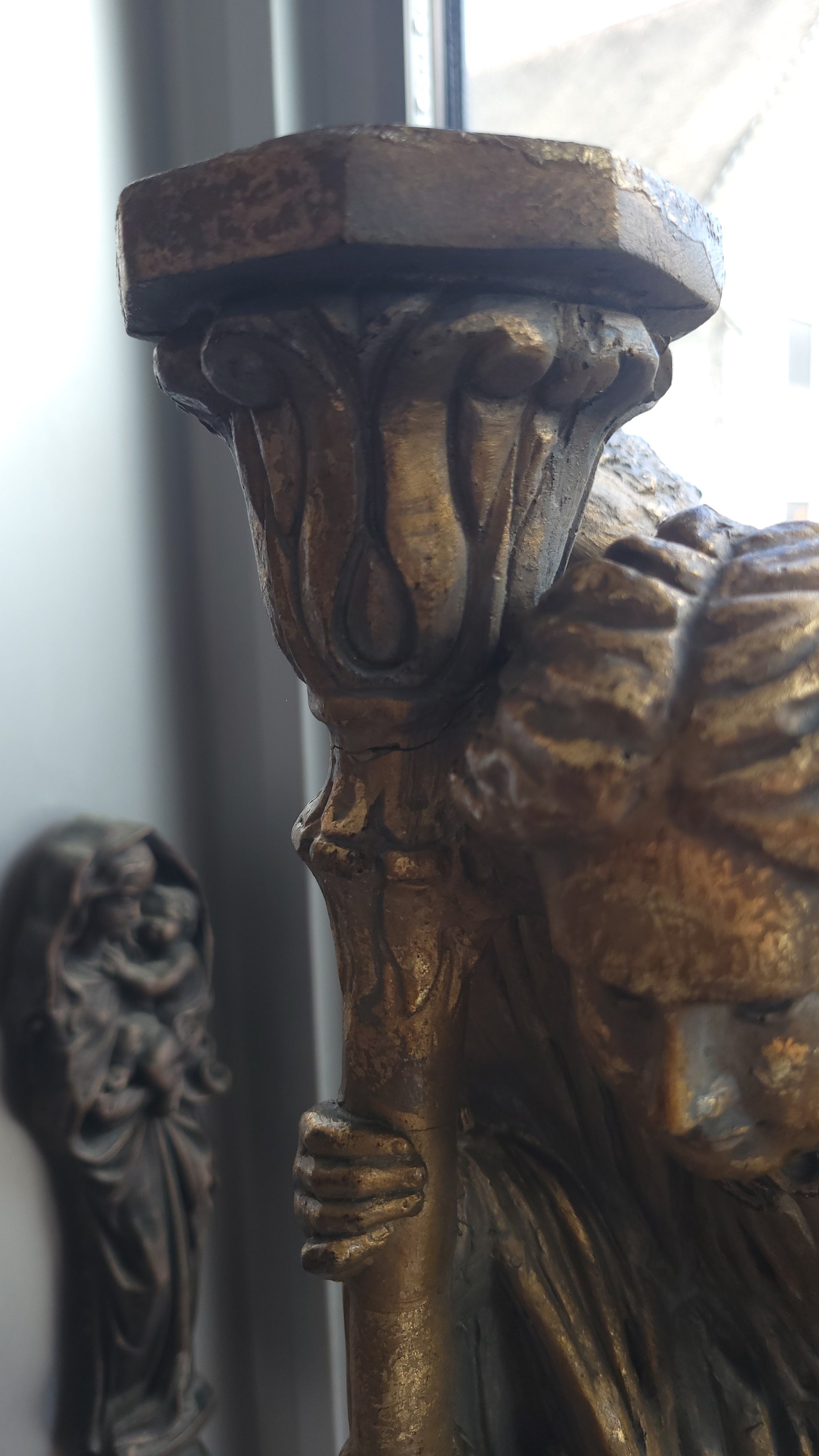 L'ensemble est richement travaillé : ailes finement sculptées, drapé fluide des vêtements, socle octogonal orné de nuées. La patine dorée présente des usures et des manques visibles, notamment à la base et sur certaines zones en relief, ce qui renforce son caractère ancien et authentique.