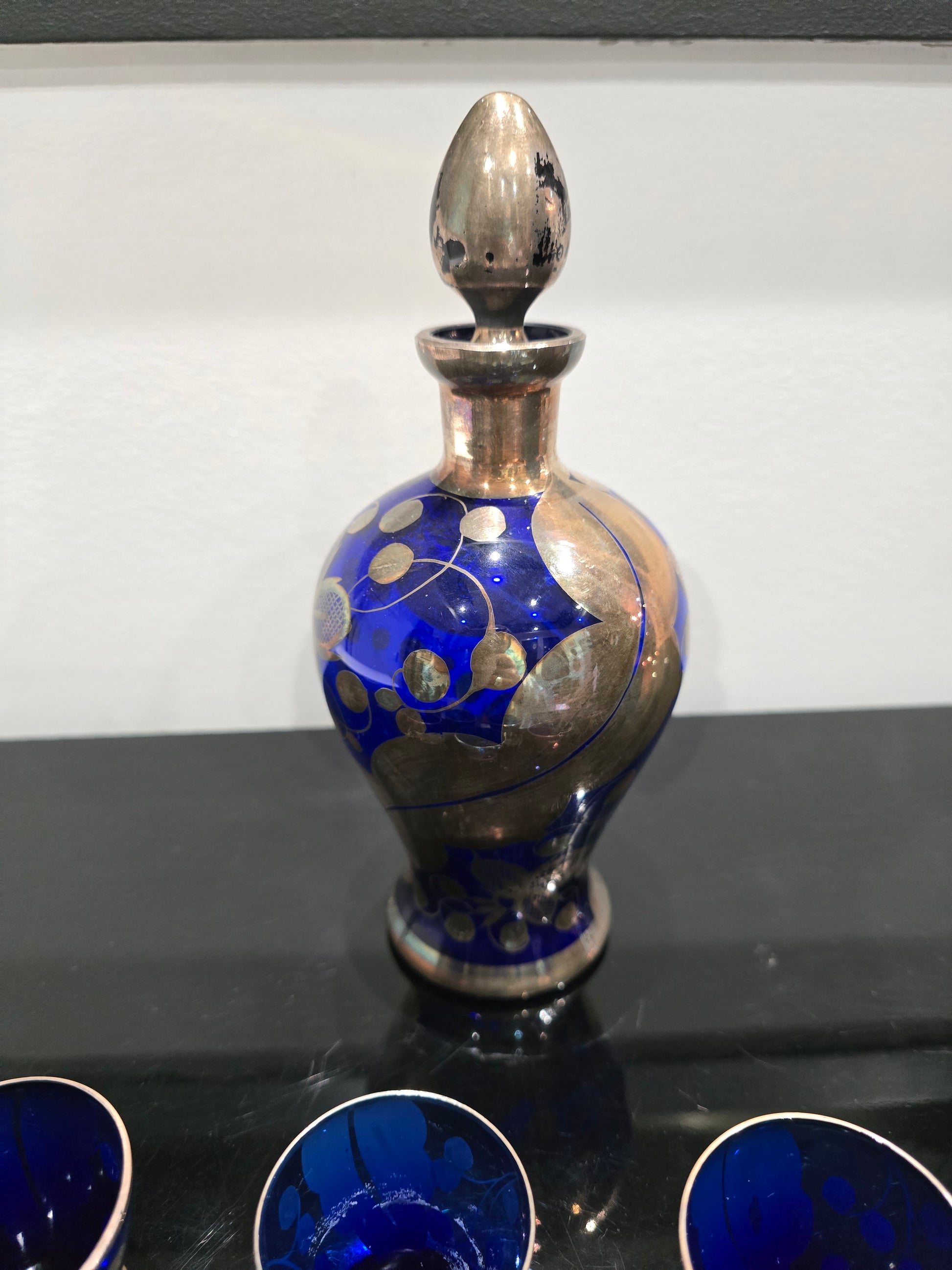 Magnifique service à liqueur ancien composé d’une carafe et de sept petits verres assortis, en verre bleu cobalt profond, décorés de motifs floraux et géométriques en argent appliqué.