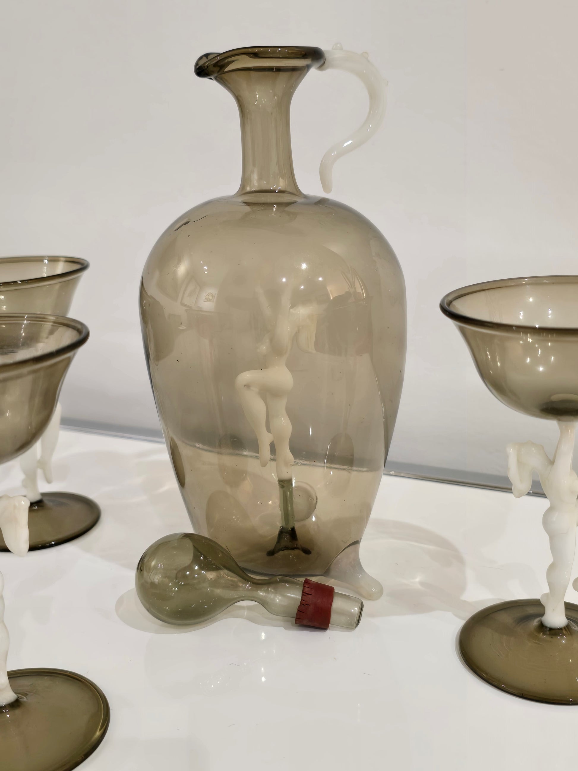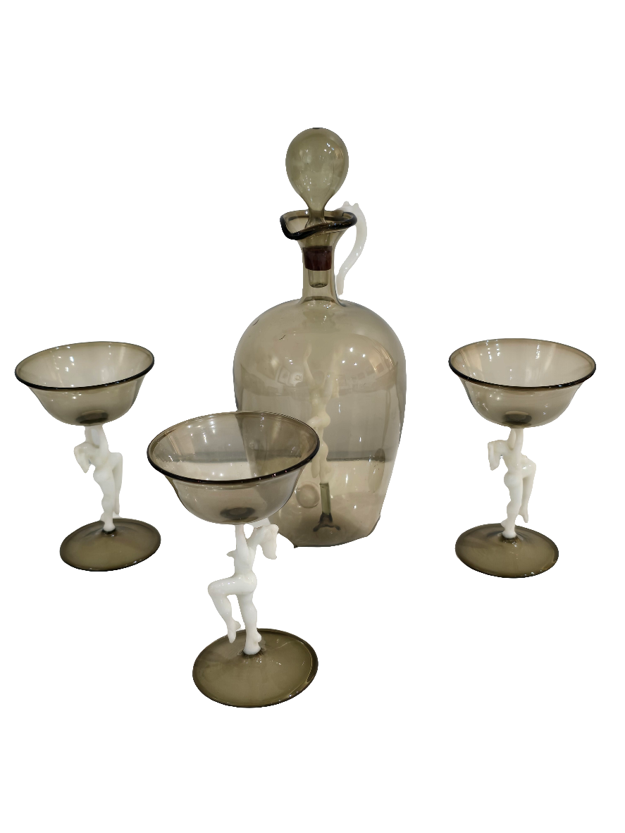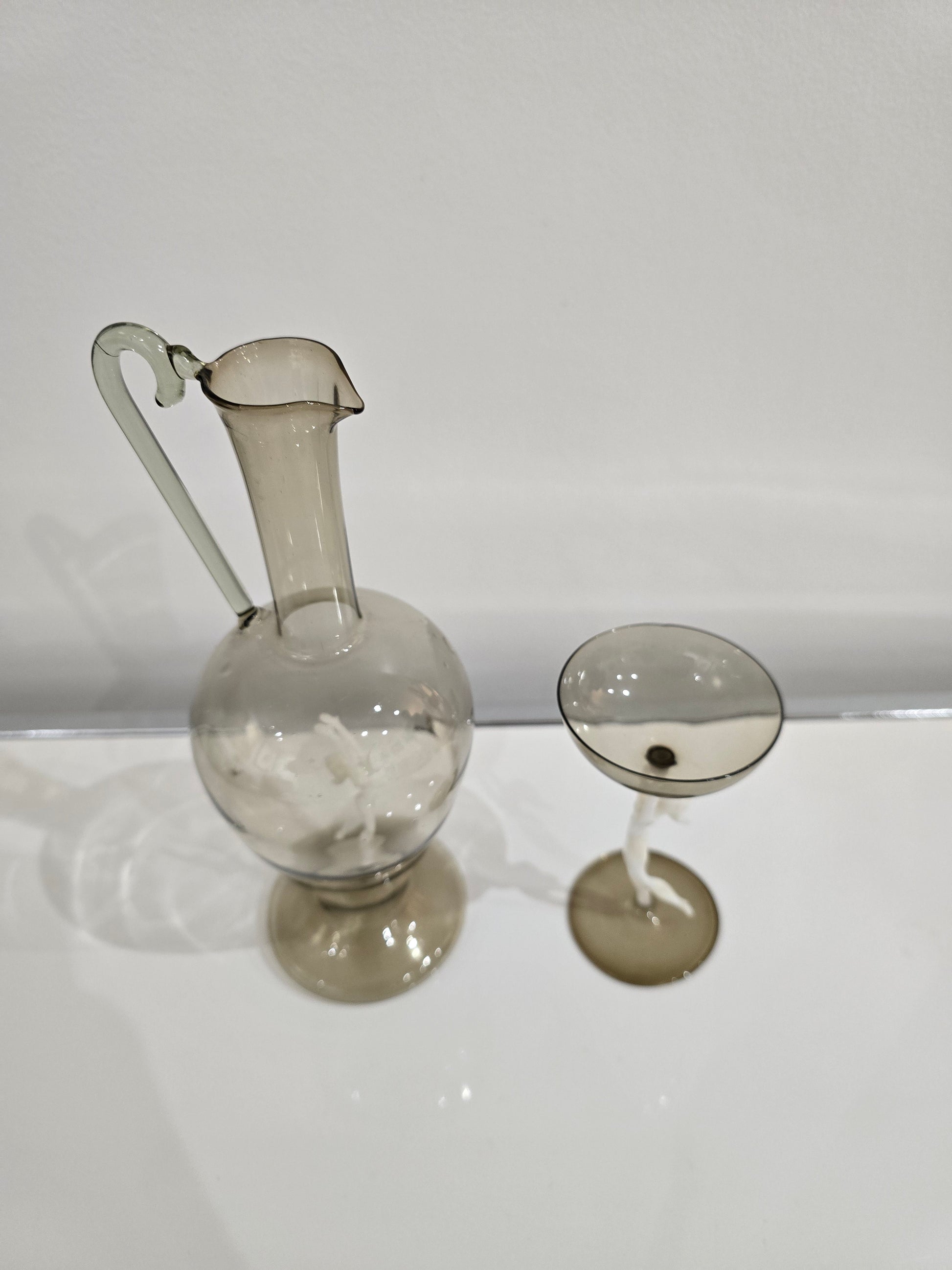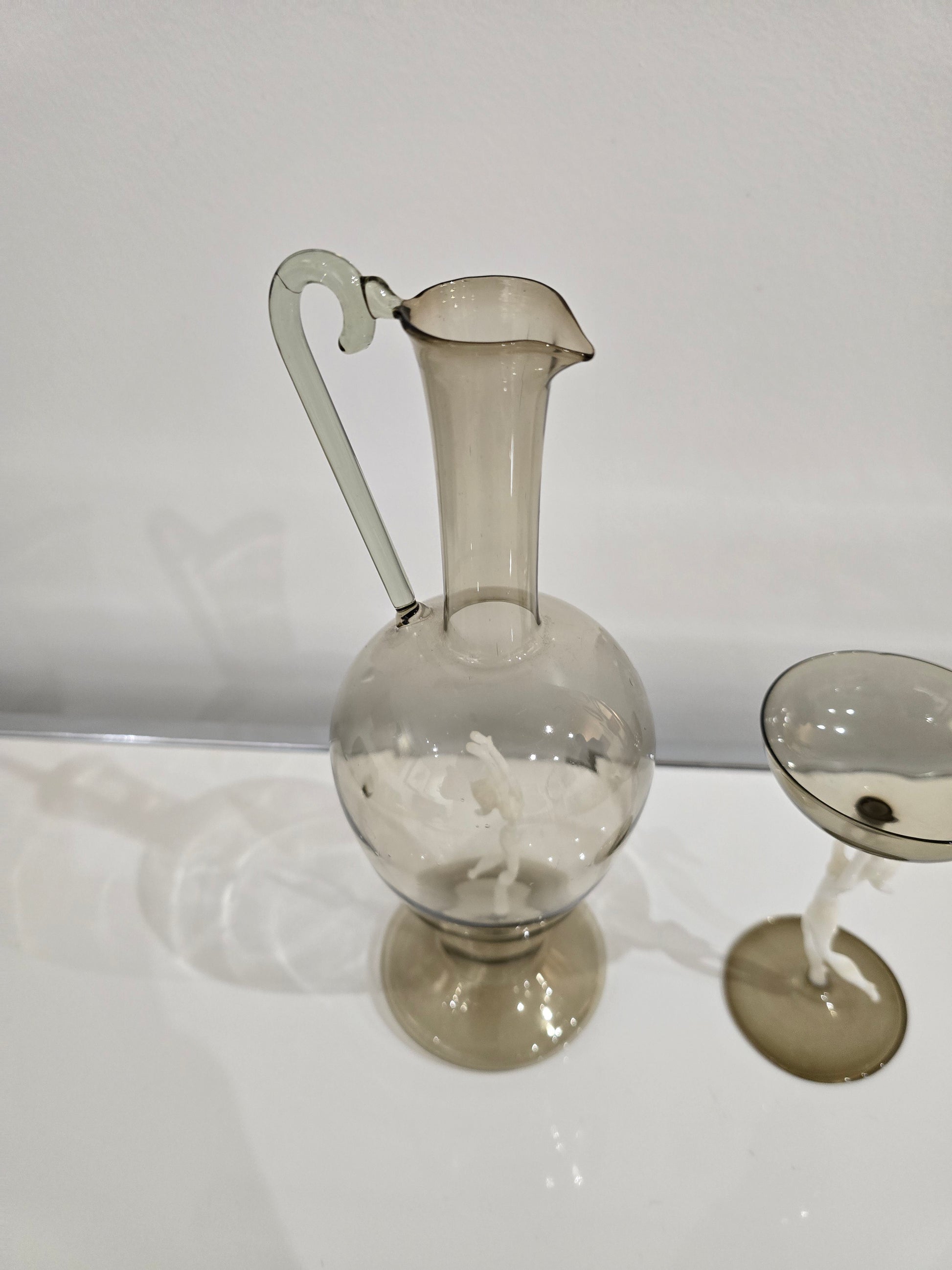 C'est un élégant service à liqueur en verre fumé comprenant une carafe et des verres. Les verres se distinguent par leurs pieds décoratifs représentant des silhouettes sculptées en blanc, ce qui donne un charme artistique.