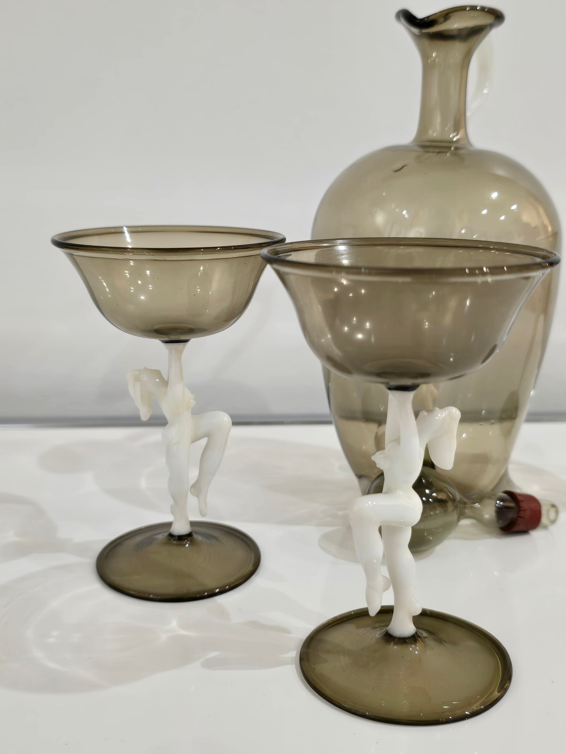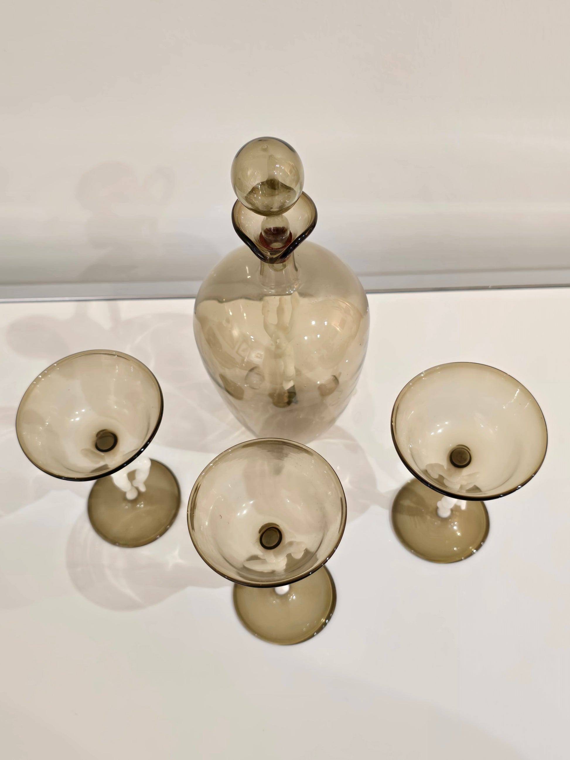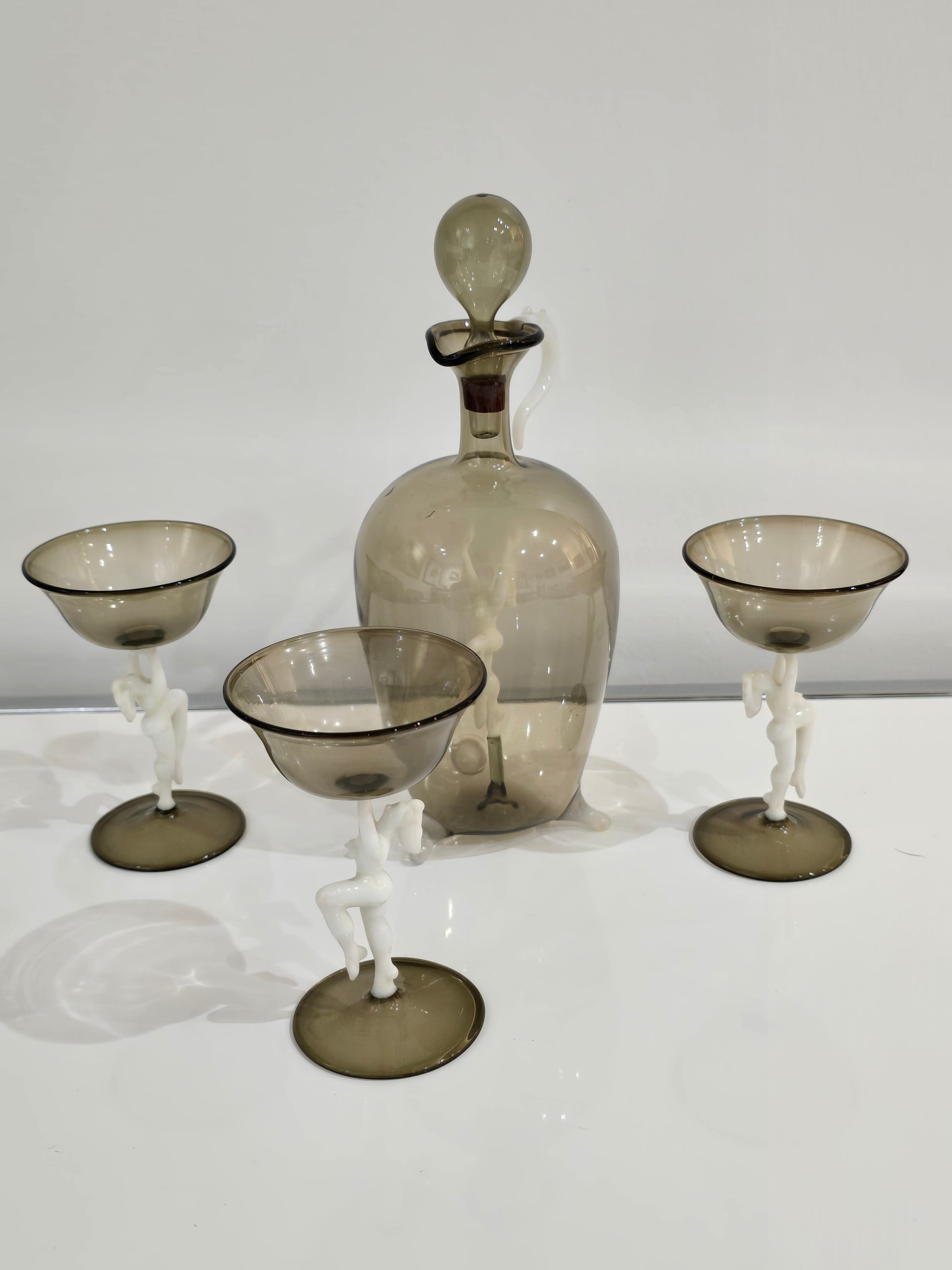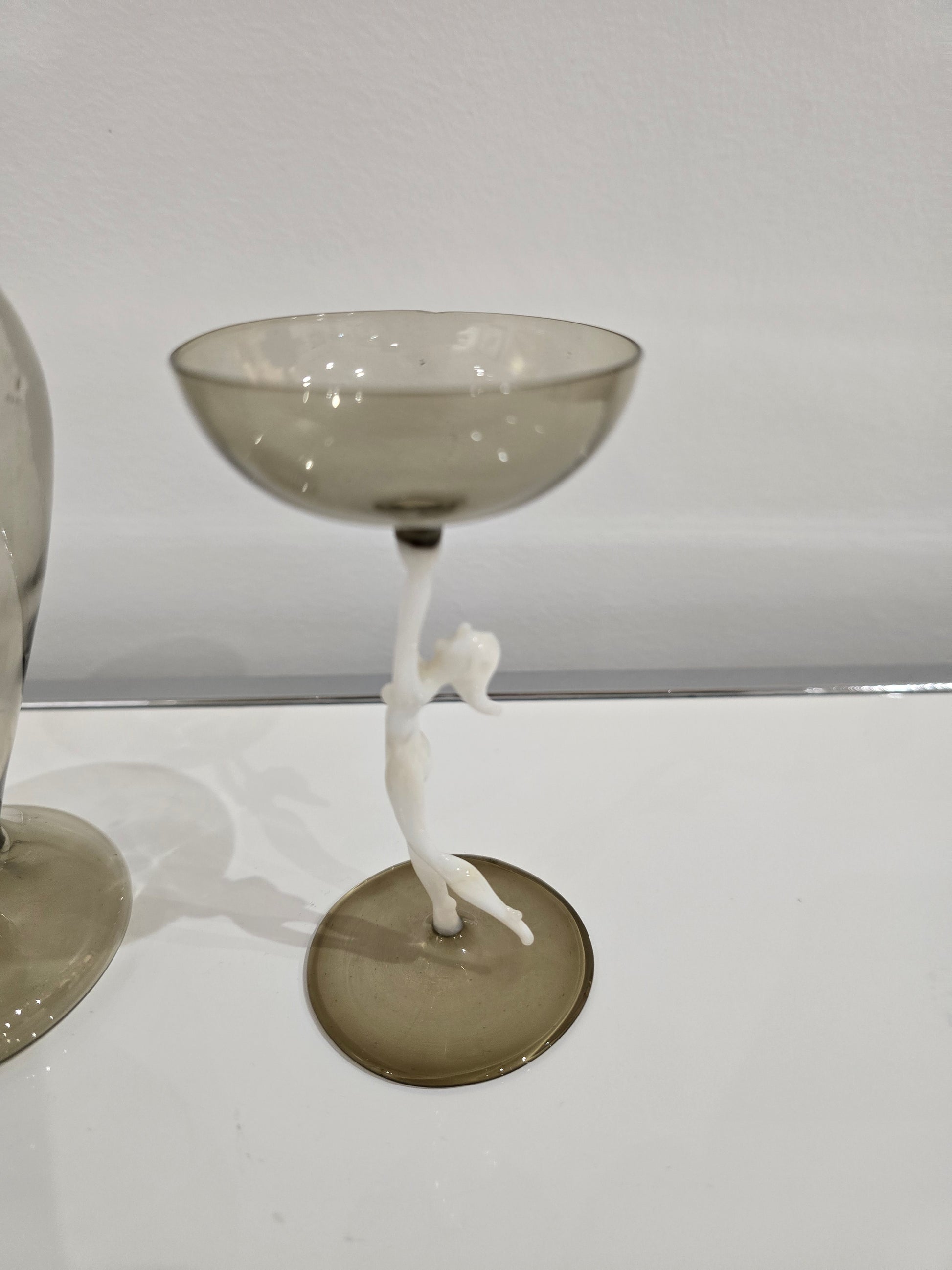 C'est un élégant service à liqueur en verre fumé comprenant une carafe et des verres. Les verres se distinguent par leurs pieds décoratifs représentant des silhouettes sculptées en blanc, ce qui donne un charme artistique.