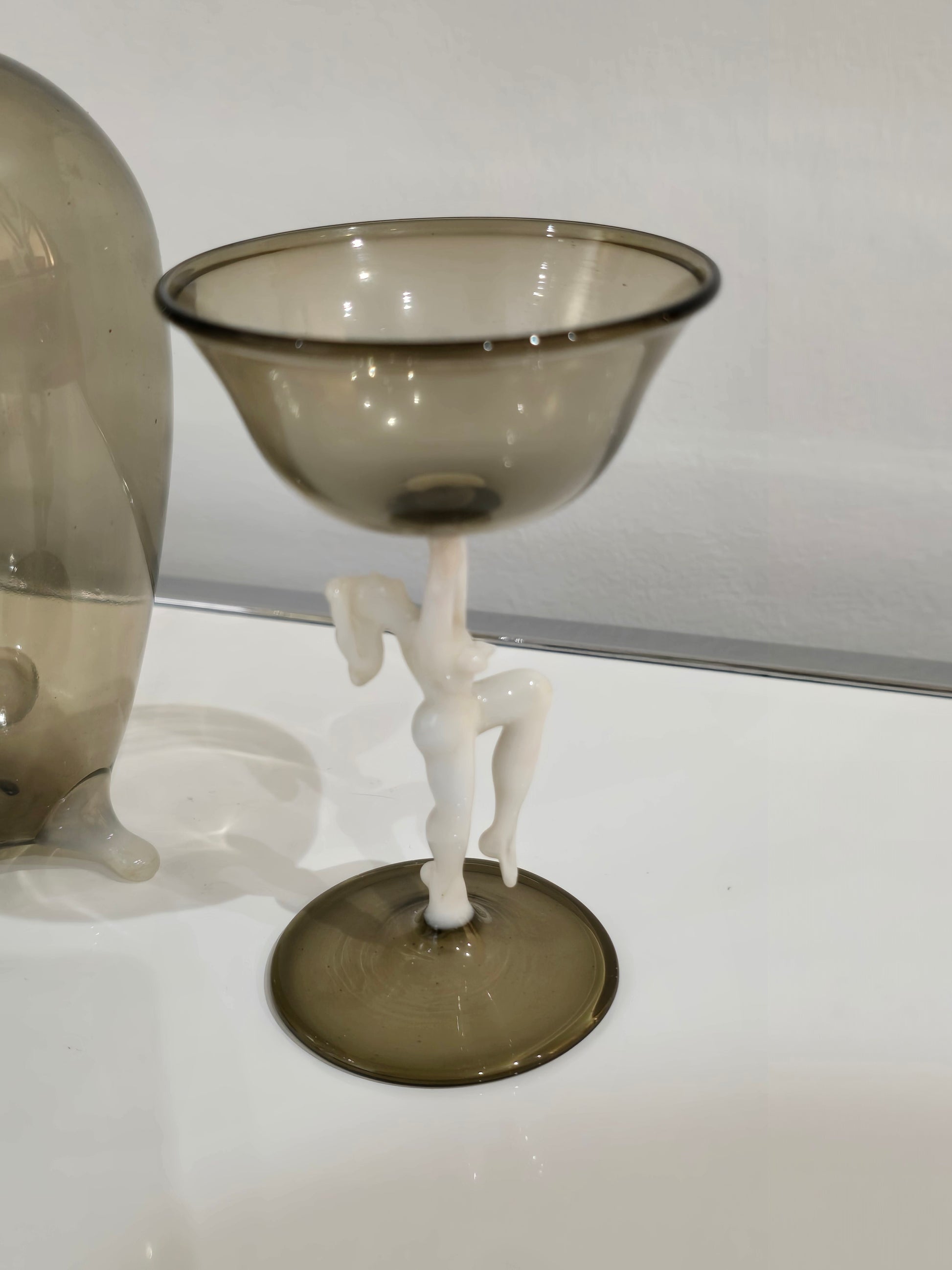 Ce service est caractéristique du style Bimini, une verrerie artisanale viennoise fondée en 1923 par Fritz Lampl. Les créations de Bimini sont célèbres pour leurs designs élégants et délicats, souvent ornés de figurines et d'éléments artistiques. Le verre fumé et les silhouettes sculptées de ce service reflètent bien l'esthétique raffinée et innovante de cette maison.