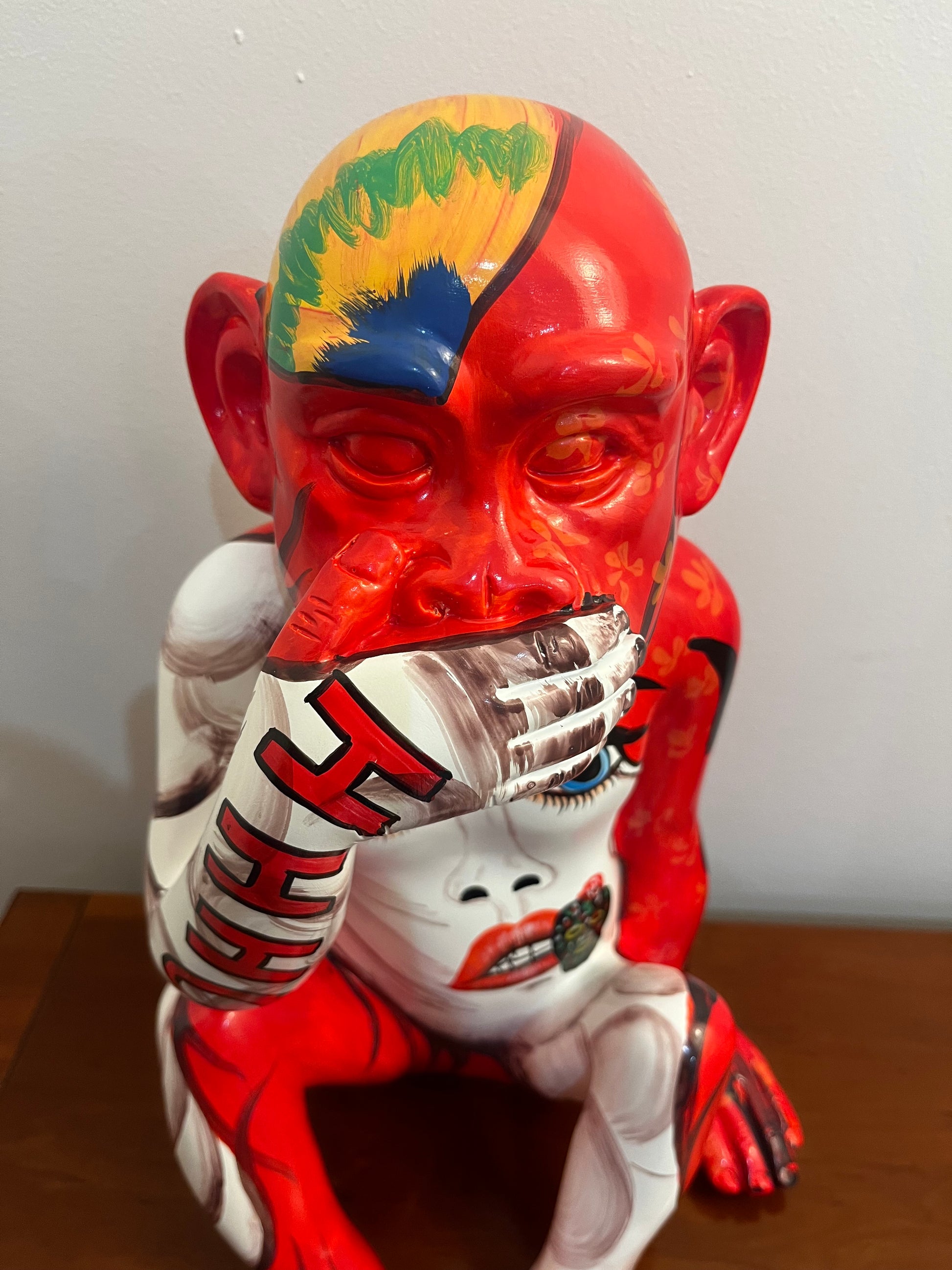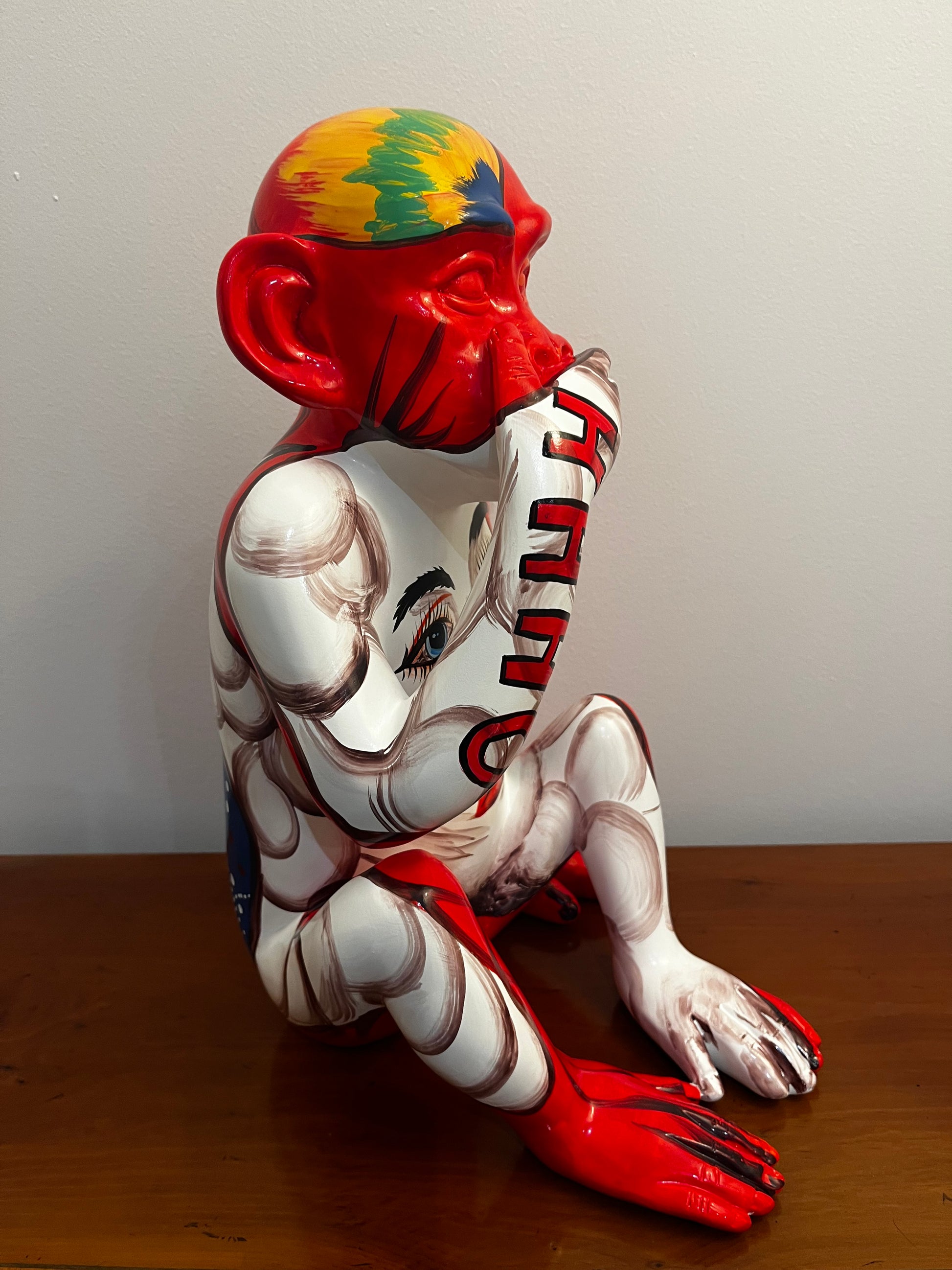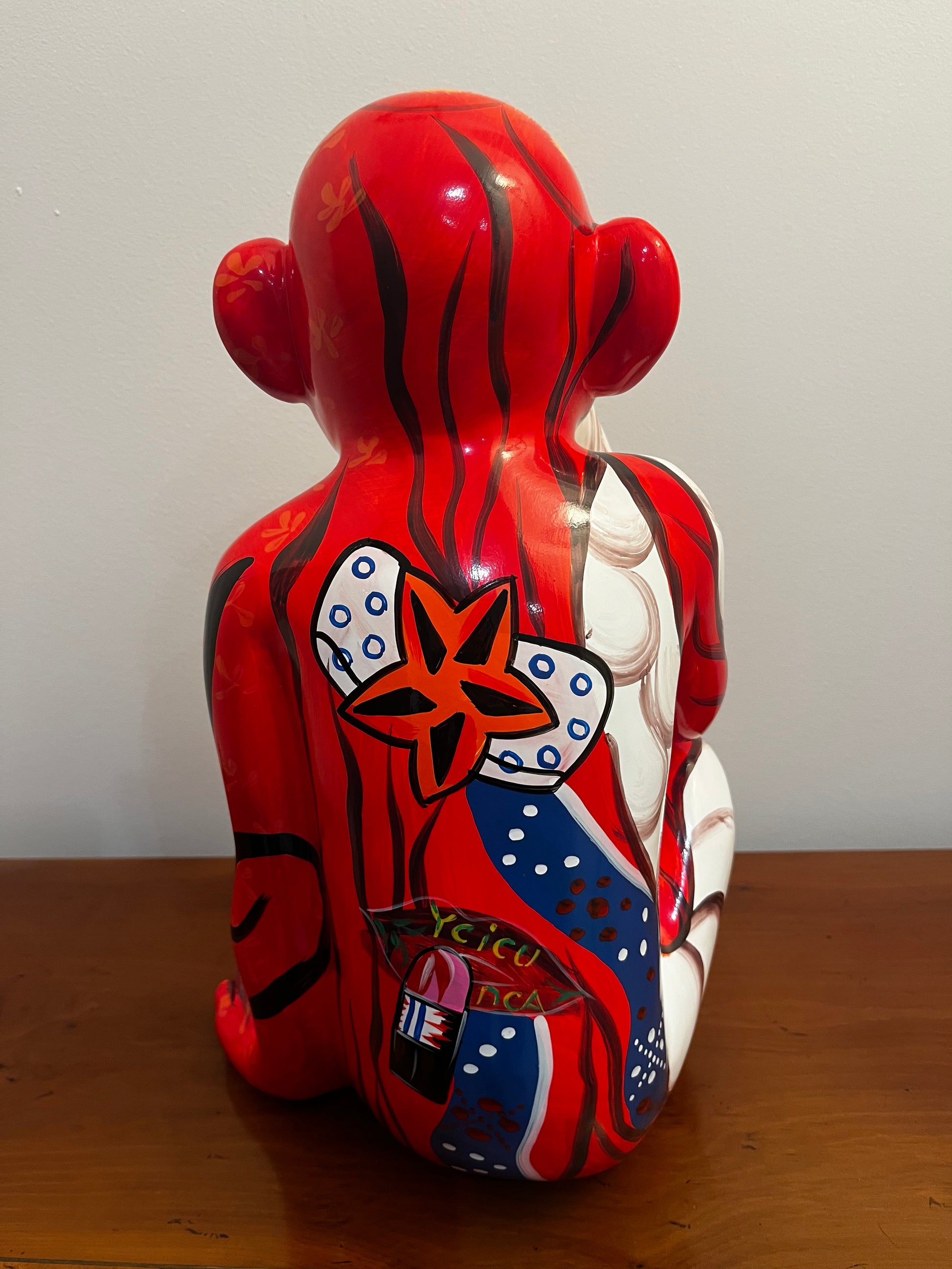 Cette sculpture de singe unique "urban street monkey" en résine synthétique en rouge et blanc est un véritable accroche-regard pour n'importe quel intérieur.