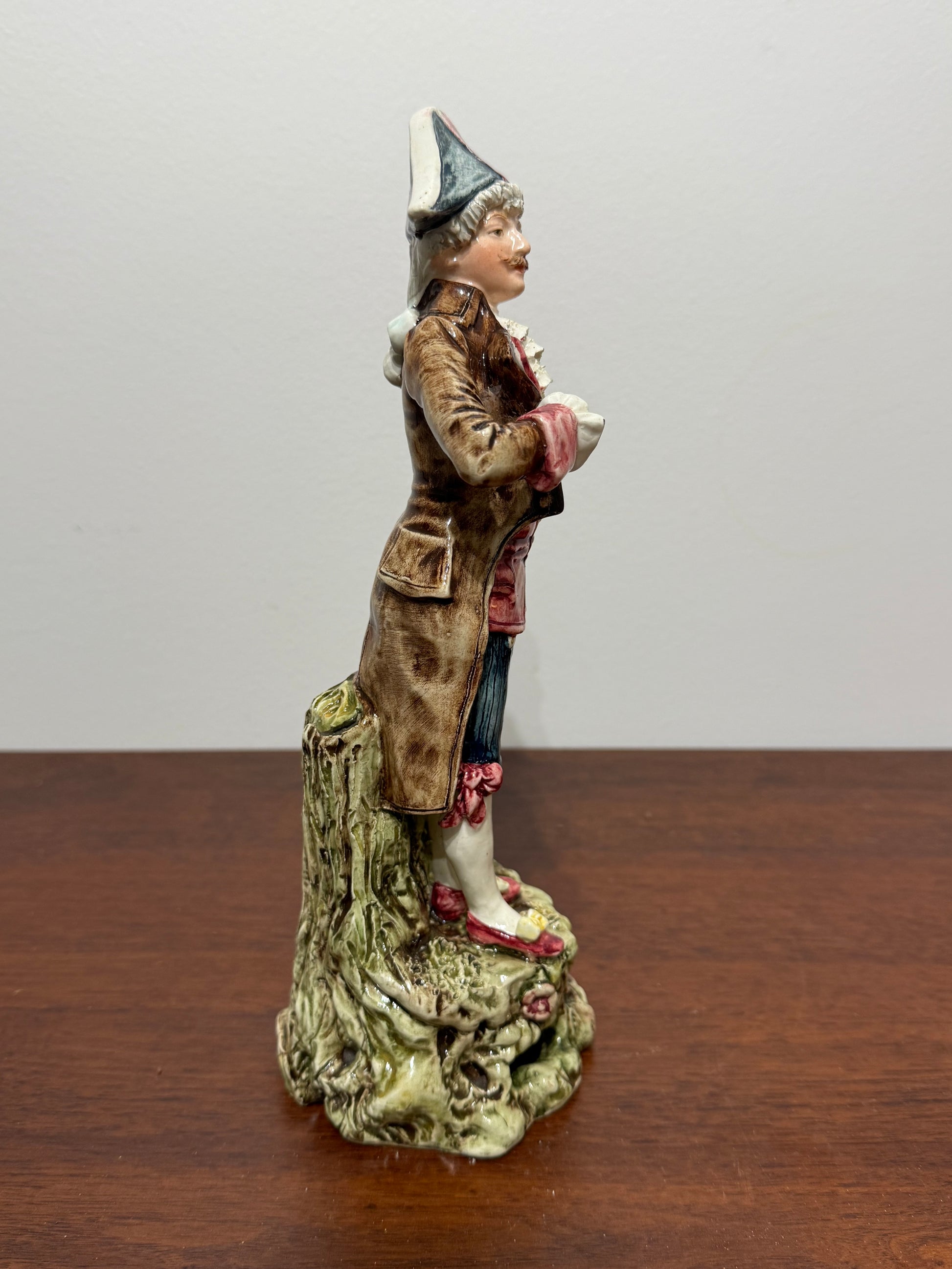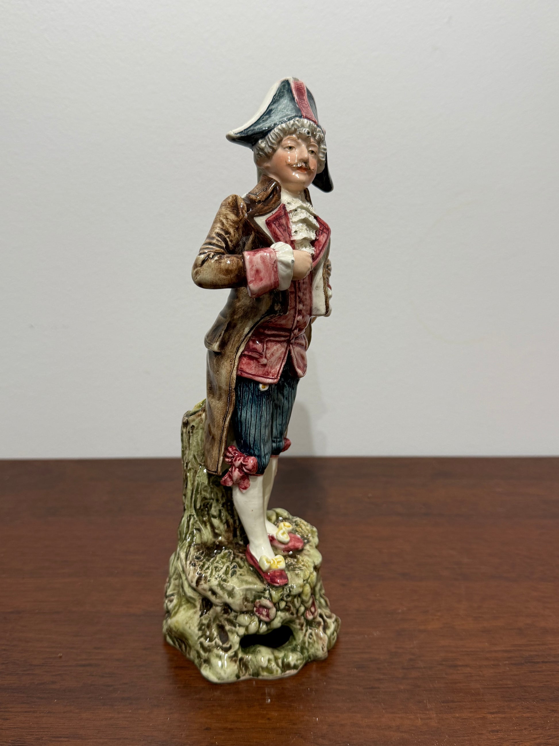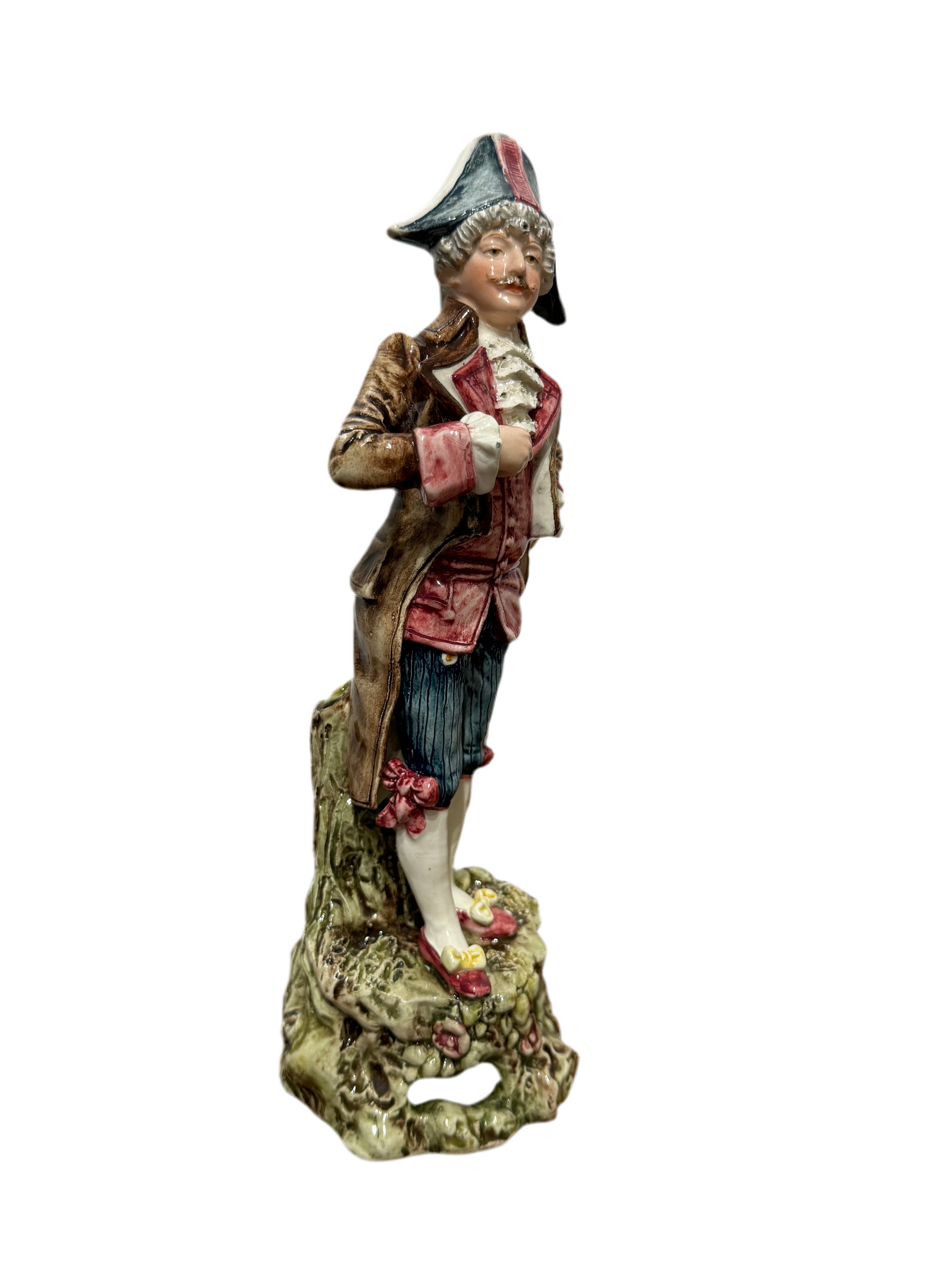 Cette élégante statuette en porcelaine représente un personnage en costume d’époque, probablement inspiré des nobles ou officiers du XVIIIe siècle. Le soin apporté aux détails du costume et aux couleurs délicates en fait une pièce d’exception pour les collectionneurs et amateurs d’objets d’art décoratif.