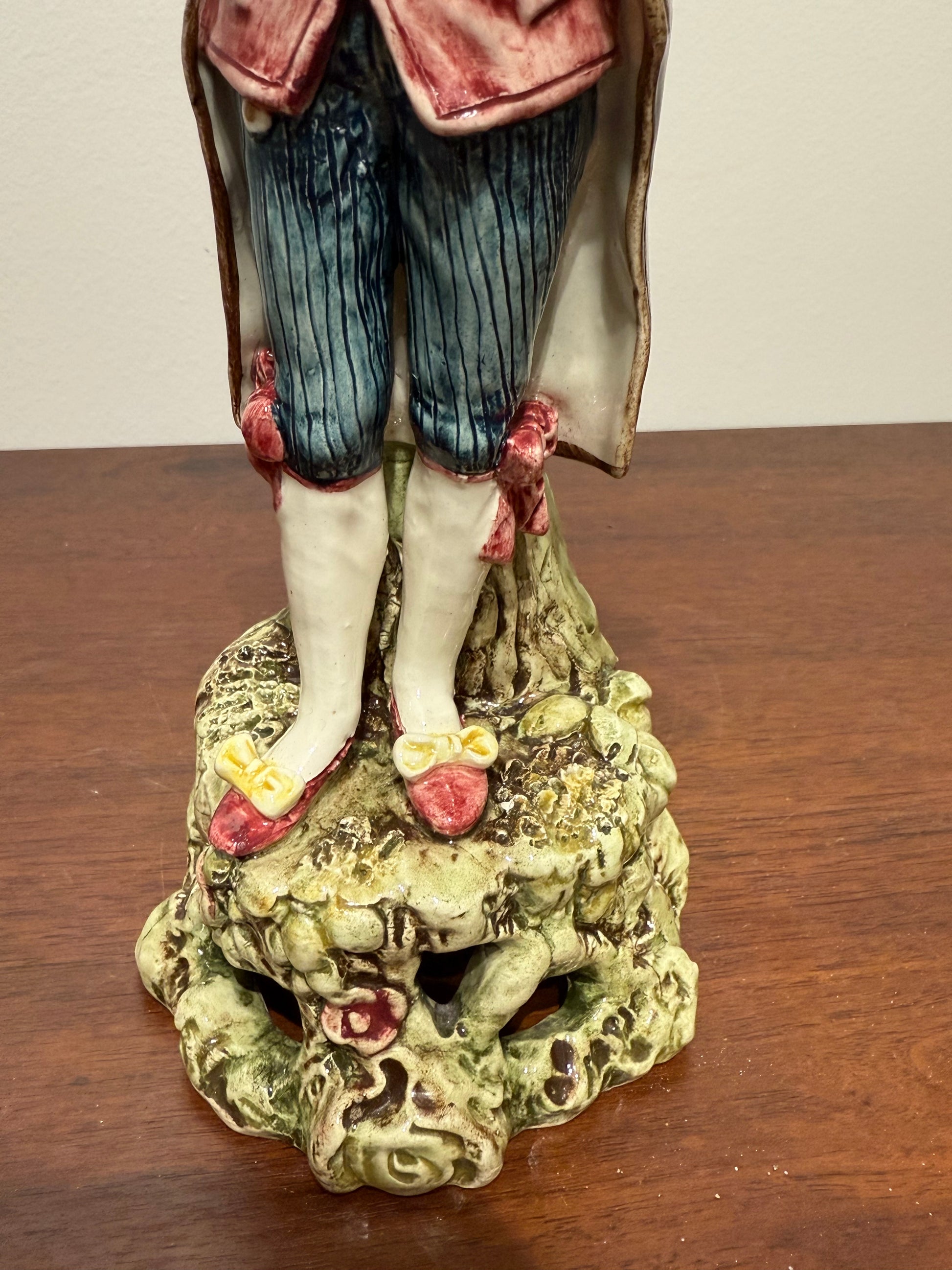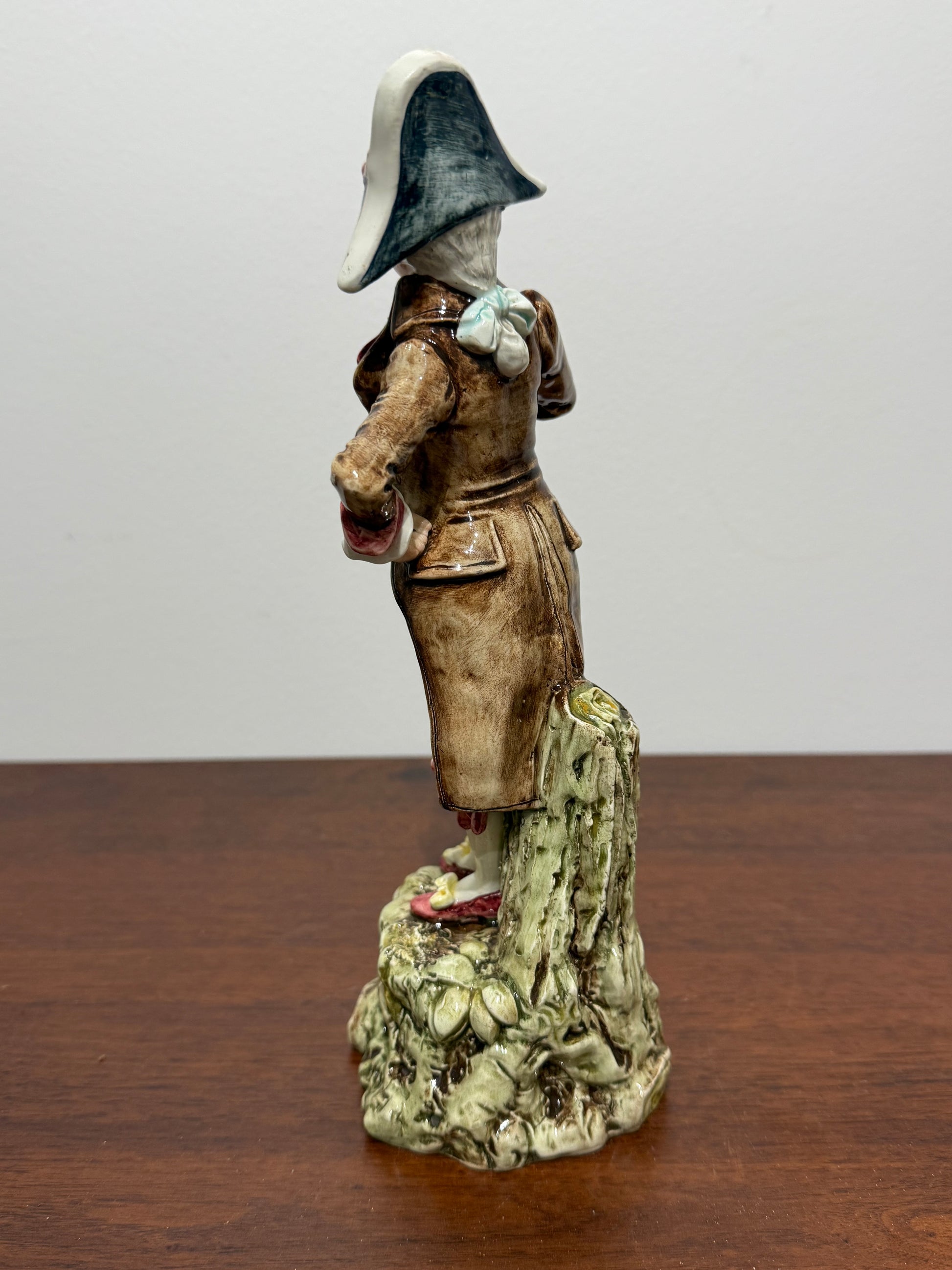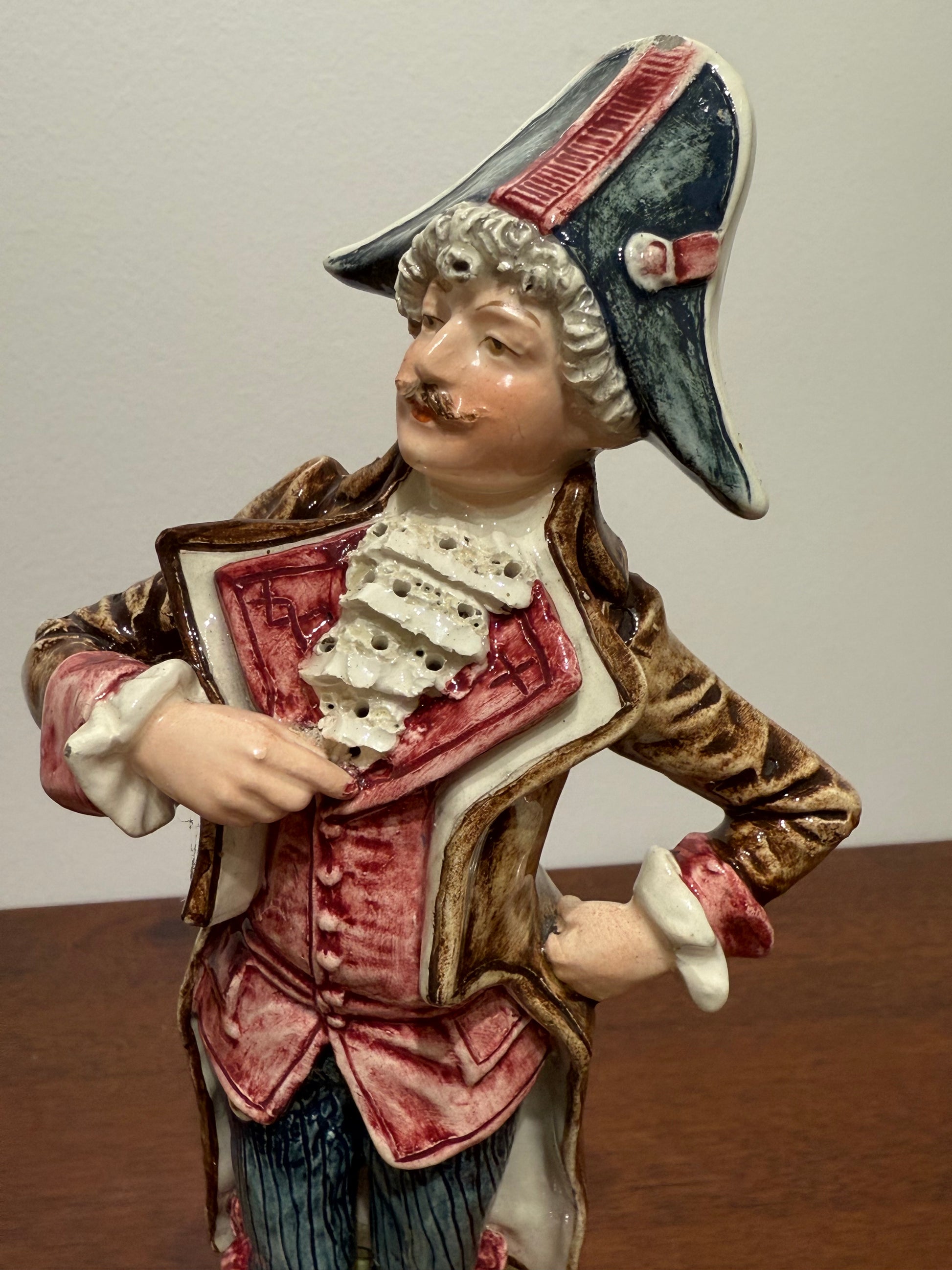 Cette élégante statuette en porcelaine représente un personnage en costume d’époque, probablement inspiré des nobles ou officiers du XVIIIe siècle. Le soin apporté aux détails du costume et aux couleurs délicates en fait une pièce d’exception pour les collectionneurs et amateurs d’objets d’art décoratif.