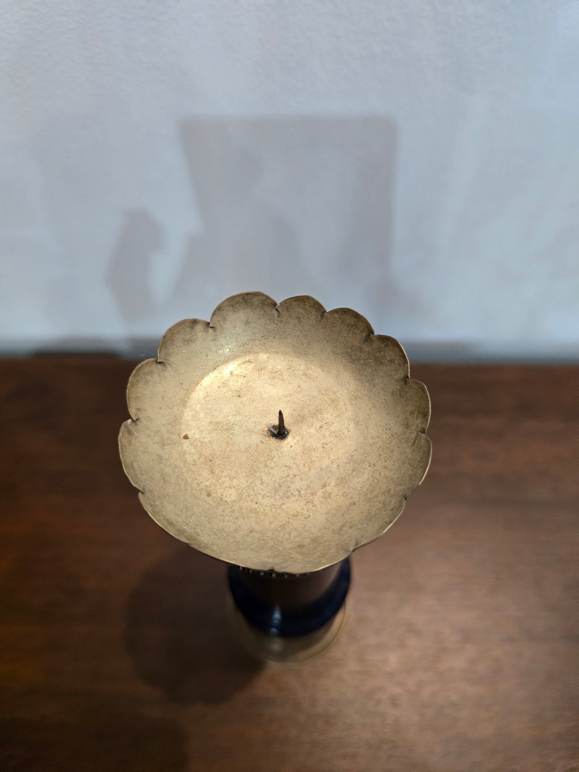 Charmant bougeoir ou photophore d’inspiration orientale, combinant un fût en verre soufflé bleu cobalt et des éléments décoratifs en métal argenté ciselé. La base et l’embouchure sont finement ouvragées de motifs floraux ou arabesques, conférant à l’ensemble un caractère raffiné et exotique. Une pointe en métal permet d’y fixer une bougie.