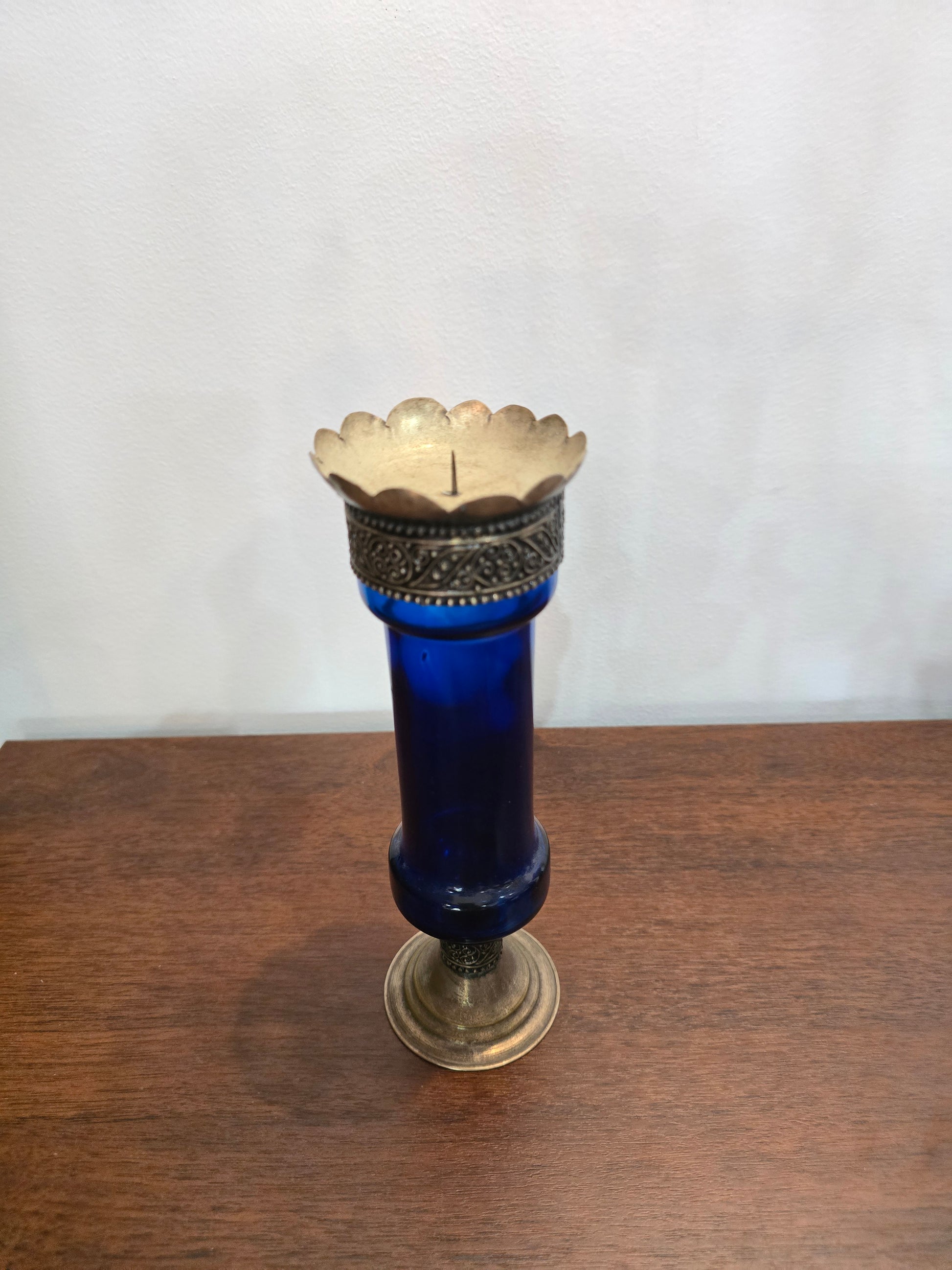 Bougeoir vintage style oriental en verre bleu et métal ciselé – H20 cm
