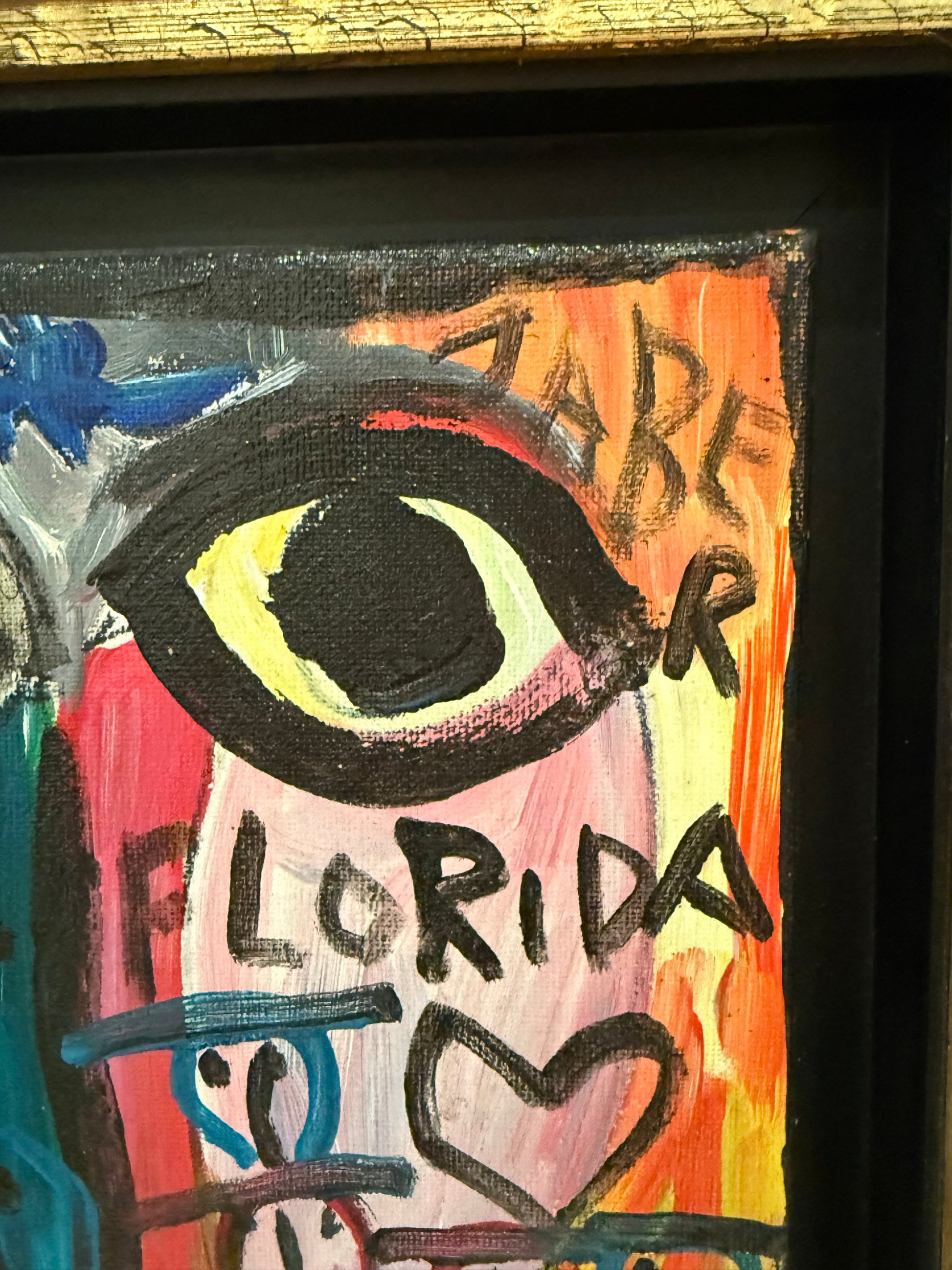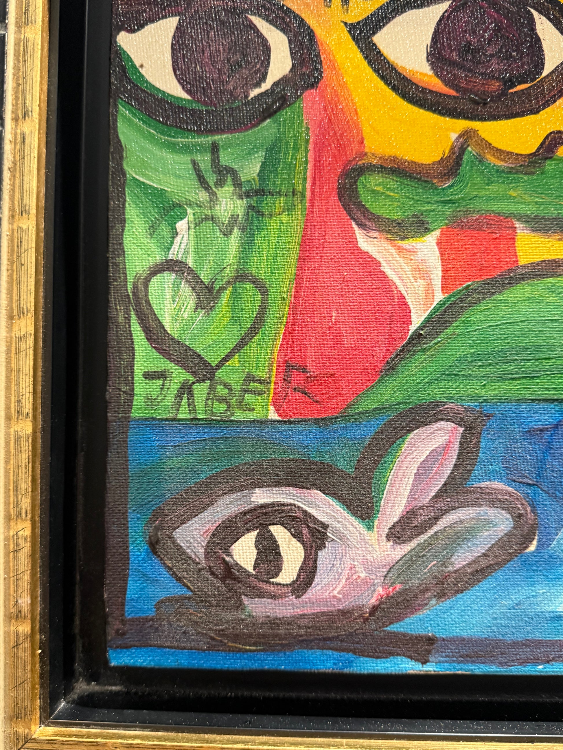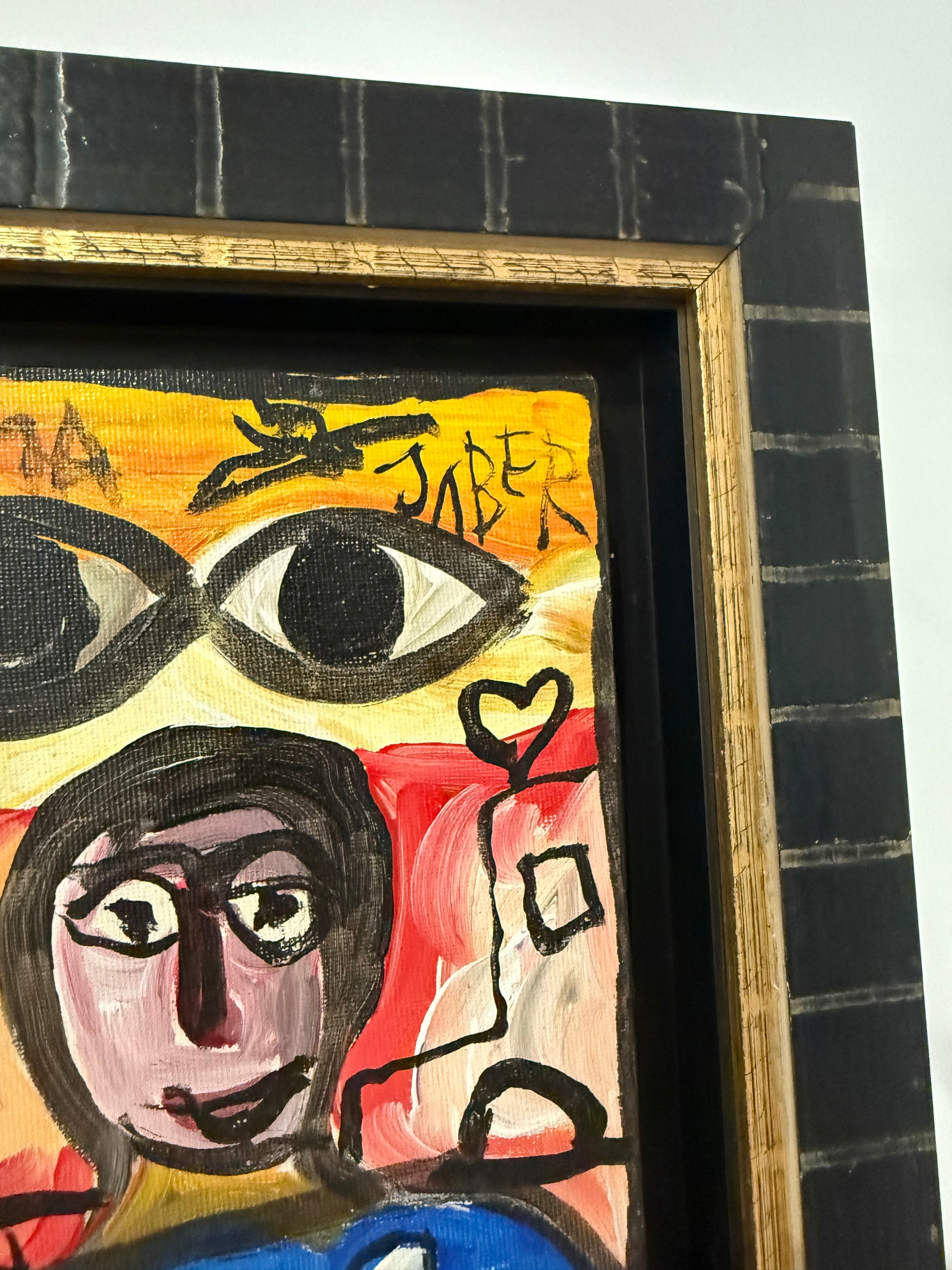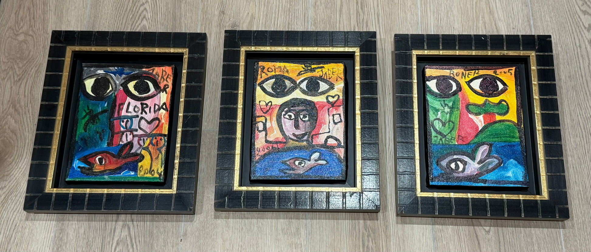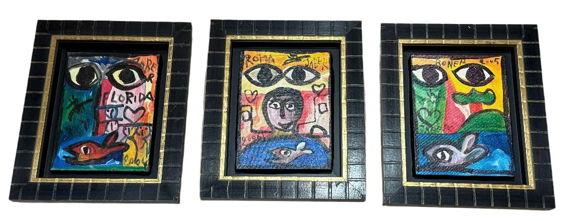 Ce triptyque haut en couleur signé Jaber, artiste autodidacte au style brut et expressif, est un concentré d’énergie et de spontanéité. Chacune des toiles met en scène un visage stylisé aux grands yeux, regardant le spectateur avec intensité. On y retrouve des éléments récurrents chers à l’artiste : le poisson à l’œil humain, les symboles naïfs, les cœurs, les messages (“FLORIDA”, “ROMA”, etc.), qui inscrivent ses personnages dans un univers joyeux, enfantin, parfois mystique.
