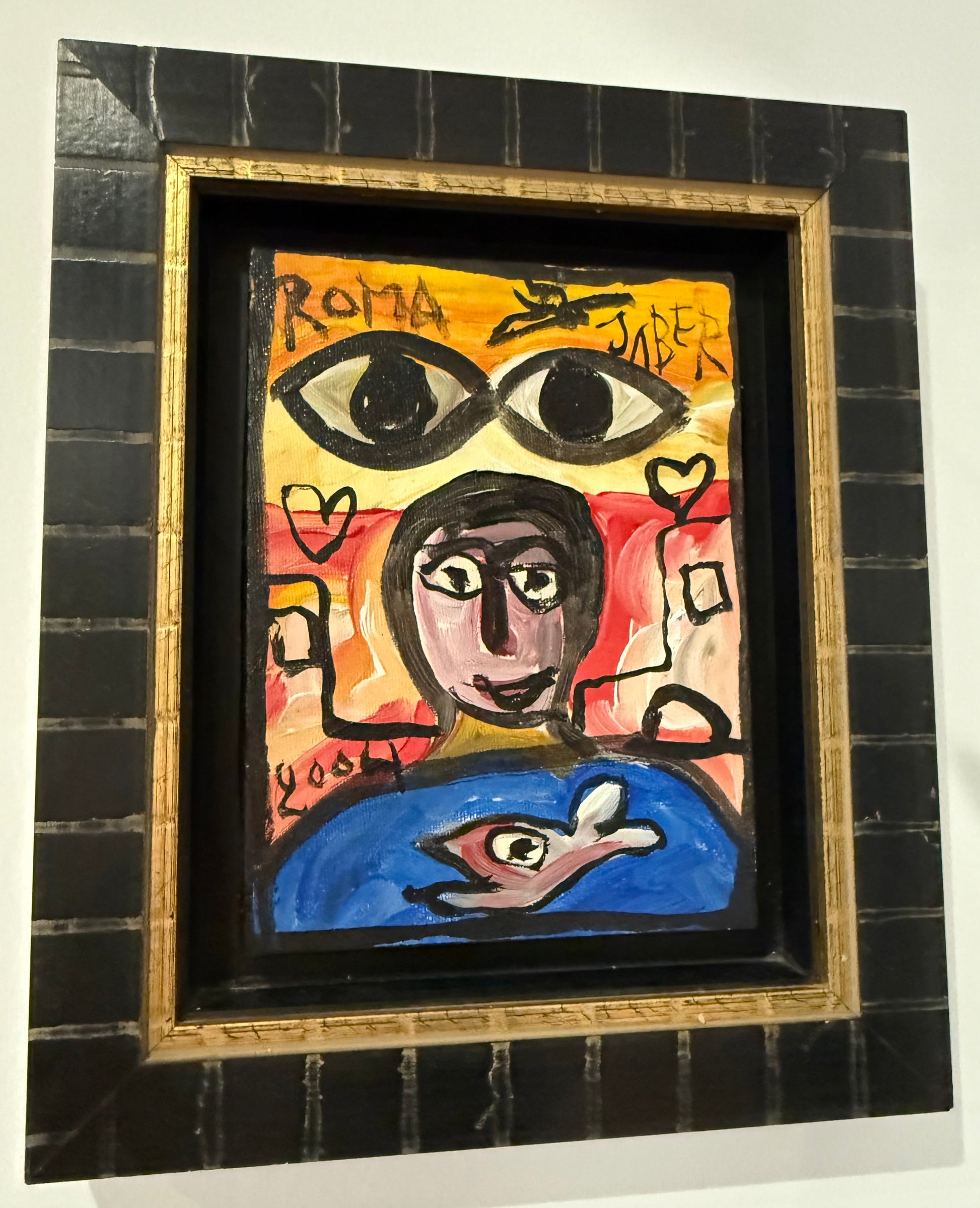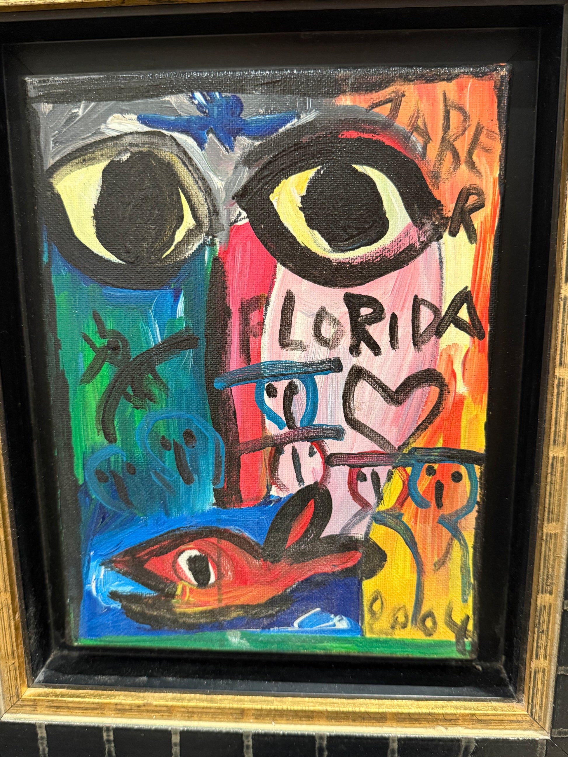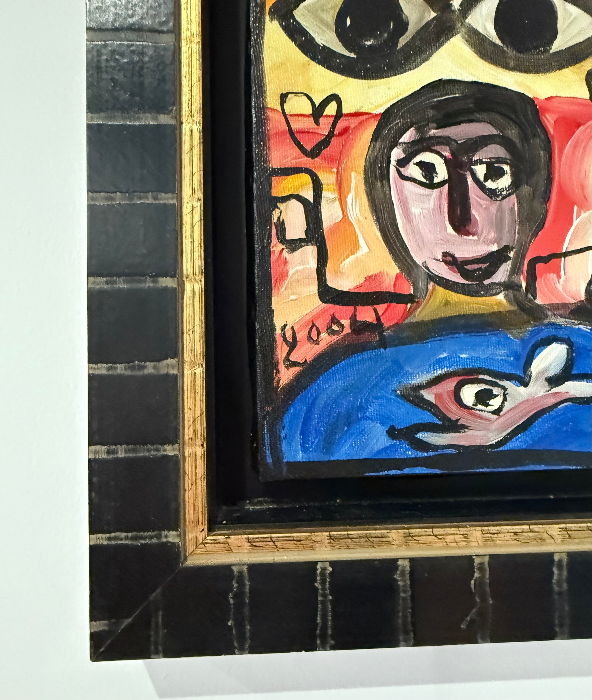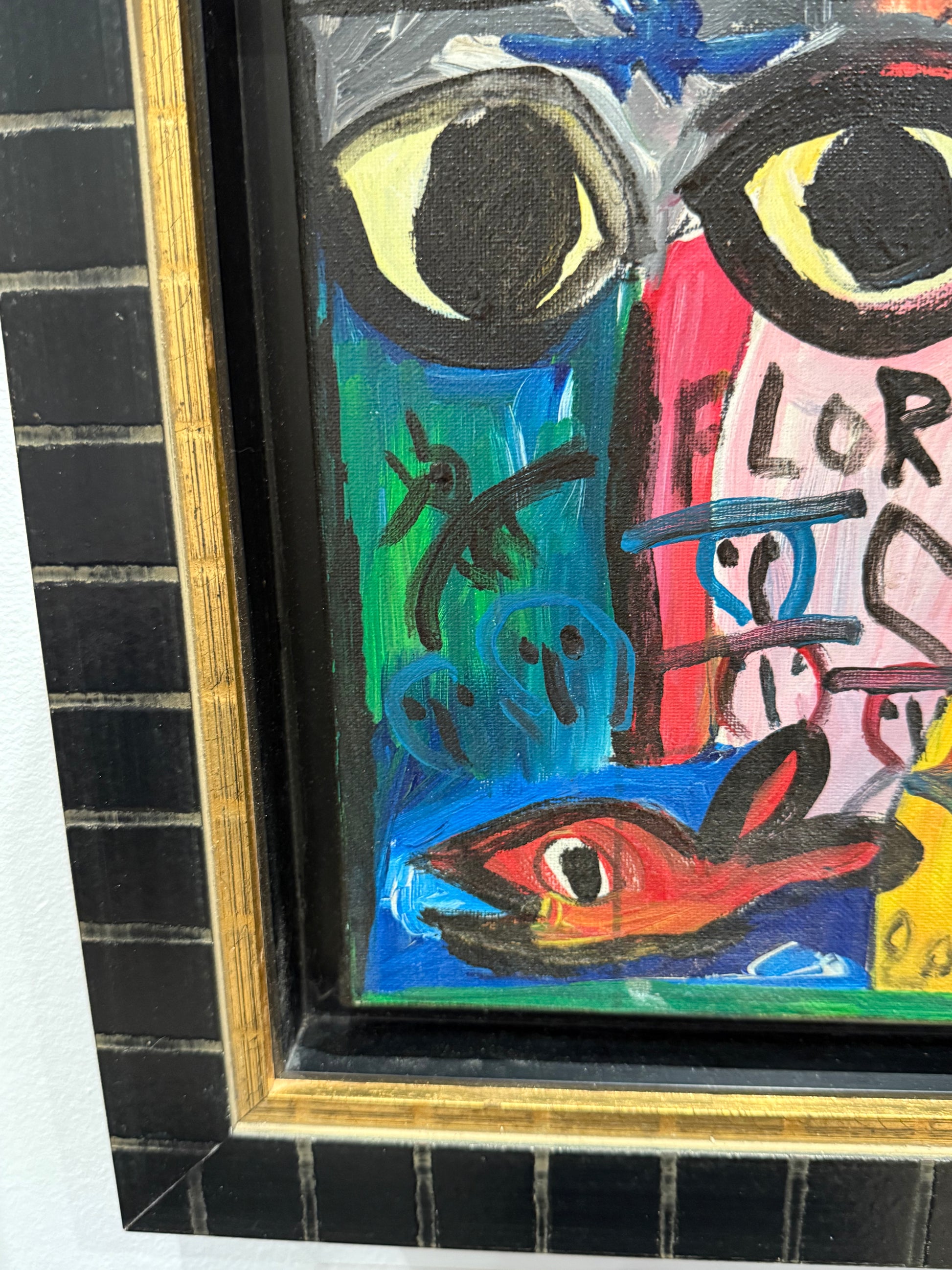 Ce triptyque haut en couleur signé Jaber, artiste autodidacte au style brut et expressif, est un concentré d’énergie et de spontanéité. Chacune des toiles met en scène un visage stylisé aux grands yeux, regardant le spectateur avec intensité. On y retrouve des éléments récurrents chers à l’artiste : le poisson à l’œil humain, les symboles naïfs, les cœurs, les messages (“FLORIDA”, “ROMA”, etc.), qui inscrivent ses personnages dans un univers joyeux, enfantin, parfois mystique.