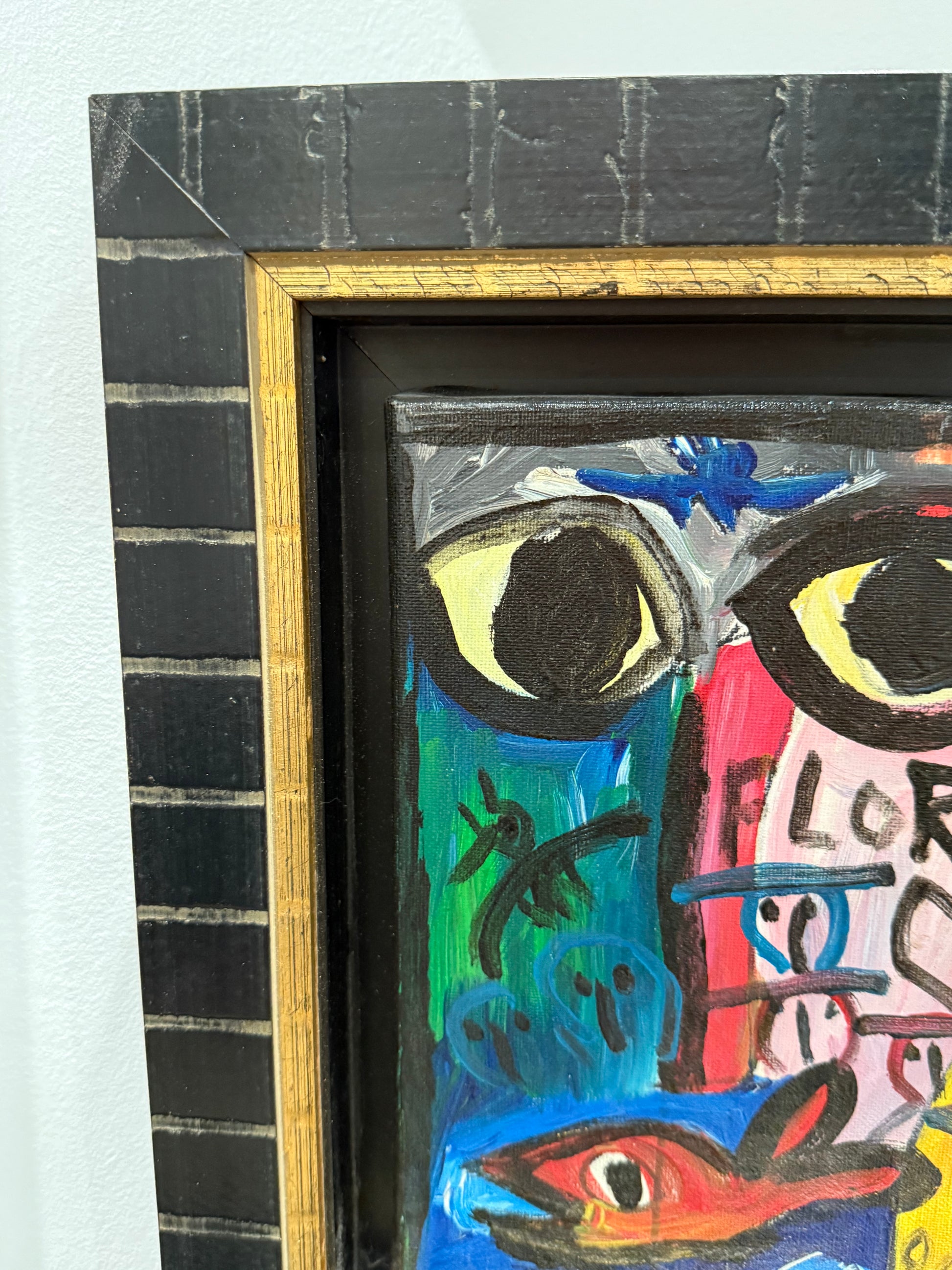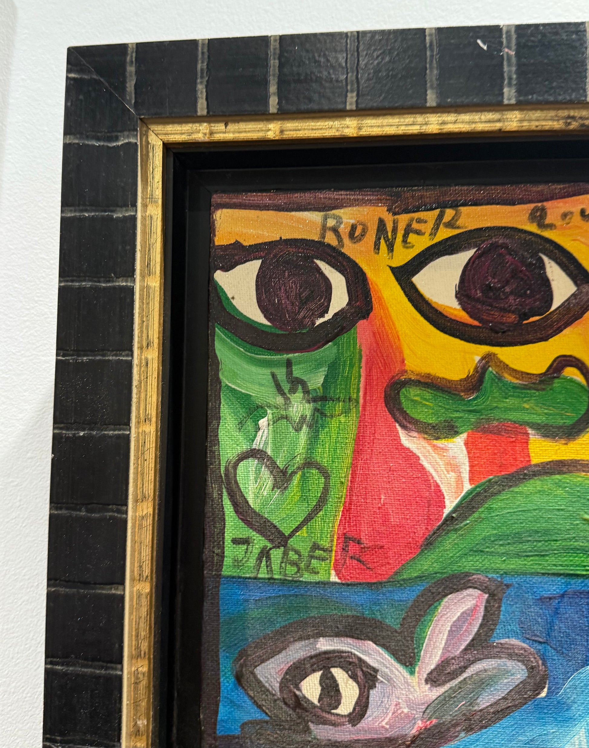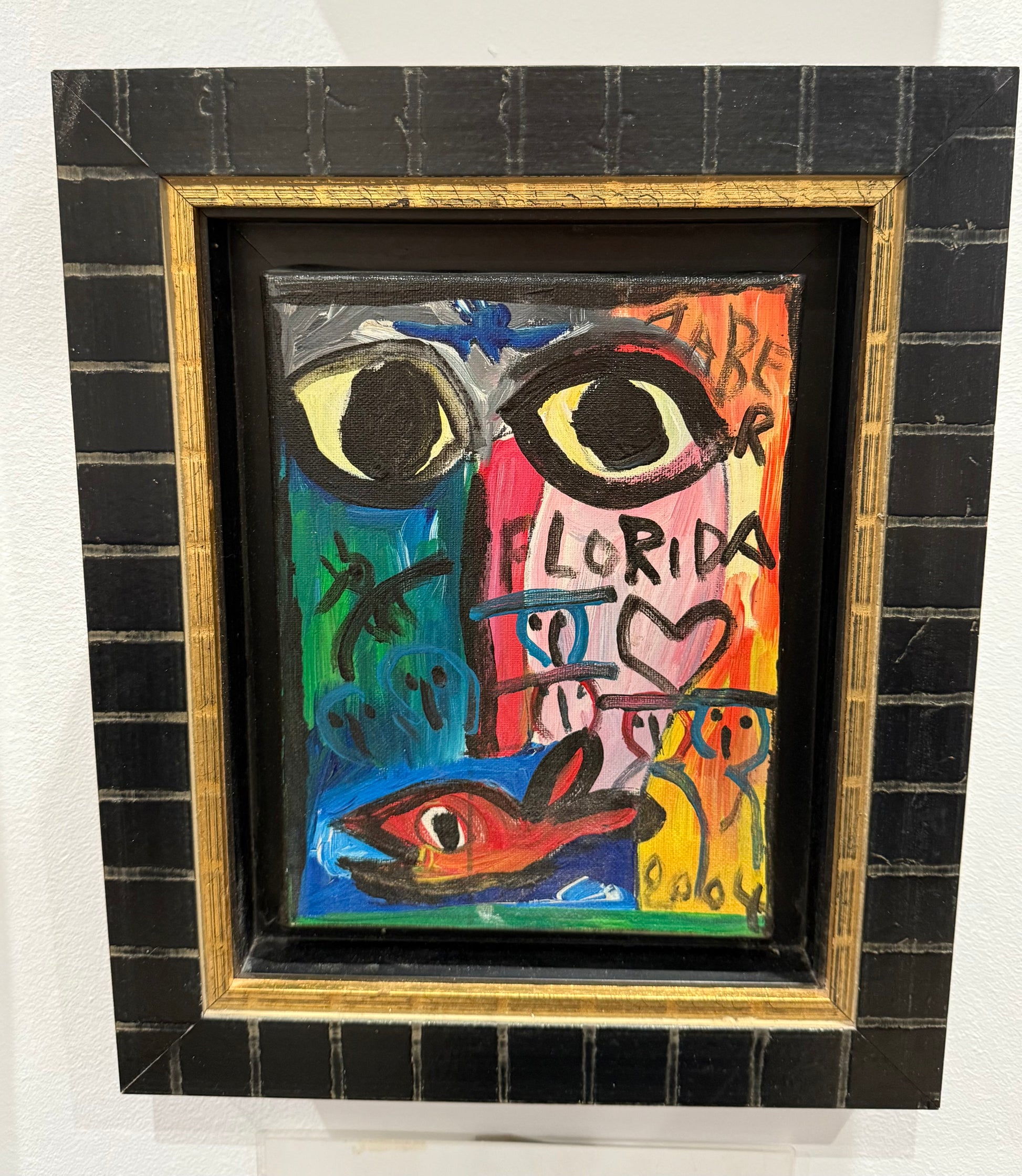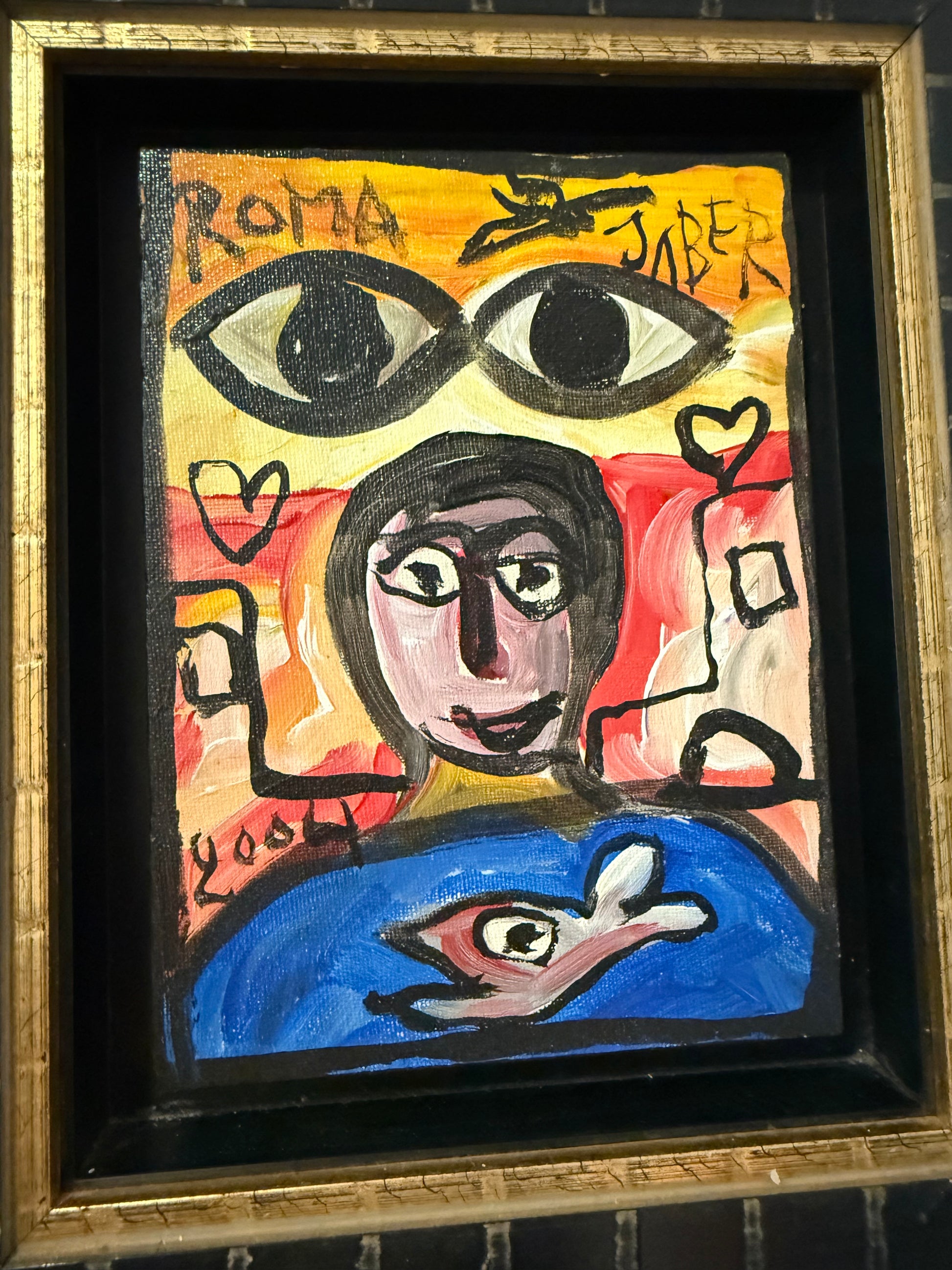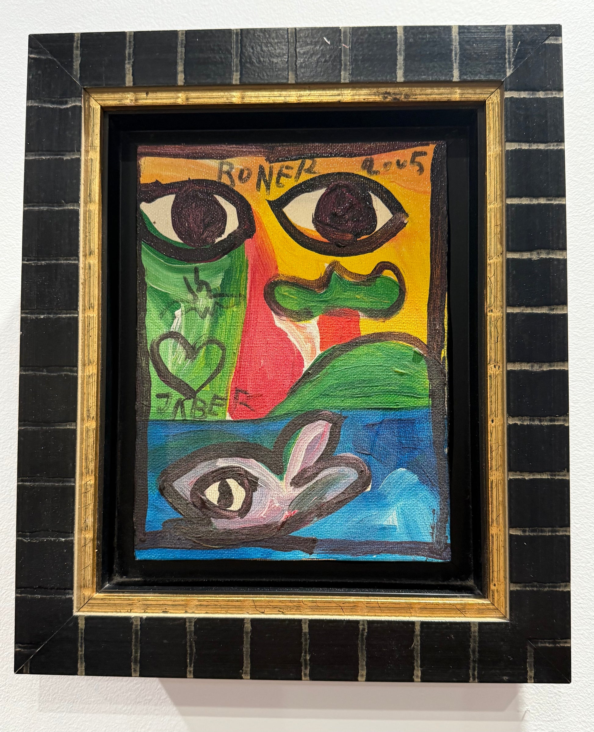 Ce triptyque haut en couleur signé Jaber, artiste autodidacte au style brut et expressif, est un concentré d’énergie et de spontanéité. Chacune des toiles met en scène un visage stylisé aux grands yeux, regardant le spectateur avec intensité. On y retrouve des éléments récurrents chers à l’artiste : le poisson à l’œil humain, les symboles naïfs, les cœurs, les messages (“FLORIDA”, “ROMA”, etc.), qui inscrivent ses personnages dans un univers joyeux, enfantin, parfois mystique.