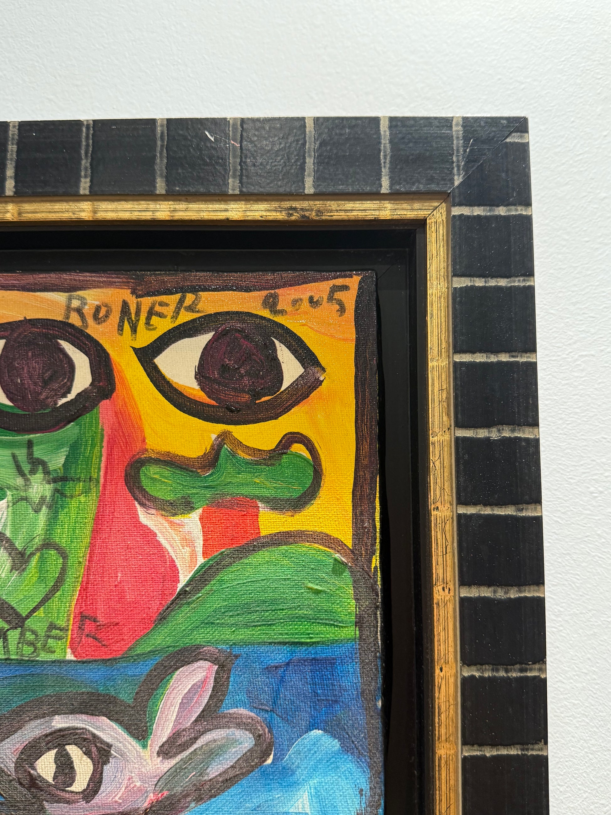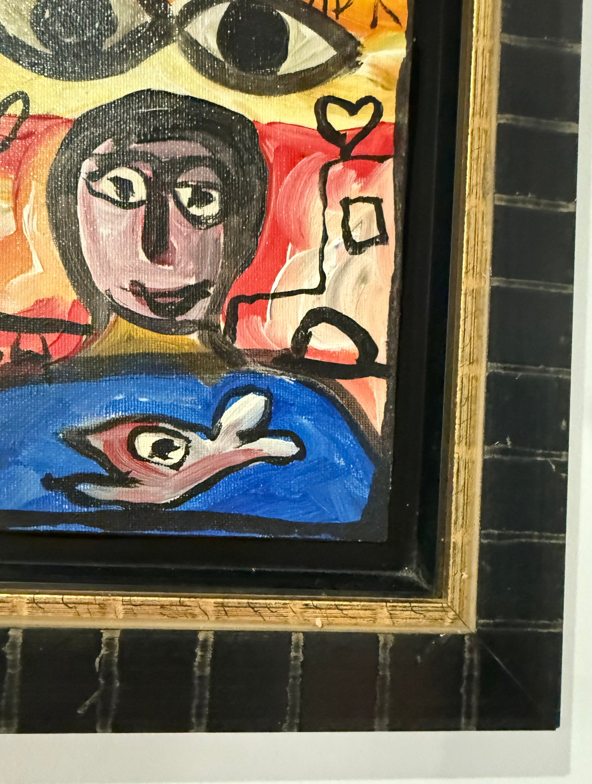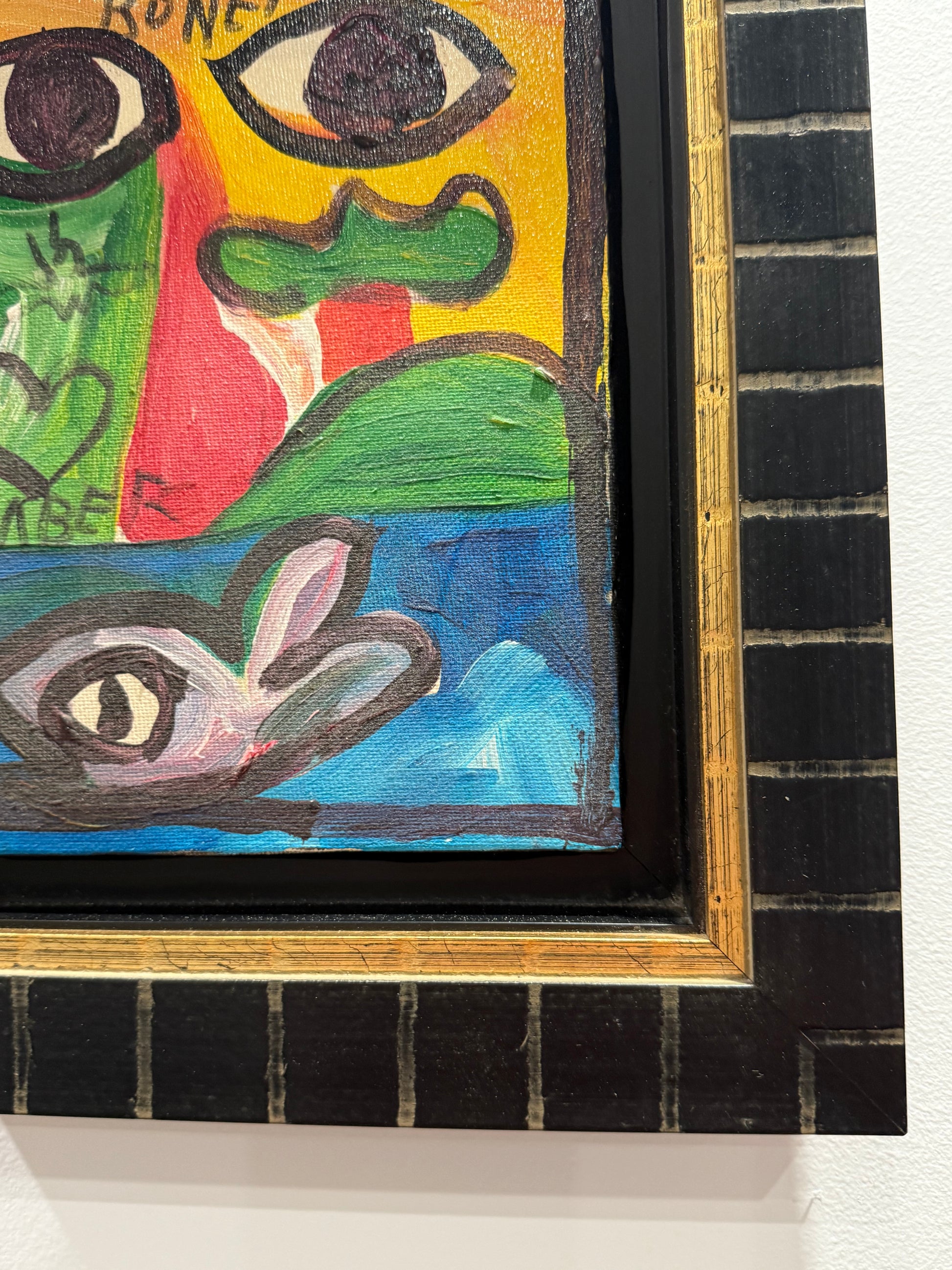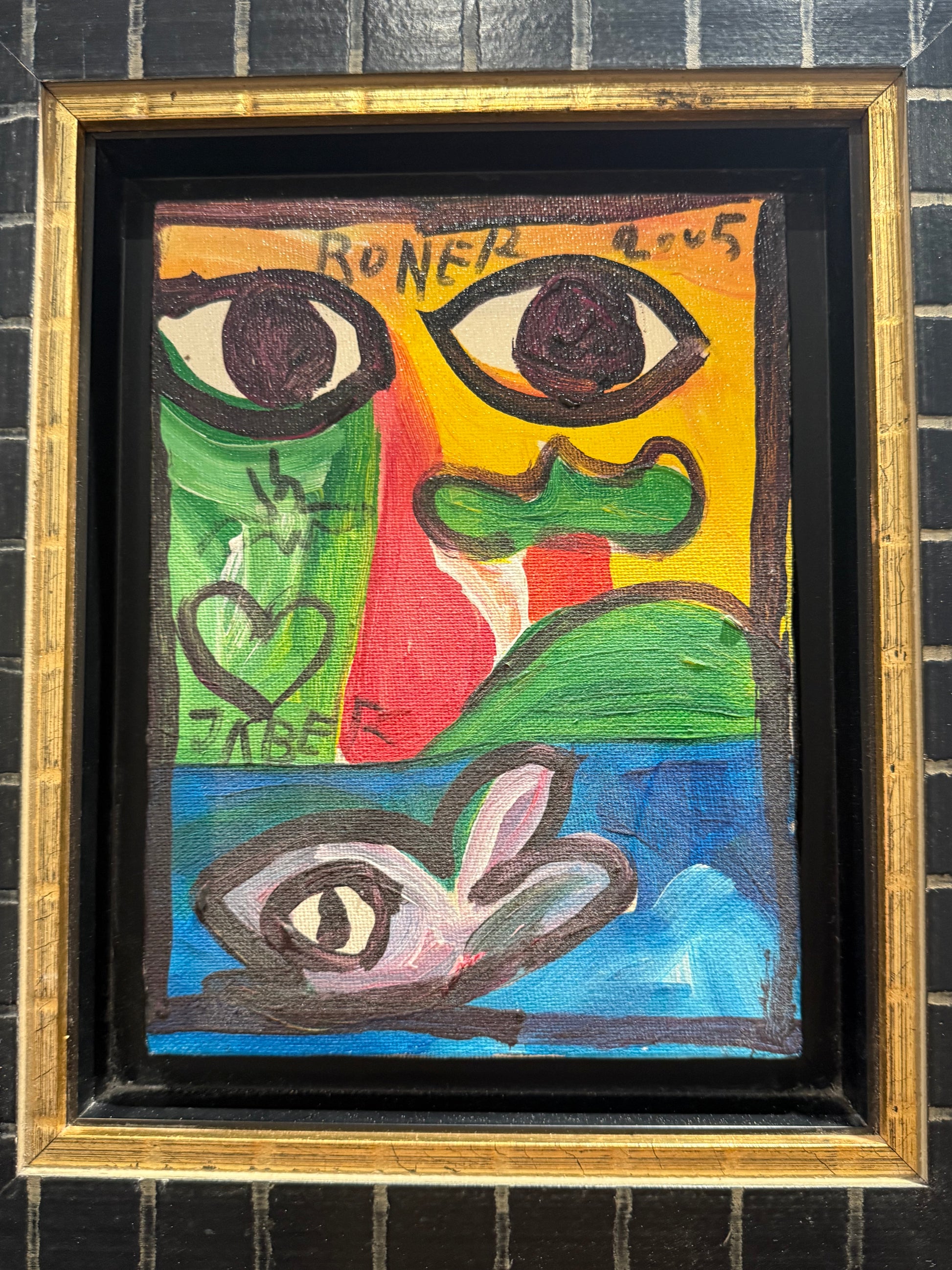 Ce triptyque haut en couleur signé Jaber, artiste autodidacte au style brut et expressif, est un concentré d’énergie et de spontanéité. Chacune des toiles met en scène un visage stylisé aux grands yeux, regardant le spectateur avec intensité. On y retrouve des éléments récurrents chers à l’artiste : le poisson à l’œil humain, les symboles naïfs, les cœurs, les messages (“FLORIDA”, “ROMA”, etc.), qui inscrivent ses personnages dans un univers joyeux, enfantin, parfois mystique.